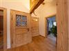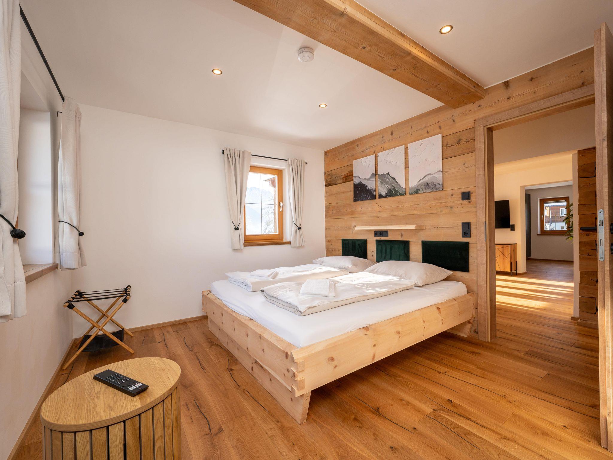 Charaktervolle Holzelemente schaffen eine warme Atmosphäre: Das Zirbendoppelbett sorgt für erholsamen Schlaf, und der handgefertigte Eichen-Esstisch lädt zu geselligen Momenten ein. Im Badezimmer setzt eine restaurierte Werkbank aus dem Jahr 1920 mit modernen Steinbecken einen besonderen Akzent.