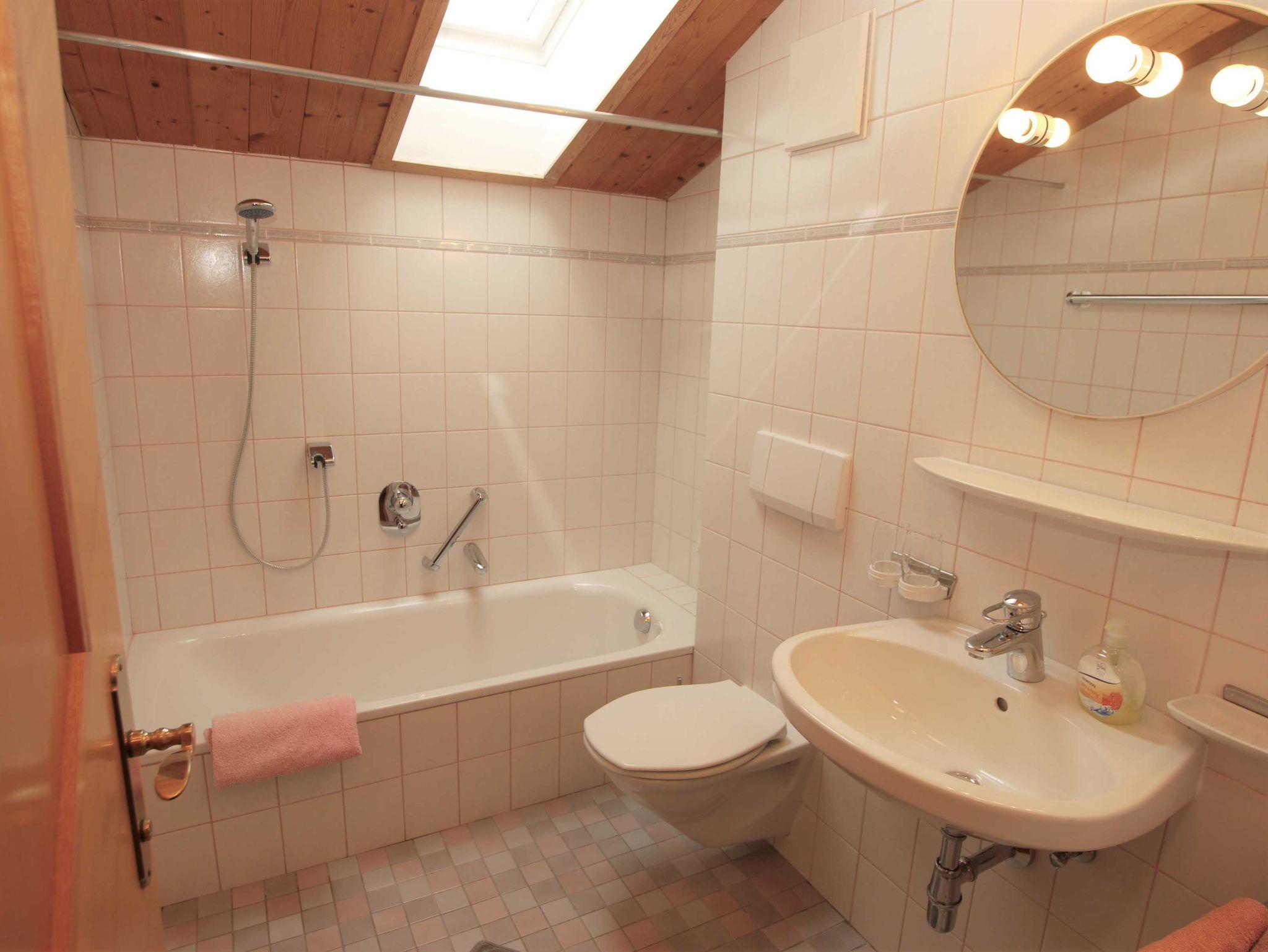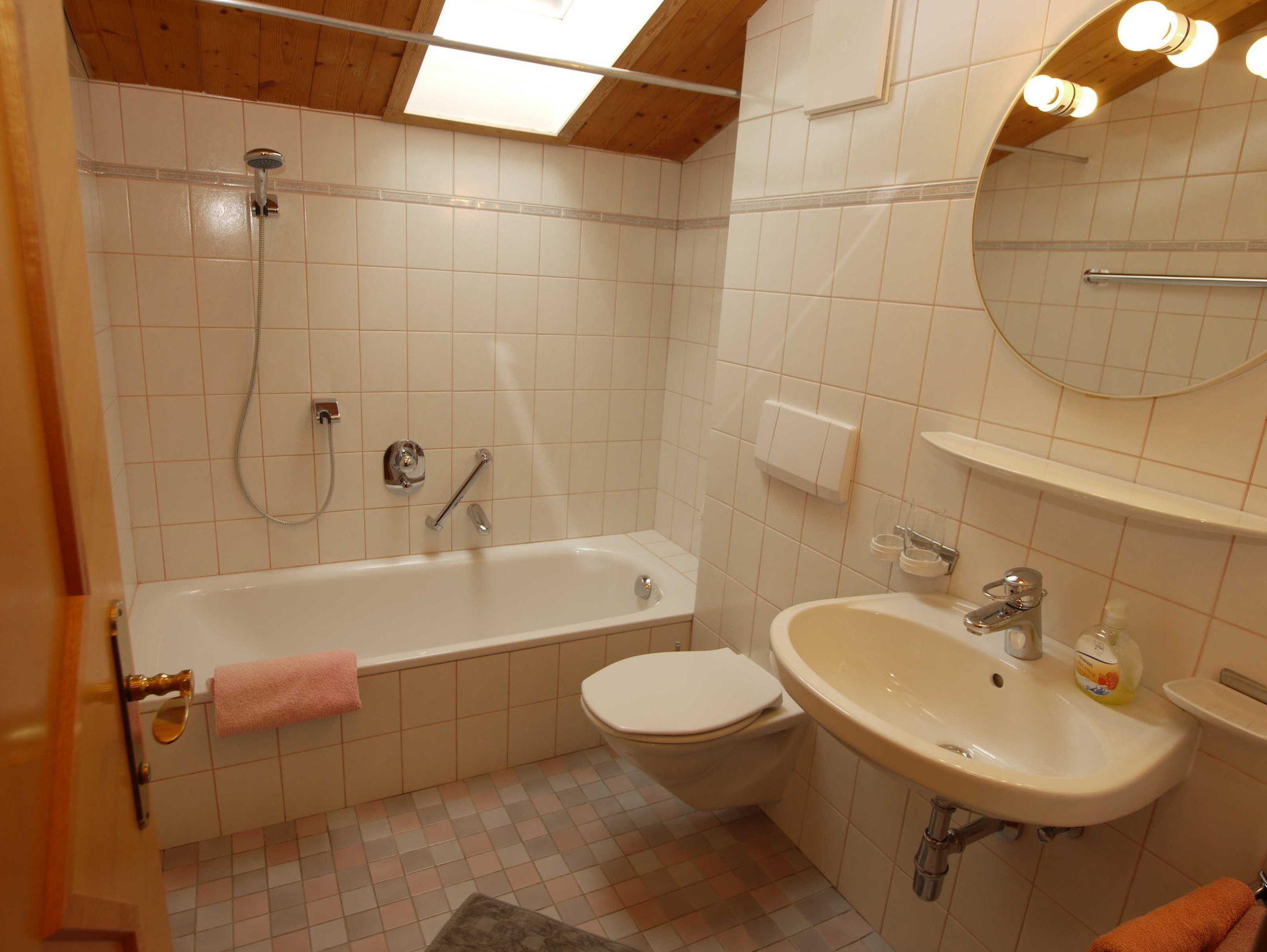 Badewanne mit Duschmöglichkeit, Föhn, regelmäßig gewechselte Hand- und Badetücher. Dachfenster