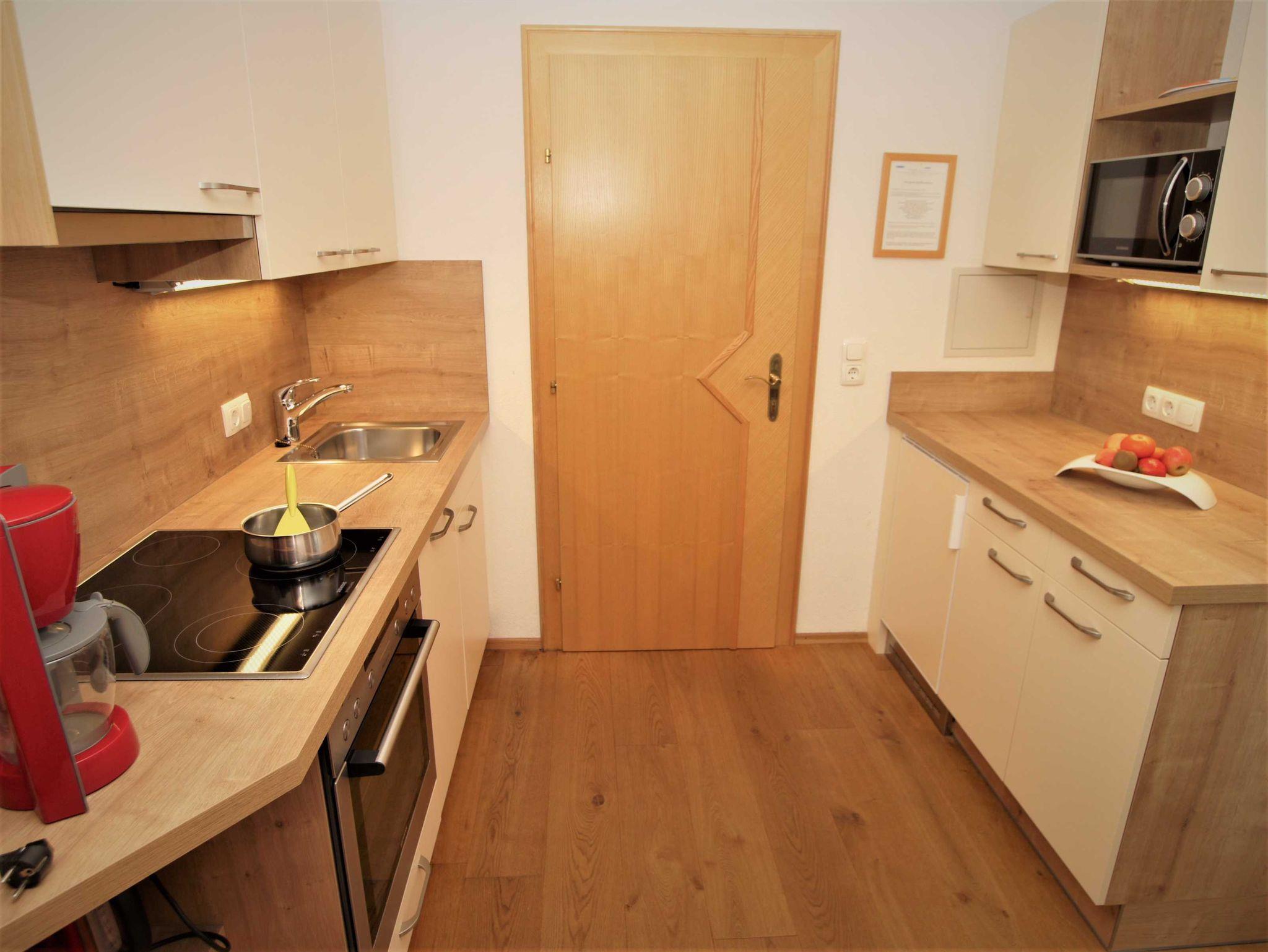 Wohnzimmer mit Tiroler Stube und gemütlicher Sitzgarnitur. Flachbildfernseher mit WLAN, WLAN, Radio und Safe. Neue Küche mit E-Herd mit Backrohr, Spülmaschine, Toaster, Kaffeemaschine, Wasserkocher und Mikrowelle.