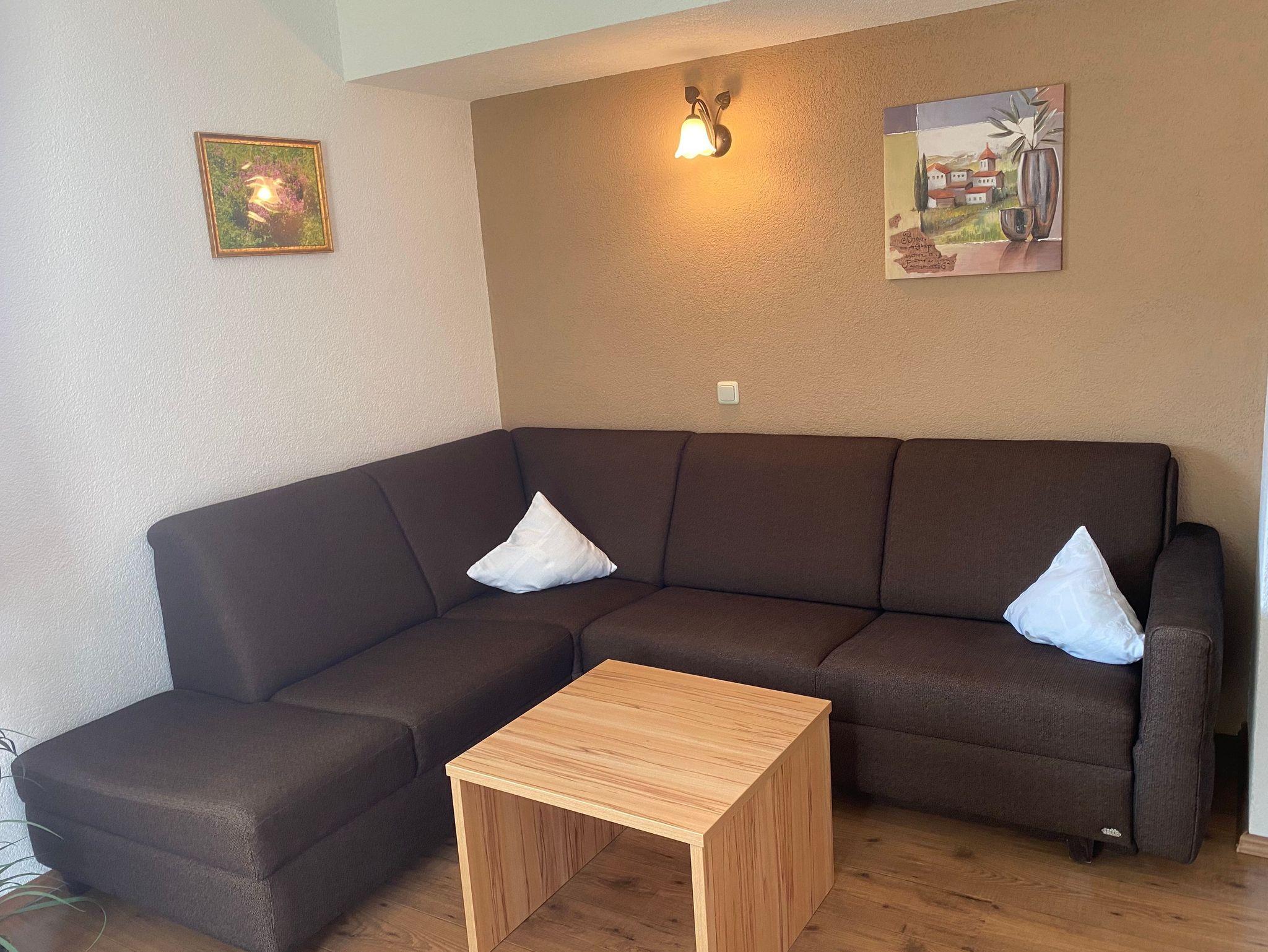 Ferienwohnung mit vollausgestatteter Küchenzeile, Kaffee- und Spülmaschine, Herd mit Backrohr sowie Kühlschrank mit Gefrierfach, Wohnraum mit Doppelcouch (ausziehbar), Schlafraum, Süd-Balkon, Flachbildfernseher, Safe, Föhn, W-LAN (kostenpflichtig)