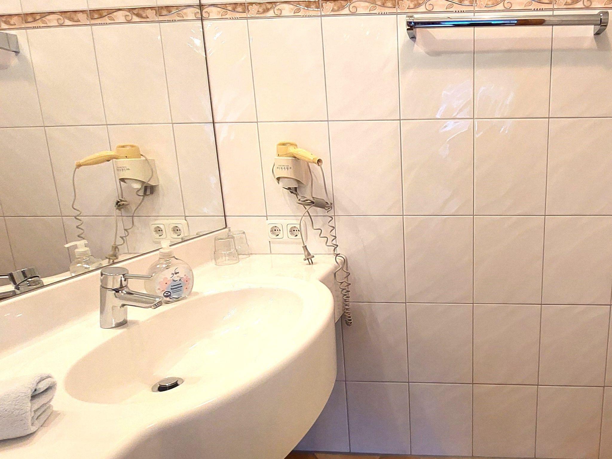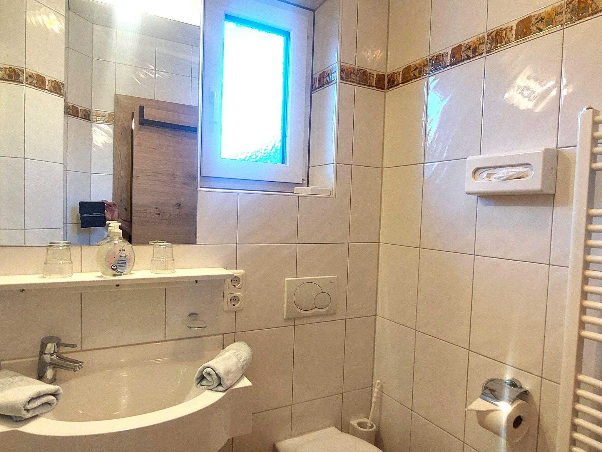 Badezimmer mit Massagedusche, WC, Fön
