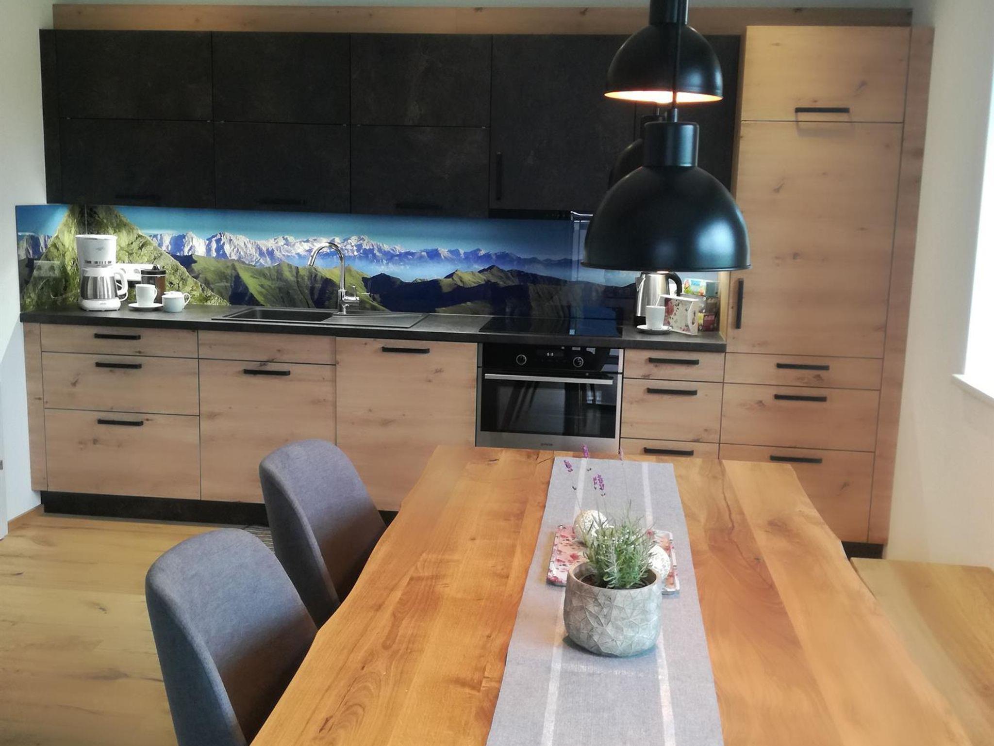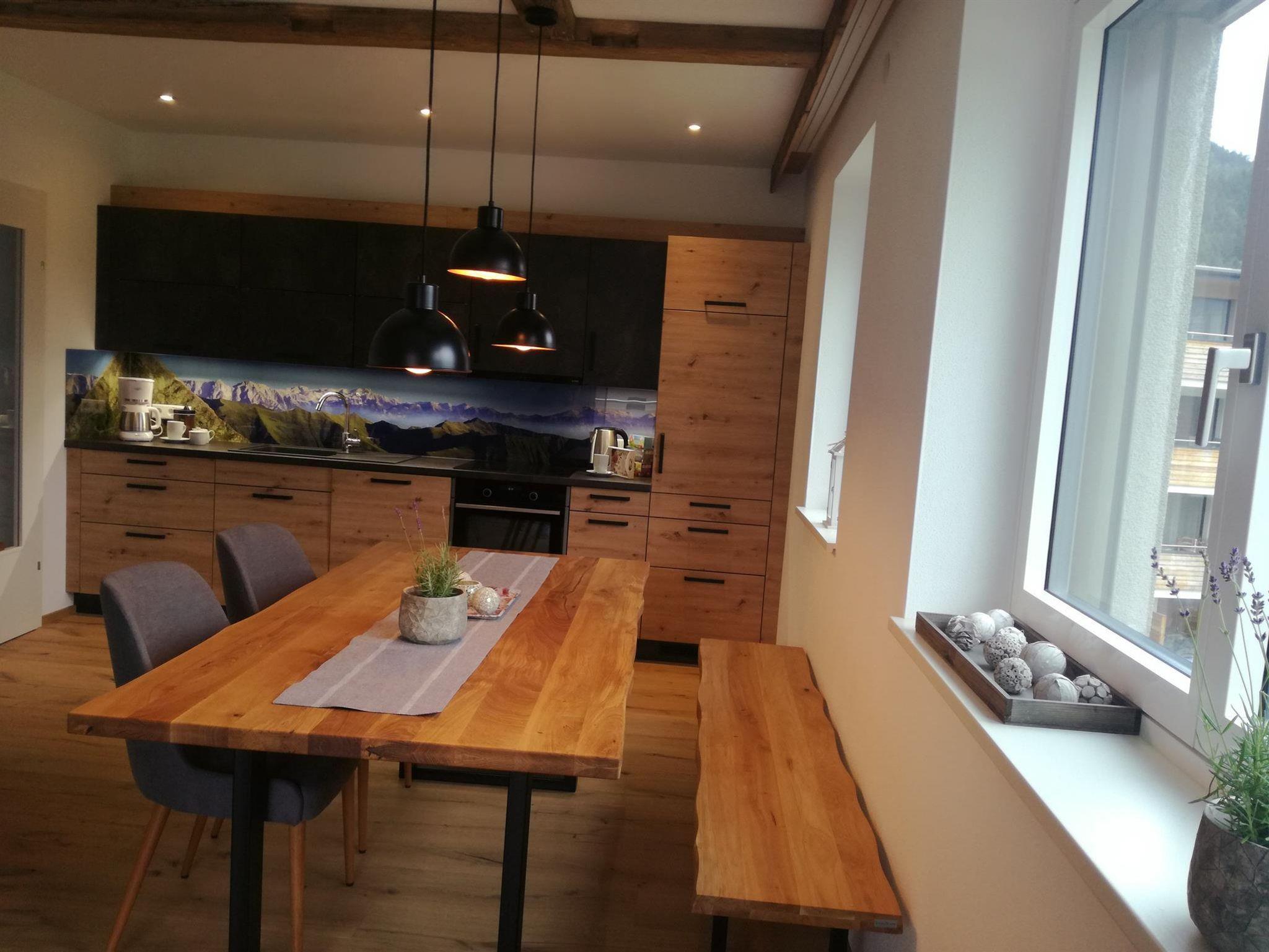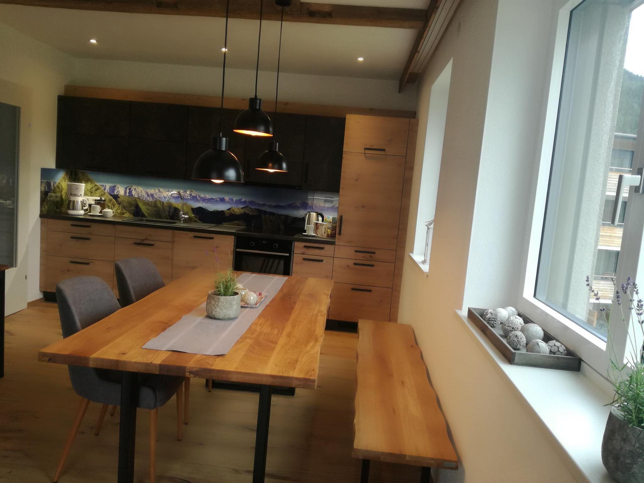 Unsere neue Ferienwohnung ist ca. 75 m² groß und mit Naturholz ausgestattet. Sie besitzt eine große Wohnküche, 2 geräumige Schlafzimmer, ein Badezimmer, ein WC, ein Kellerabteil für Schiablage, Carport u. eine Sonnenterrasse. Die Unterkunft liegt im 2 Stock u. ist bequem mit dem Lift zu erreichen. Die Küche lässt keine Wünsche offen. Vom Geschirrspüler über Backofen, Mikro, Toaster, Kühlschrank ist alles vorhanden. Koch u. Eßgeschirr für 6 Personen ist da. 2 Schlafzimmer sind mit 180x200 cm großen Boxspringbetten ausgestattet u. sorgen für guten Schlaf. Die Couch im Wohnzimmer kann zu einem Doppelbett ausgezogen werden. Im Badezimmer ist genügend Platz für zwei Waschbecken.