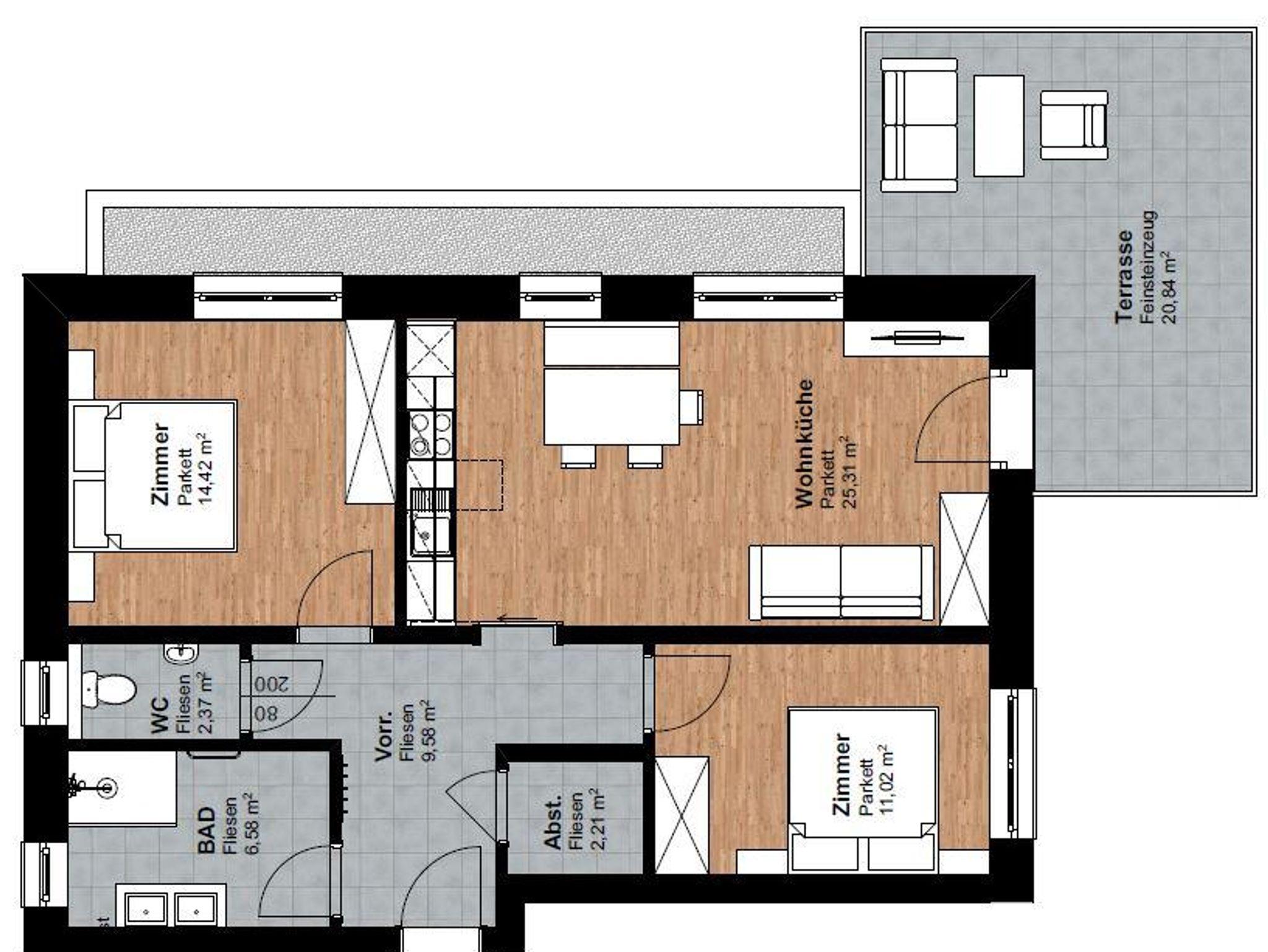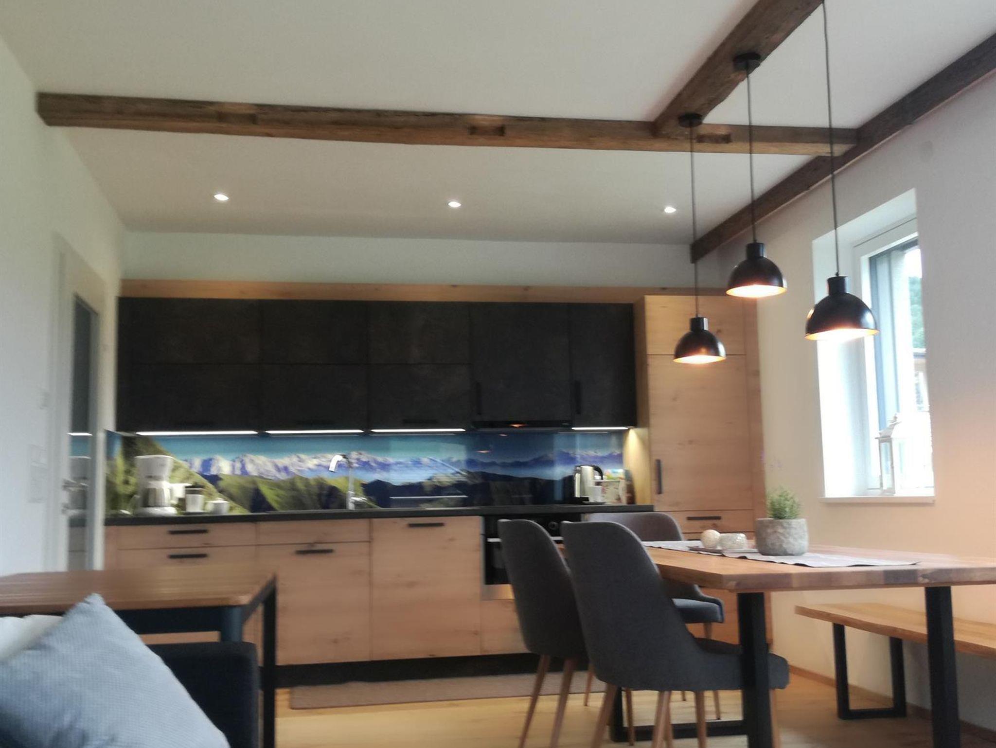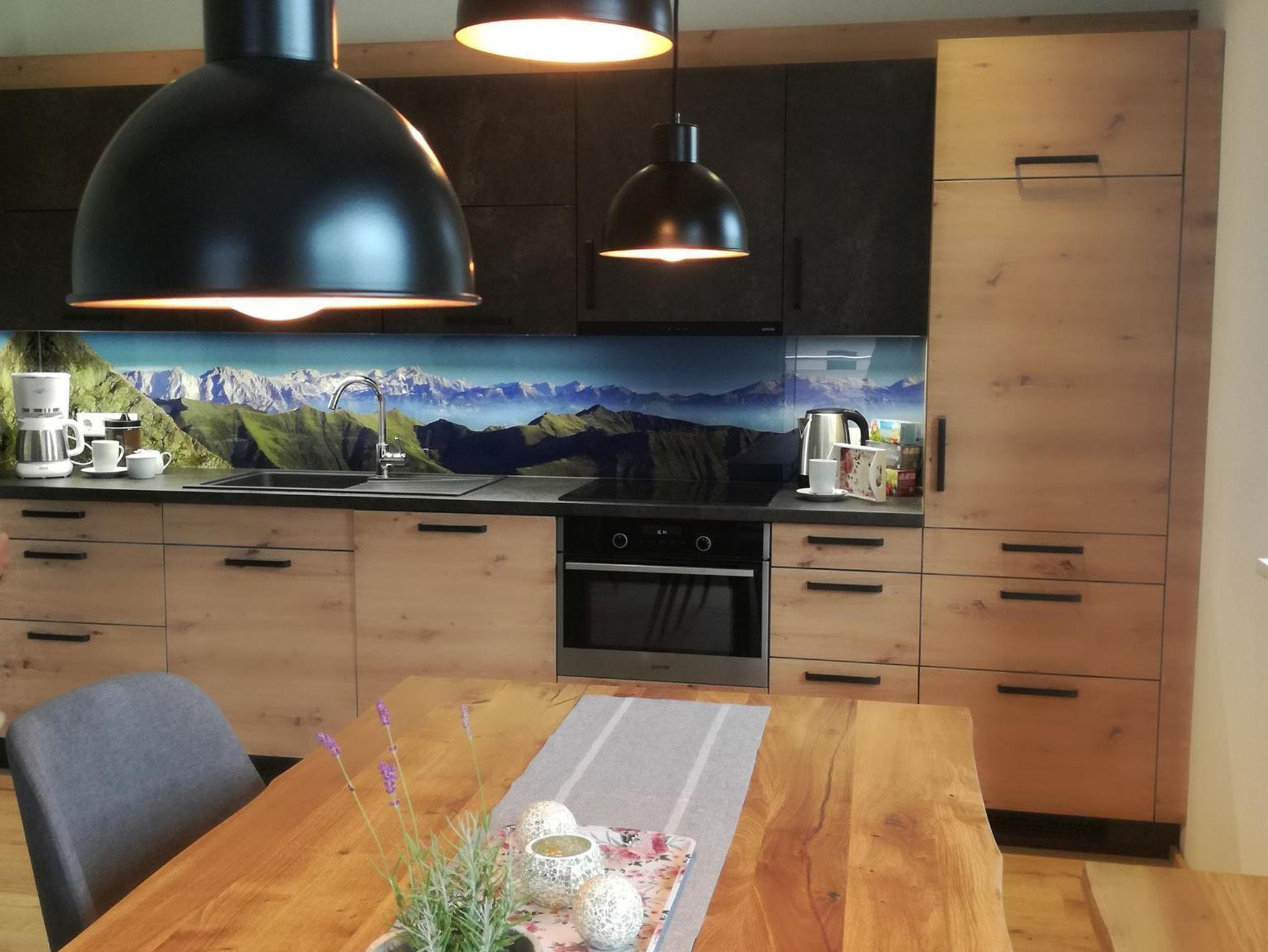 Unsere neue Ferienwohnung ist ca. 75 m² groß und mit Naturholz ausgestattet. Sie besitzt eine große Wohnküche, 2 geräumige Schlafzimmer, ein Badezimmer, ein WC, ein Kellerabteil für Schiablage, Carport u. eine Sonnenterrasse. Die Unterkunft liegt im 2 Stock u. ist bequem mit dem Lift zu erreichen. Die Küche lässt keine Wünsche offen. Vom Geschirrspüler über Backofen, Mikro, Toaster, Kühlschrank ist alles vorhanden. Koch u. Eßgeschirr für 6 Personen ist da. 2 Schlafzimmer sind mit 180x200 cm großen Boxspringbetten ausgestattet u. sorgen für guten Schlaf. Die Couch im Wohnzimmer kann zu einem Doppelbett ausgezogen werden. Im Badezimmer ist genügend Platz für zwei Waschbecken.
