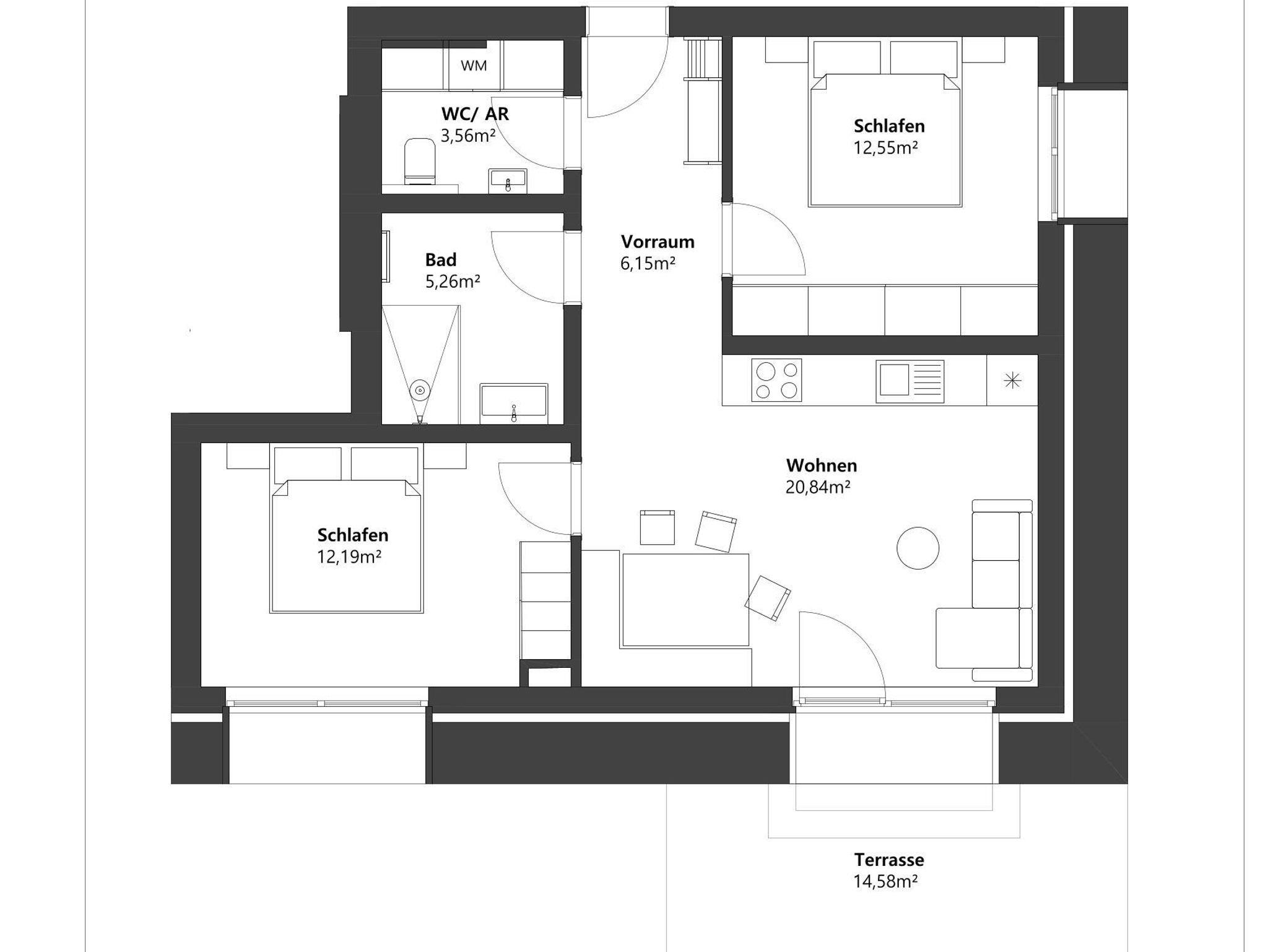 Das Apartment Josef bietet zwei komfortable Schlafzimmer, ein modernes Bad, ein separates WC sowie einen einladenden Wohnbereich. Mit Platz bis zu 6 Personen eignet es sich ideal für Familien oder kleine Gruppen, die Wert auf ausreichend Raum und gemütliches Wohnen legen.