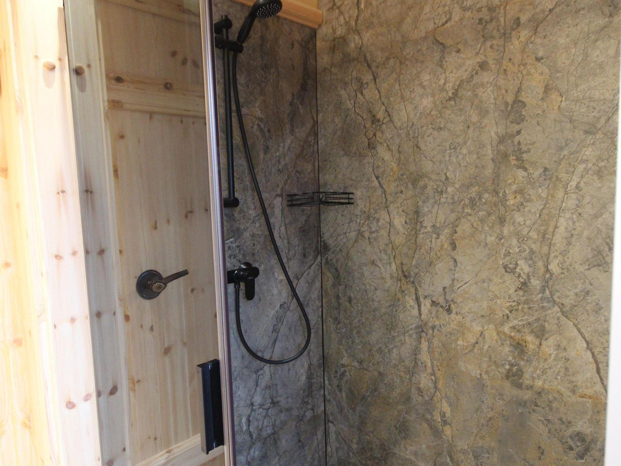 • Ein geräumiges Badezimmer mit Dusche und Waschtisch