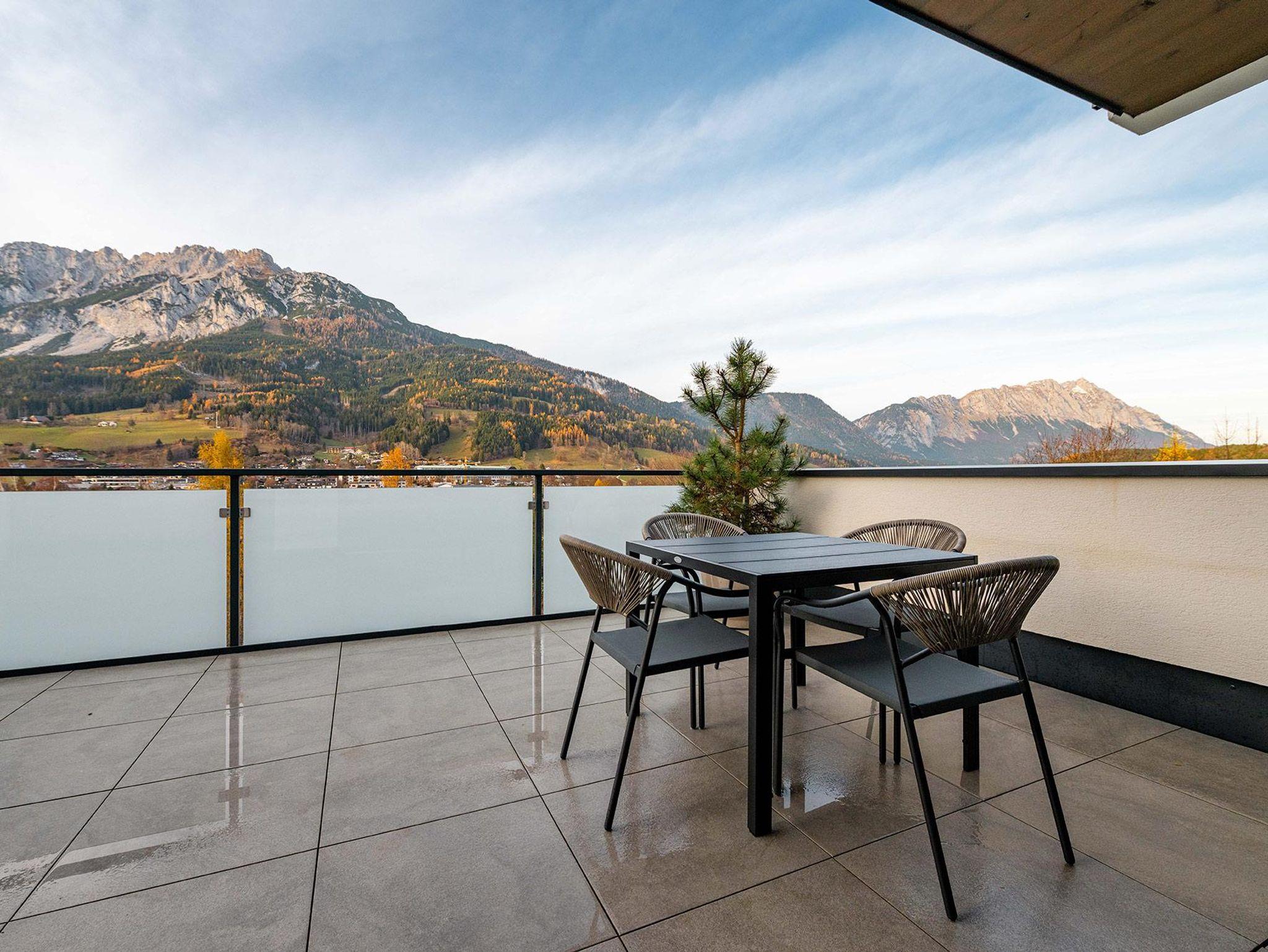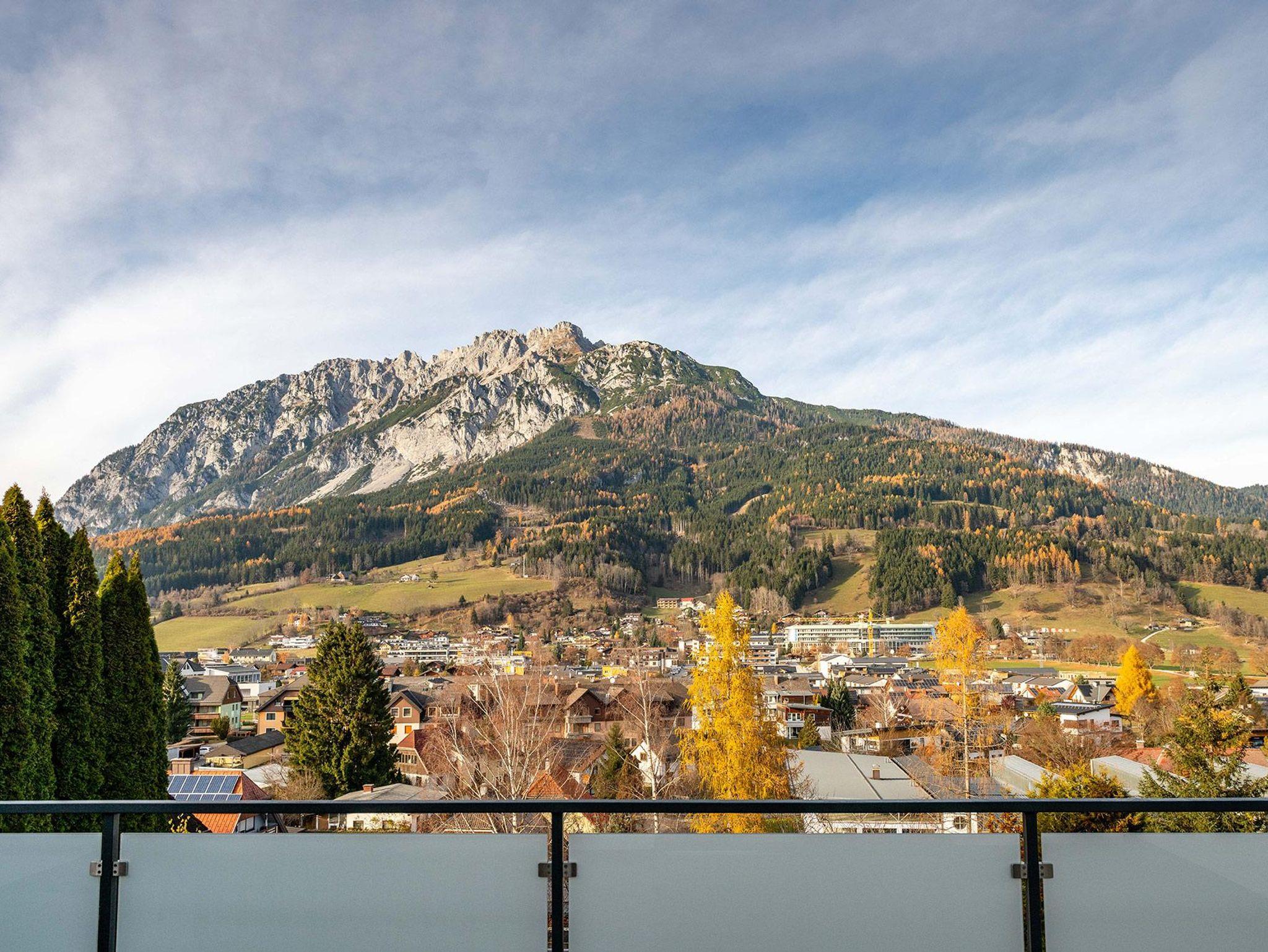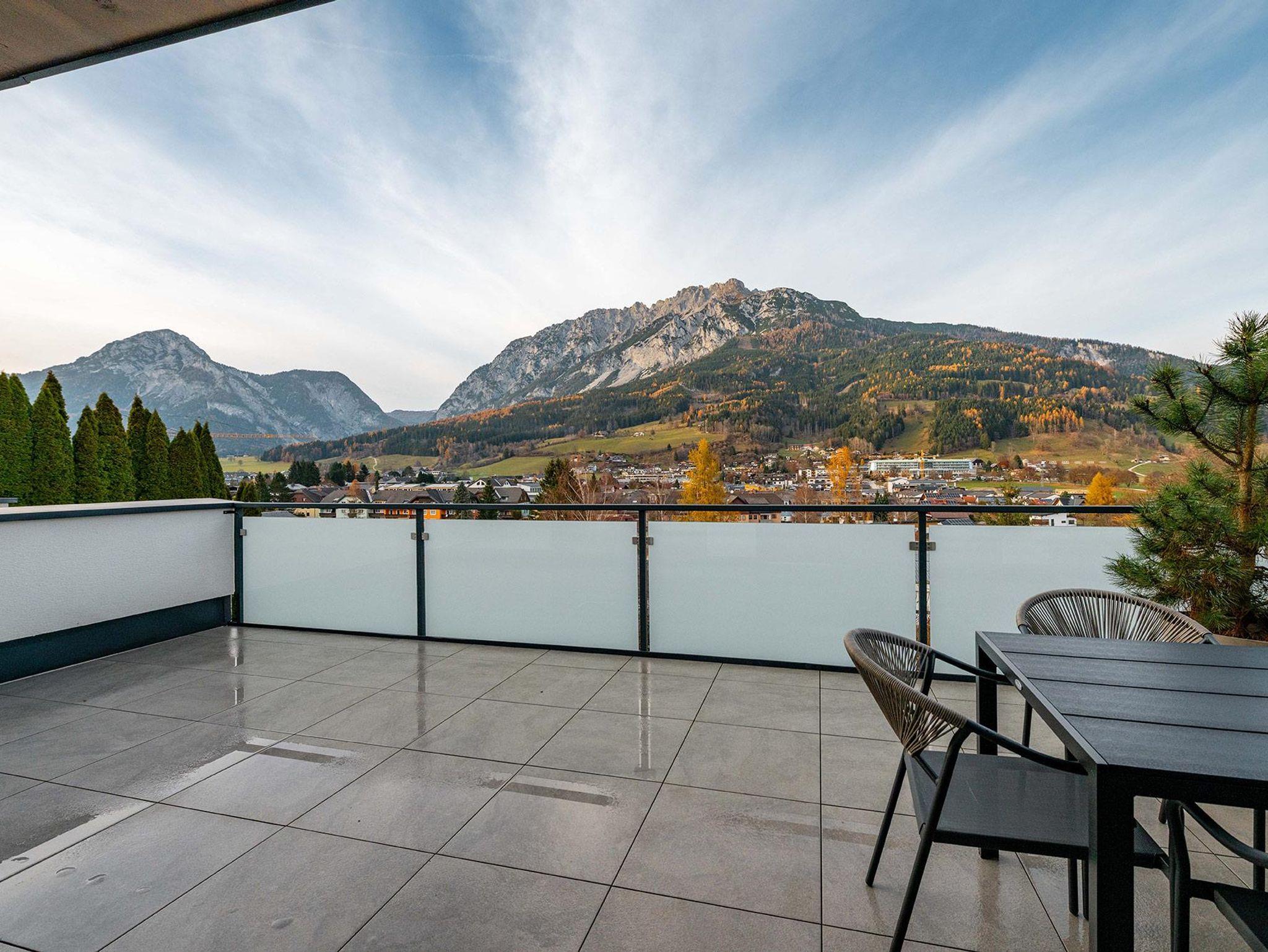 Ein besonderes Highlight ist die großzügige Terrasse, von der aus Sie einen beeindruckenden Blick über Gröbming und die umliegenden Berggipfel genießen: Stoderzinken, Kammspitze und Grimming.