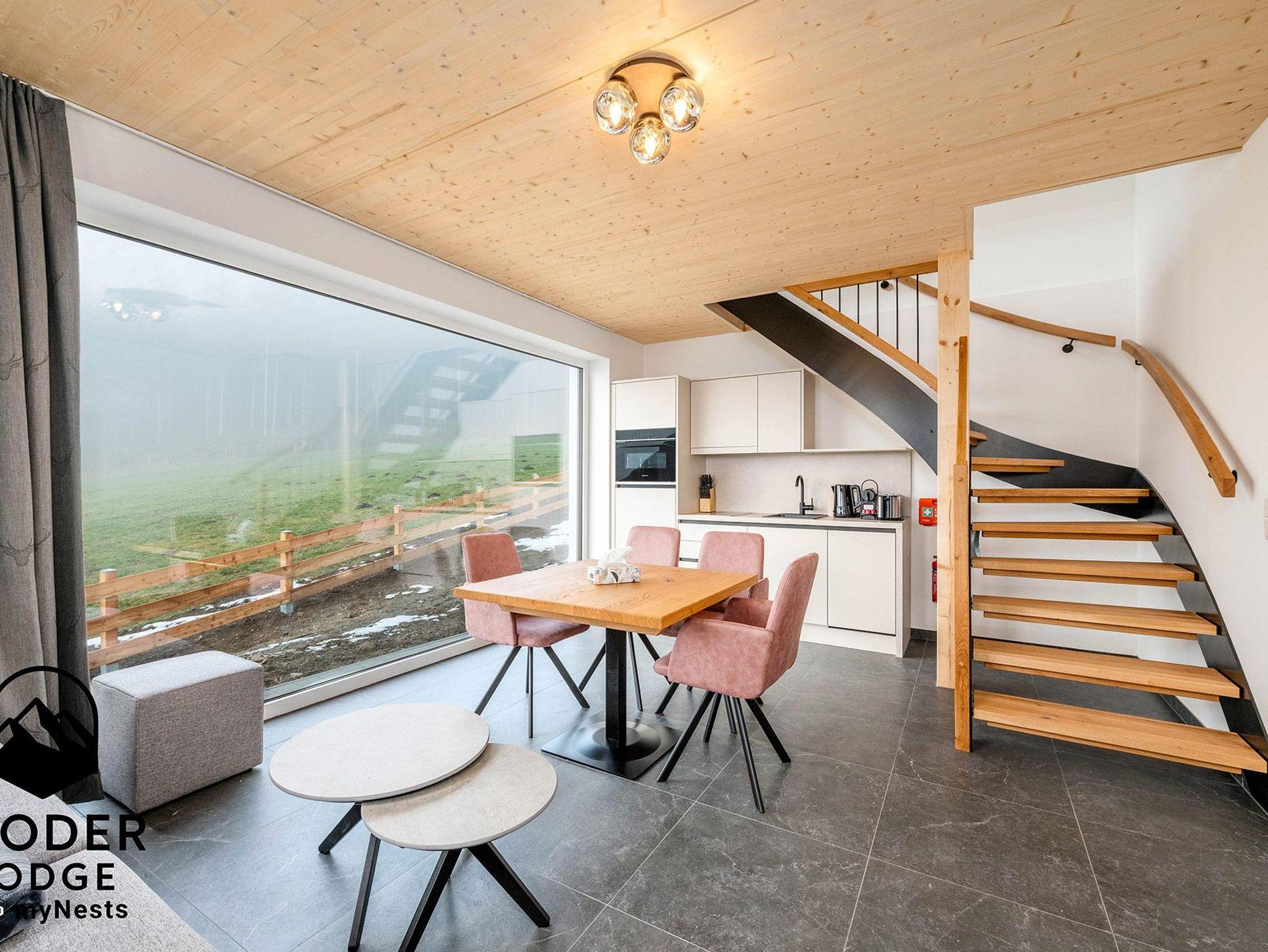 Ein komfortables 180-cm-Doppelbett sowie ein hochwertiges Schlafsofa sorgen für erholsame Nächte. Zwei große Panoramafenster machen dieses Apartment zu etwas ganz Besonderem: Schon beim Aufwachen eröffnet sich der Blick auf Berge und Wald – und sonst nichts. Auch im Wohn- und Essbereich begleitet Sie diese außergewöhnliche Naturkulisse den ganzen Tag.