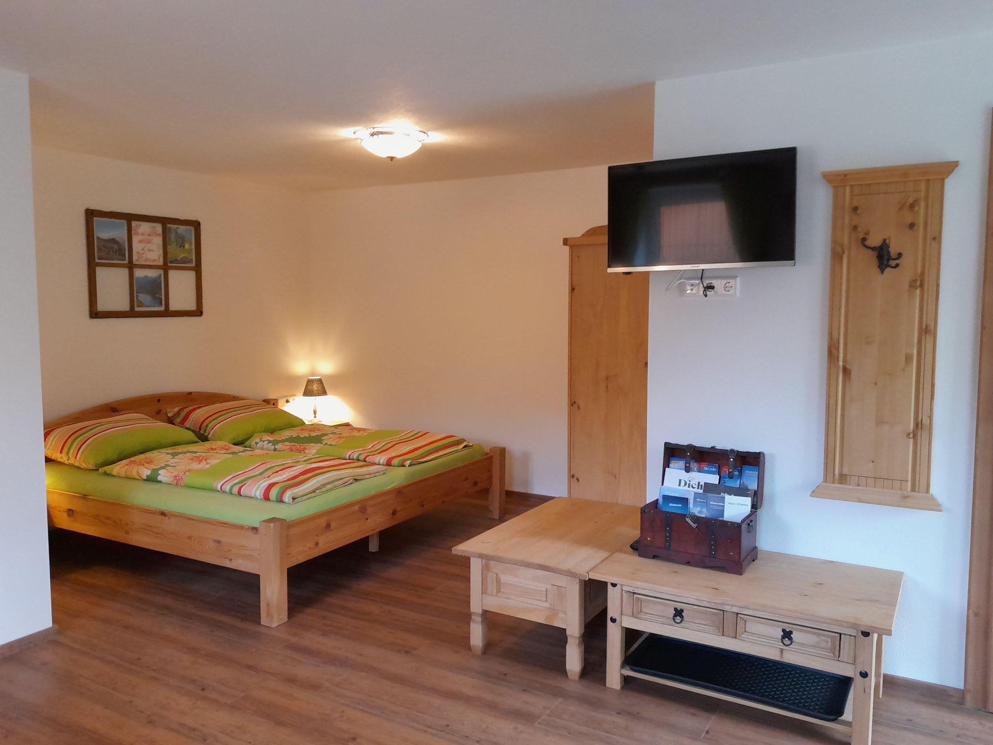 Das Doppelzimmer (23m²) ist mit einem 1,60 m x 2,00 m großem Bett und einem Badezimmer mit Wc und Dusche ausgestattet . Es gibt ein Sideboard mit einem Wasserkocher, etwas Geschirr und Besteck.