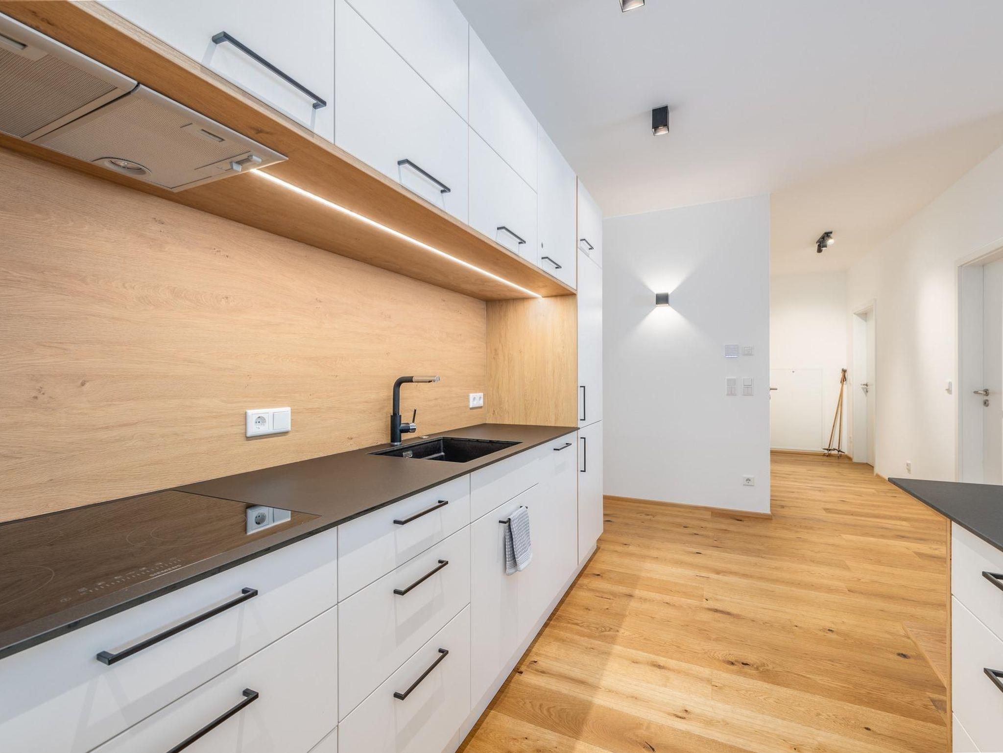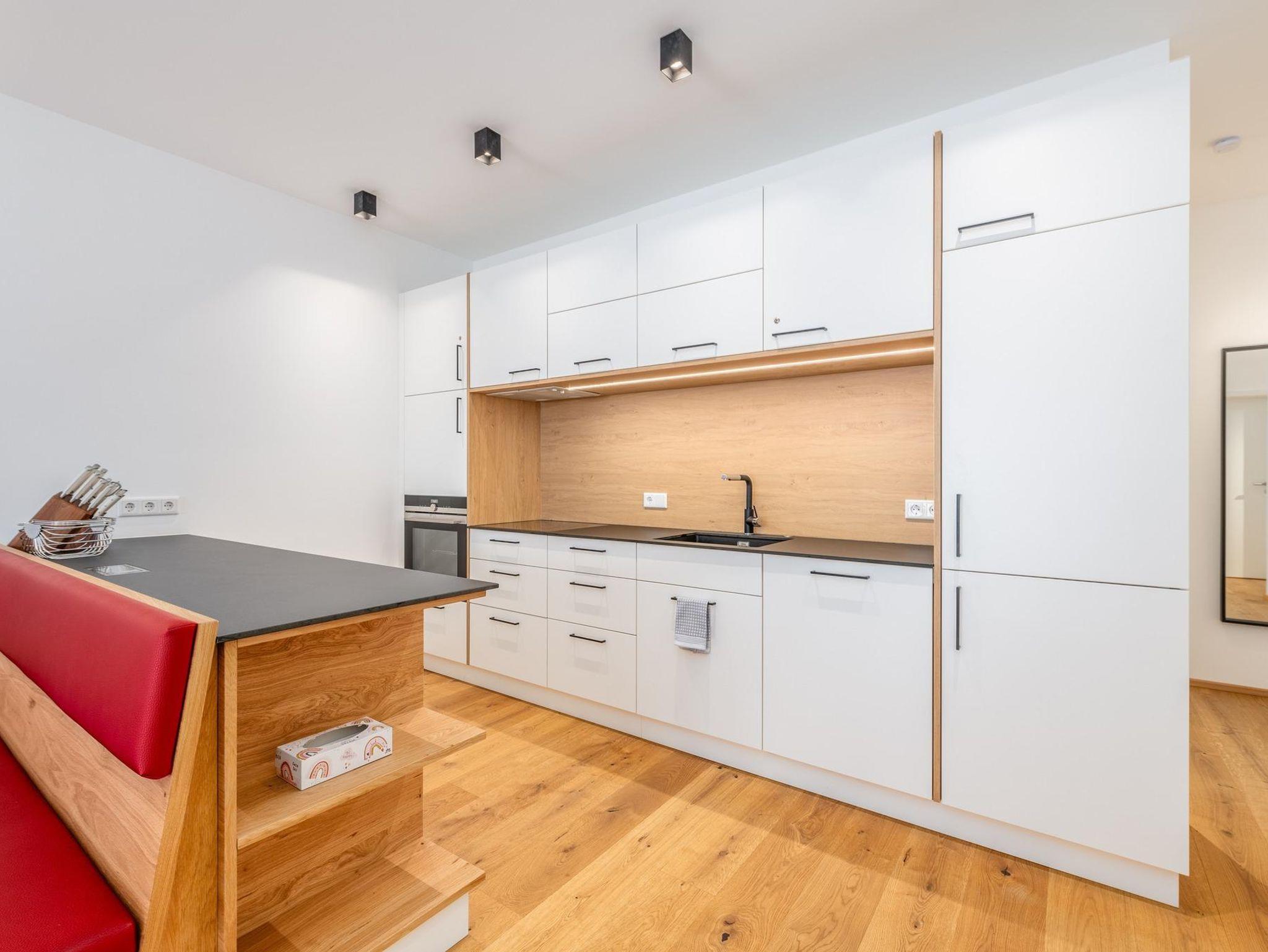 Neben einer voll ausgestatteten Küche gibt es in dieser neuen Ferienwohnung 2 SZ mit je einem Doppelbett. Zusätzlich gibt es im Wohnzimmer eine Schlafcouch für 2 weitere Personen.