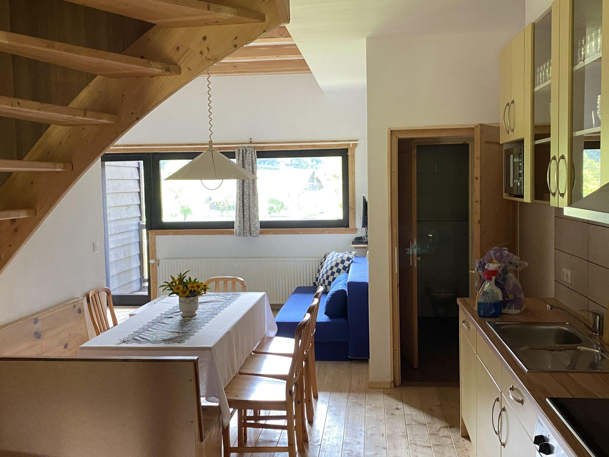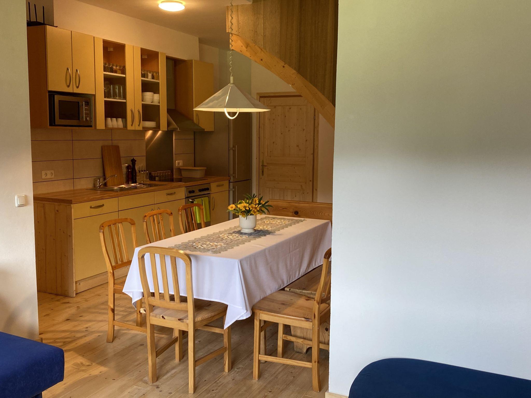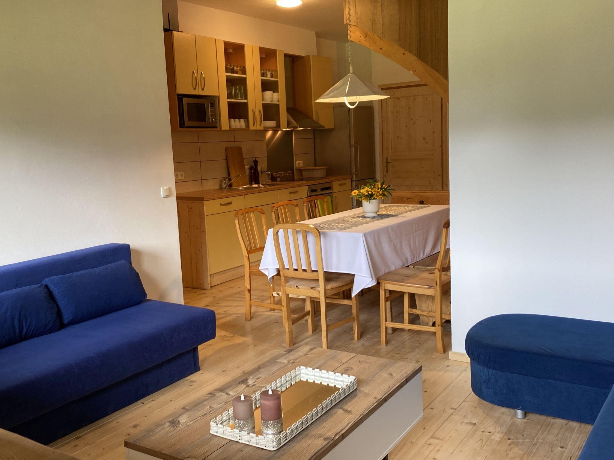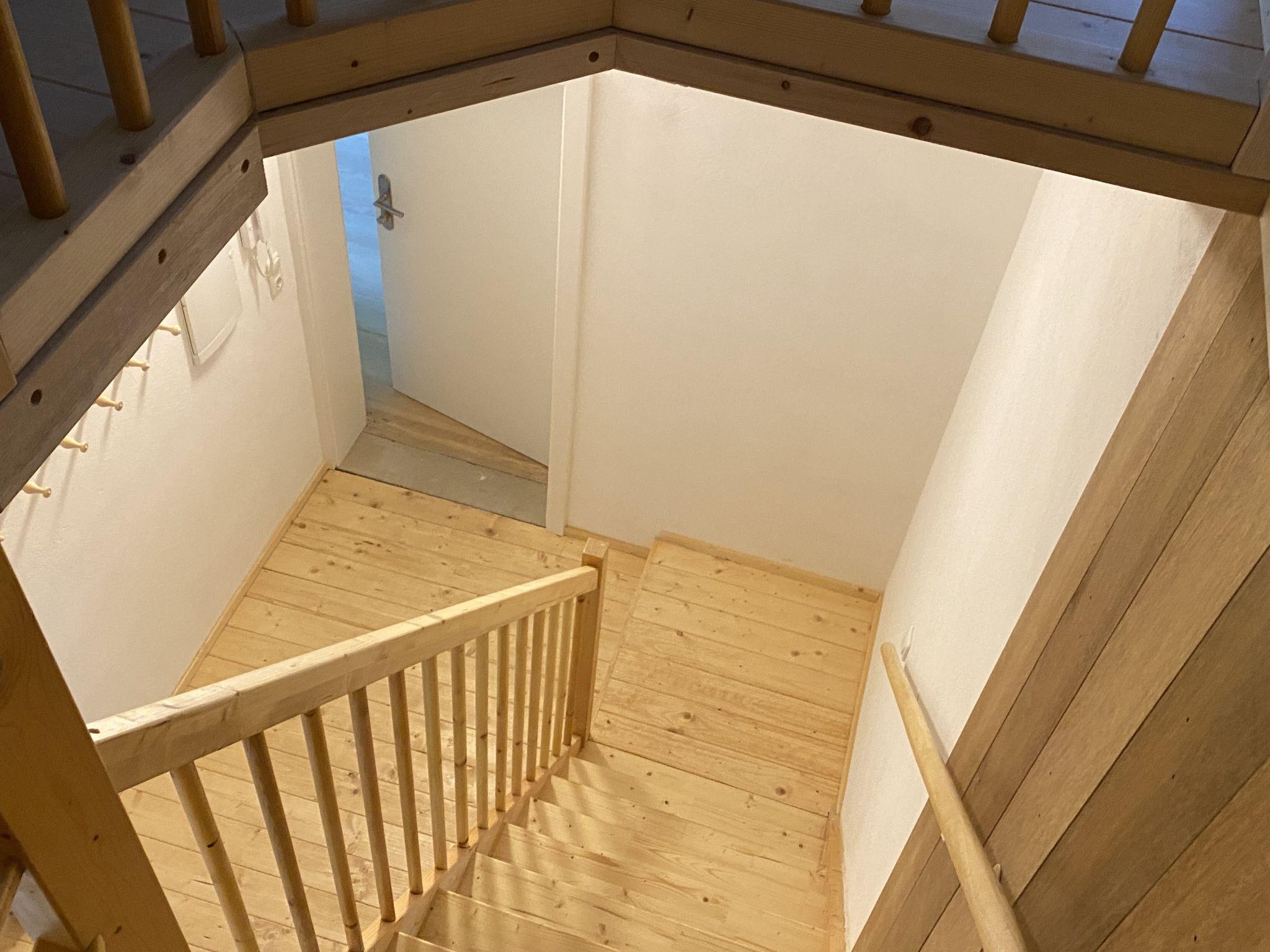 "Hasenstall / Top 8", 5-room apartment 79 m2 on 2 levels on 2nd floor. Object suitable for 8 adults + 1 child. Partly with sloping ceilings, fully renovated in 2023, very tasteful and wooden furniture furnishings: entrance hall. Open large living/dining room. 1 double bedroom with 1 double sofabed. 1 double bedroom with 1 x 2 bunk beds. Open kitchen (oven, dishwasher, toaster, kettle, electric coffee machine). 2 Baths/showers/WC. Upper floor: 1 double bedroom with 1 double bed. 1 double bedroom with 2 beds. Parquet floors. Small balcony 6 m2. Very beautiful panoramic view of the mountains. Facilities: washing machine, iron. Internet (WiFi, free). Please note: suitable for families. Private entrance, smoke alarm, fire extinguisher, no lift.