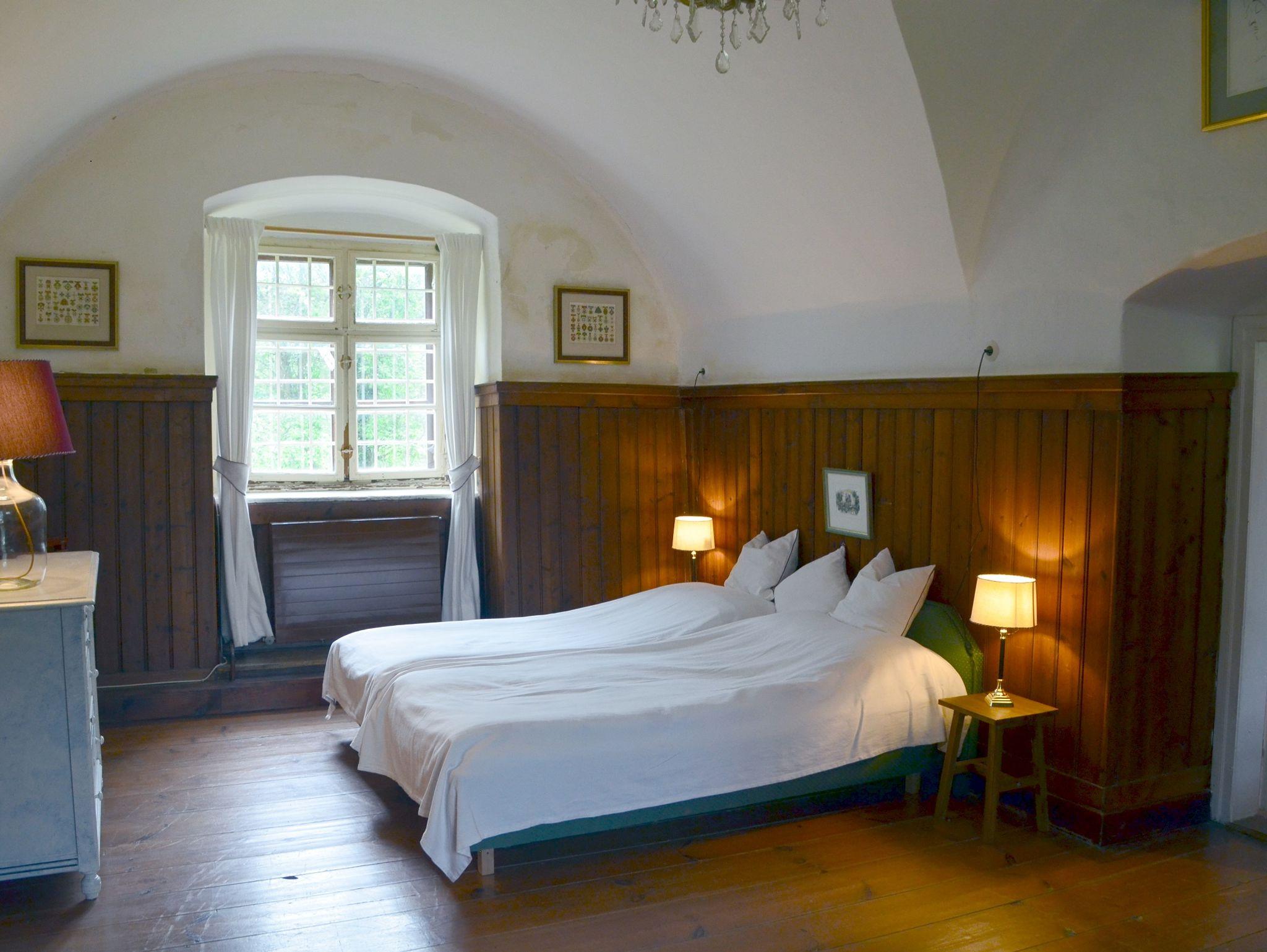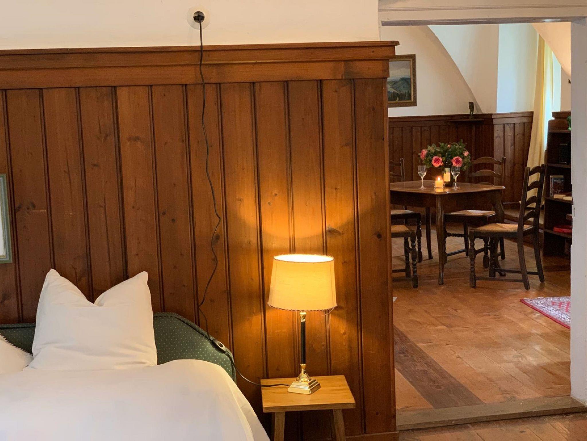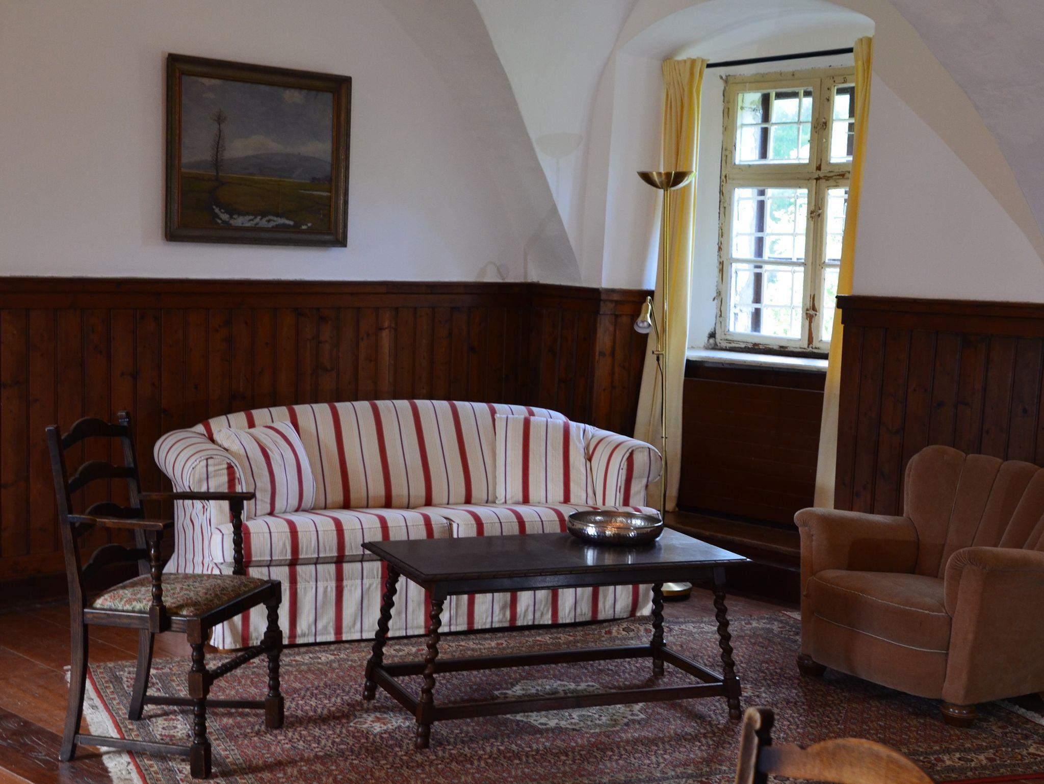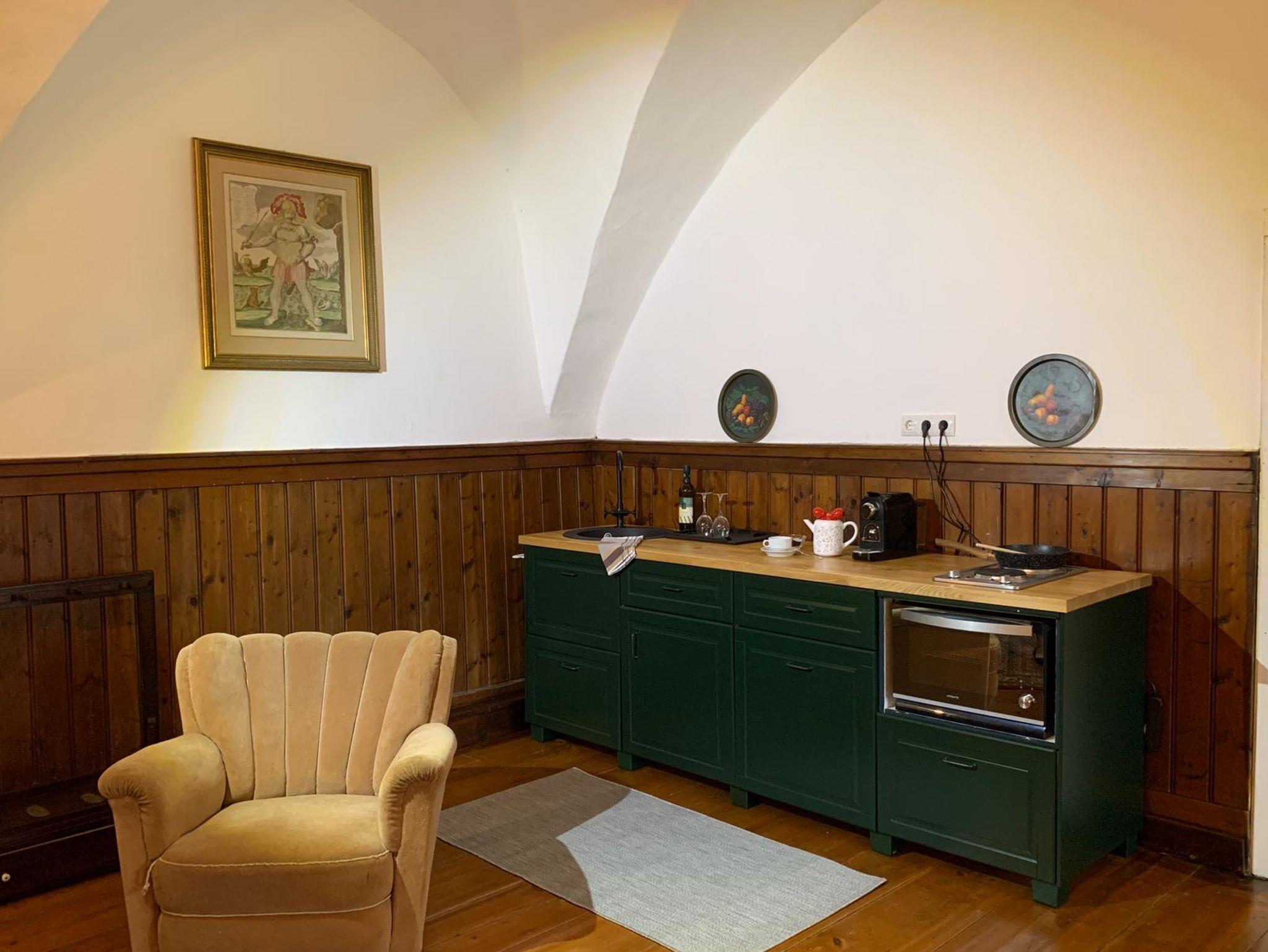 Die ehemalige Wohnung unseres Burgvogts und Richter, bietet Platz für zwei Person, ein elegantes Wohnzimmer mit Küchenzeile lädt zu erholsamen Tagen ein! Die großzügigen gewölbten Räume bieten ein gemütliches Flair. Fenster nach beiden Seiten öffnen den Blick in die Gärten und auf das Schloss.