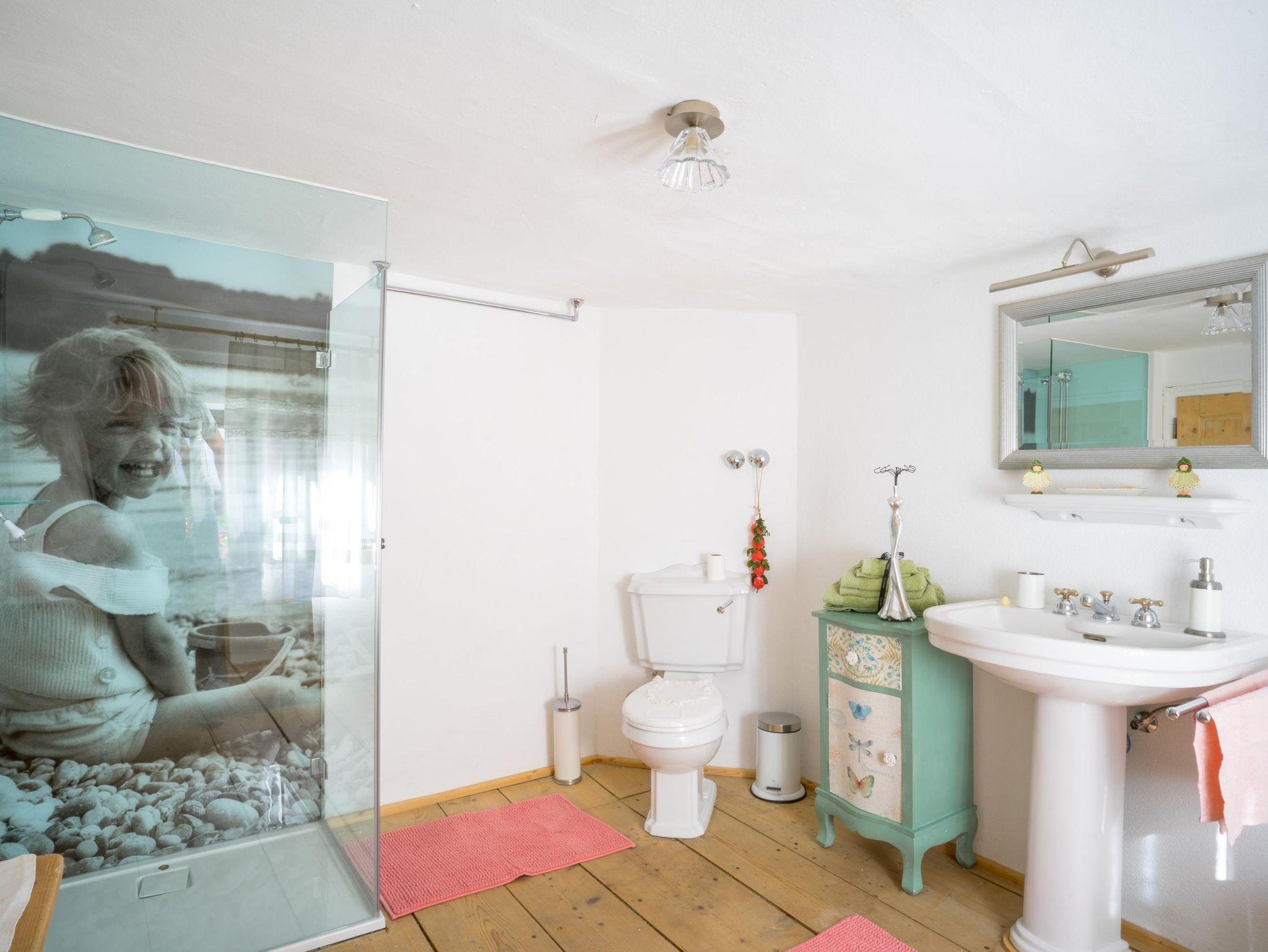 Dieses sehr helle Zimmer mit dem extra großen Bad mit Dusche gegenüber gehörte unserer Katharina. Sie ist in der Duschrückwand verewigt. Neben dem großen Doppelbett gibt es noch ein Schlafsofa, wo eine dritte Person nächtigen kann. Das Bad und das Zimmer sind über einen kurzen Gang verbunden, der durch eine Tür zum restlichen Haus abgeteilt ist. Die Ausstattung ist ebenfalls sehr modern mit komfortablen Bett, Flatscreen, Espressomaschine und Kühlschrank.