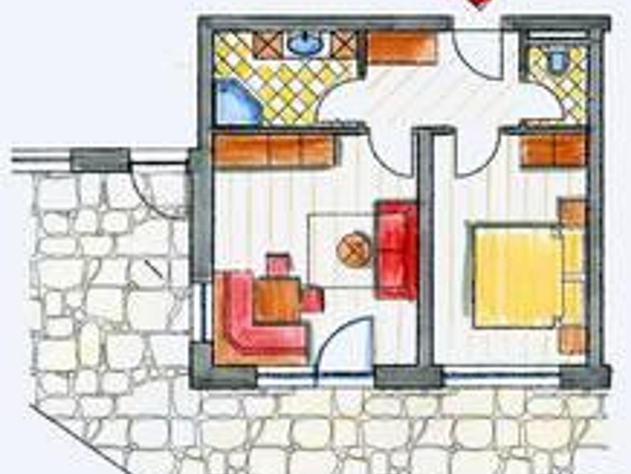 Appartement Morgenstern: großzügige Wohn-Schlafküche, 1 Doppelzimmer, Wohnküche mit ausziehbarer Doppelcouch, Vorraum m. Garderobe, Bad und WC getrennt, Aussichtsterrasse
