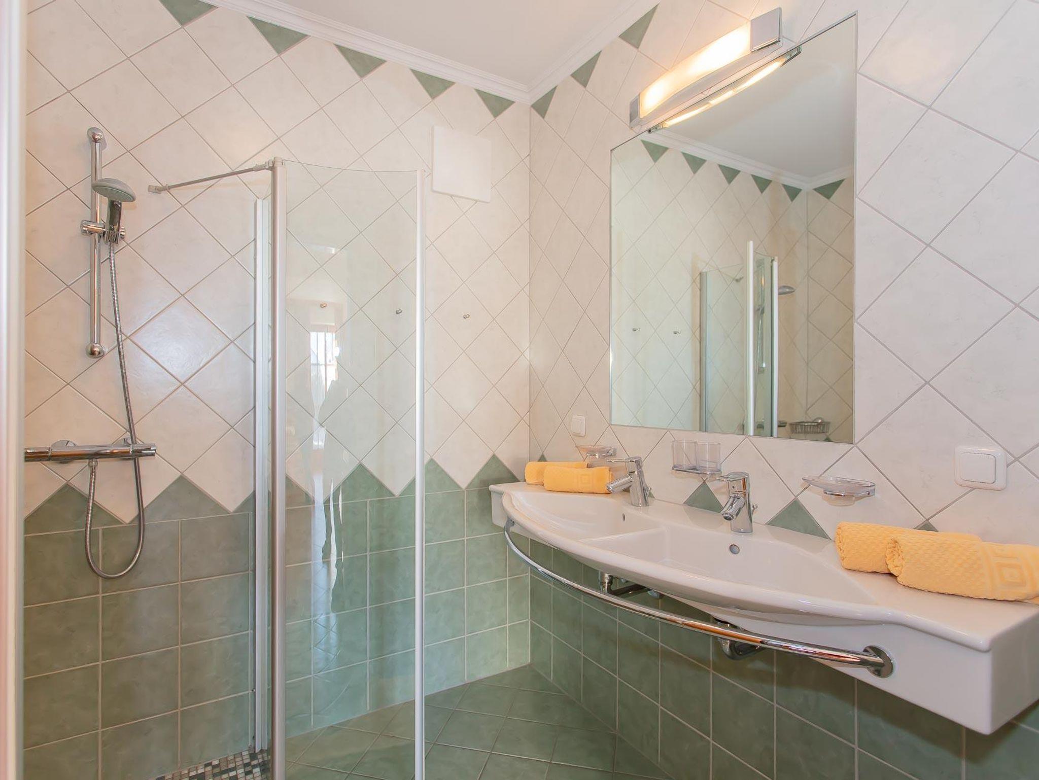 Ferienwohnung für 2 - 4 Personen, rollstuhlgerecht, Wohnküche mit Essbereich und Ausziehcouch, separates Schlafzimmer mit Doppelbett, Du und Wc getrennt, Parterrewohnung mit Garten.
