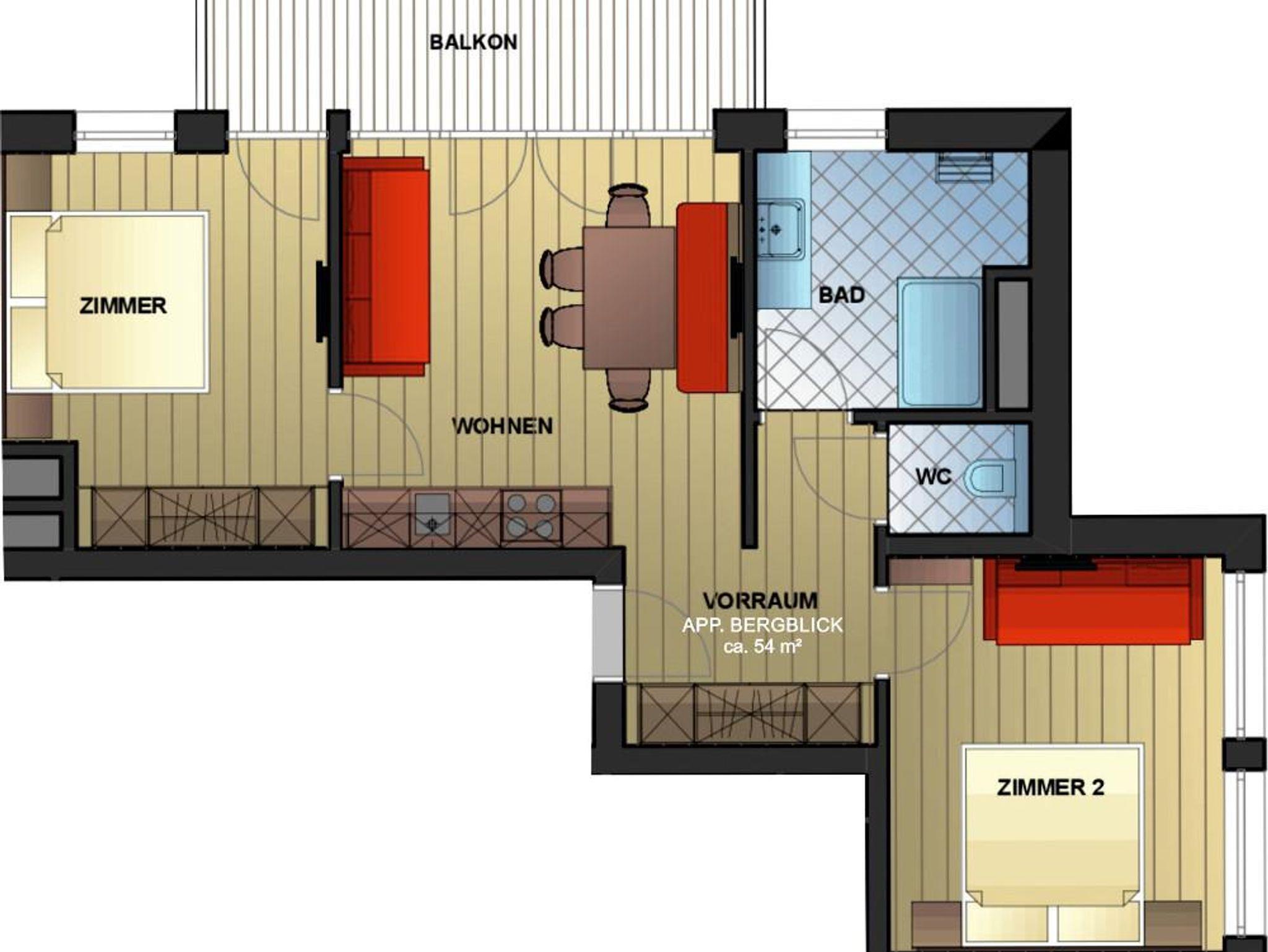 Im Appartement Bergblick finden 4 bis 7 Personen Platz. Es hat ca. 55 m2 und das Appartement verfügt über 2 Schlafzimmer, die Dusche und das WC sind räumlich getrennt. Im Wohnraum befindet sich eine ausziehbare Doppelcouch mit Federkernqualität. Die Einrichtung ist im alpinen Stil. 2 Balkone laden zum Verweilen ein.