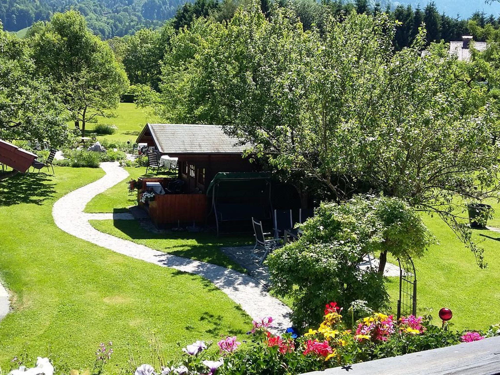 Ferienwohnung mit Schlafzimmer, Wohnzimmer, Küche mit Geschirrspüler, Micro, Backofen, Wasserkocher, Toaster, Filterkaffemaschine, Kabel-TV 2x, Bad und WC, WLAN, Vorraum, Fön, Kosmetikspiegel, Balkon mit traumhafter Aussicht auf die Berge und natürlich Benutzung unseres großen Gartens. Bettwäsche und Handtücher sind genügend vorhanden.