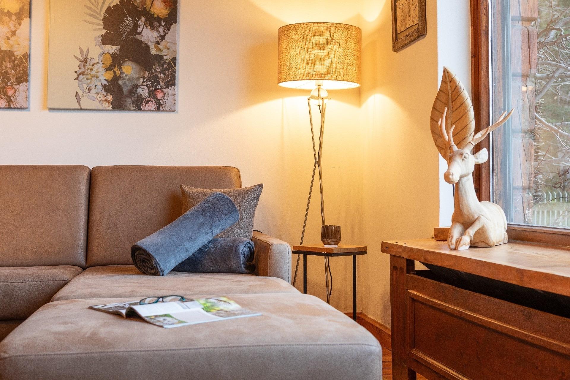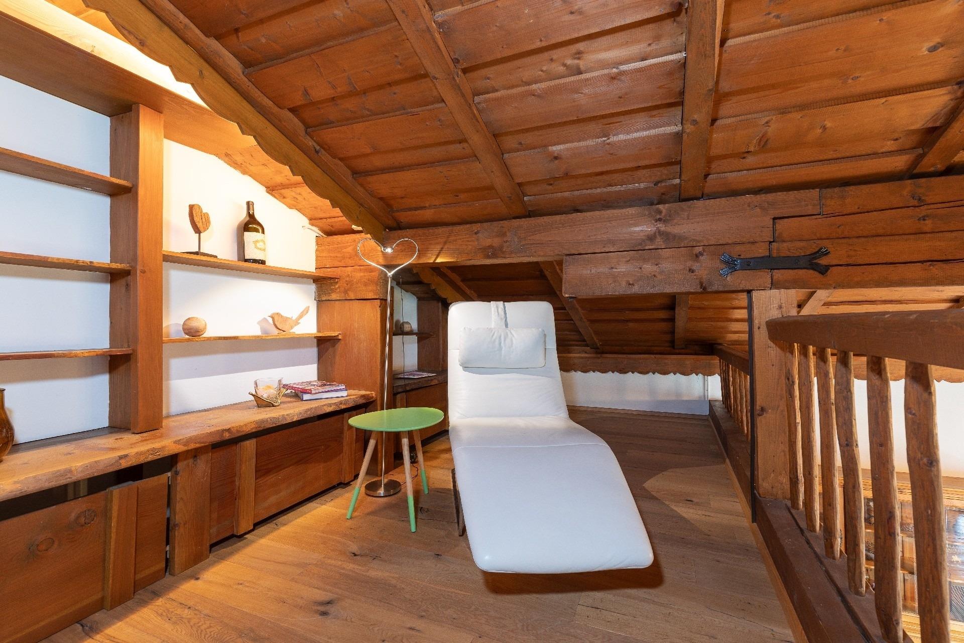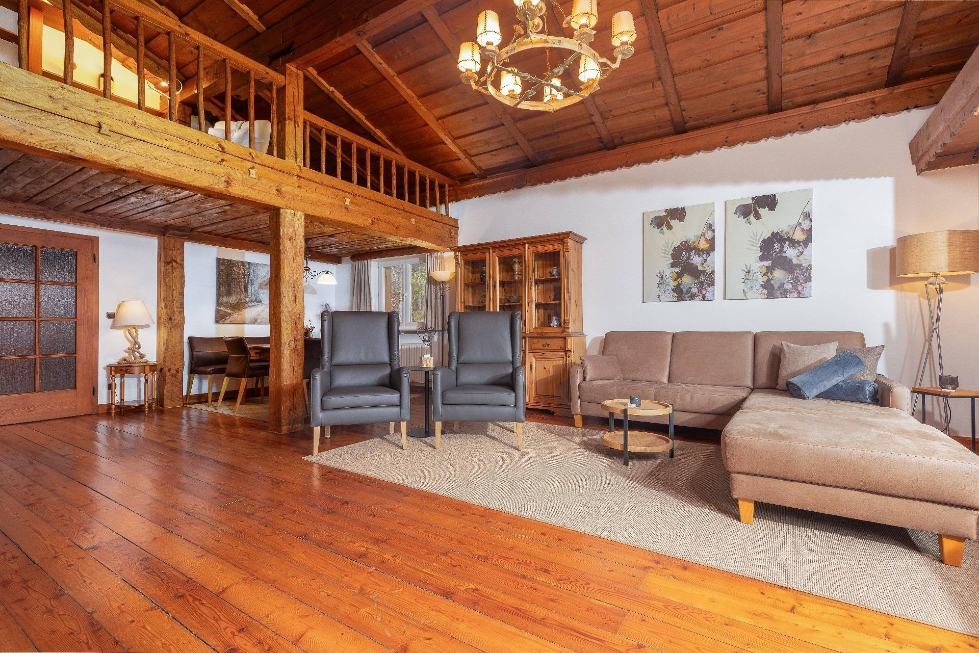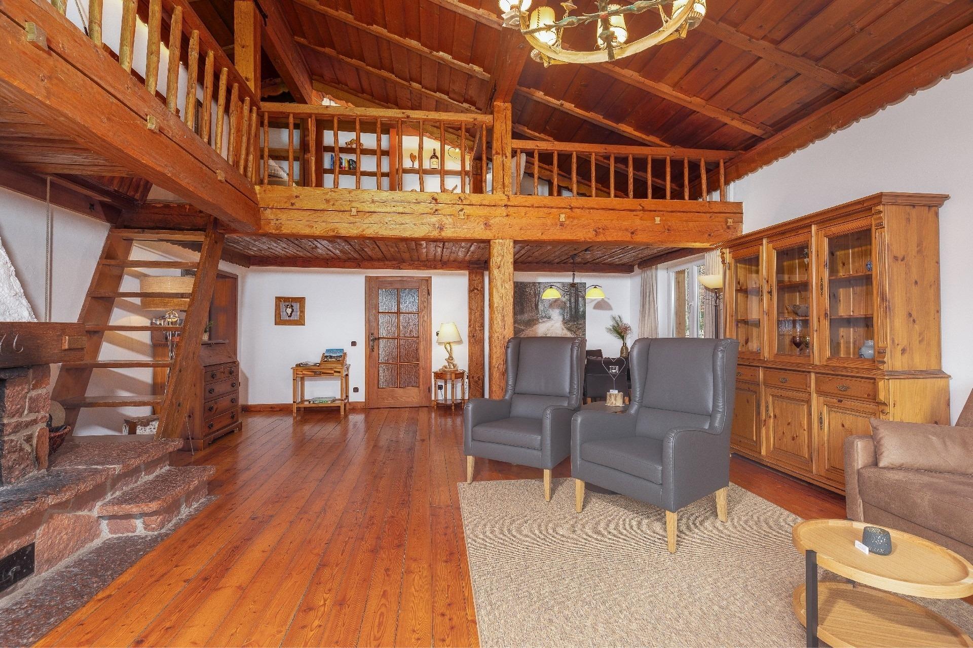 massiver Natur-Lärchenboden, Leder-Relaxsessel. Vom Wohnzimmer aus gelangt man über eine Treppe auf eine Galerie, für Sie