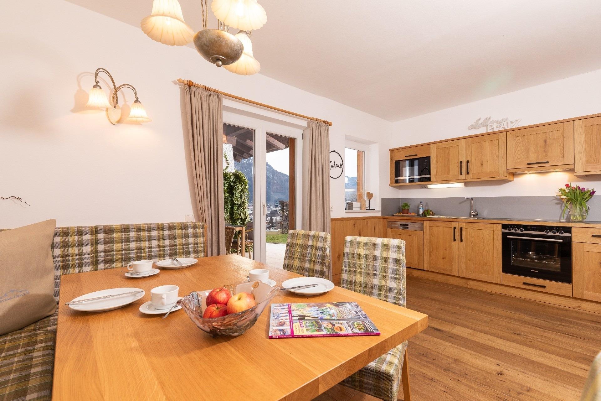 - Küche 26qm mit direktem Zugang zur Terrasse, gemütlicher Essecke, Küchenzeile mit Backofen, Mikrowelle, Ceran-Kochfeld und