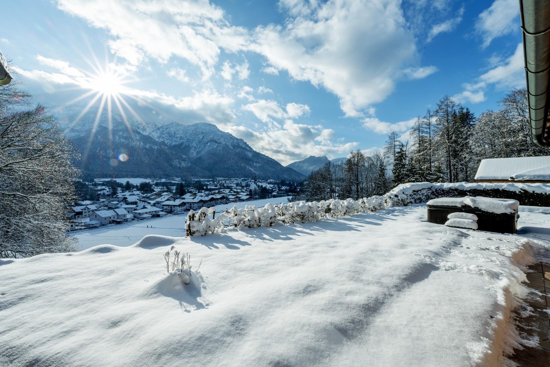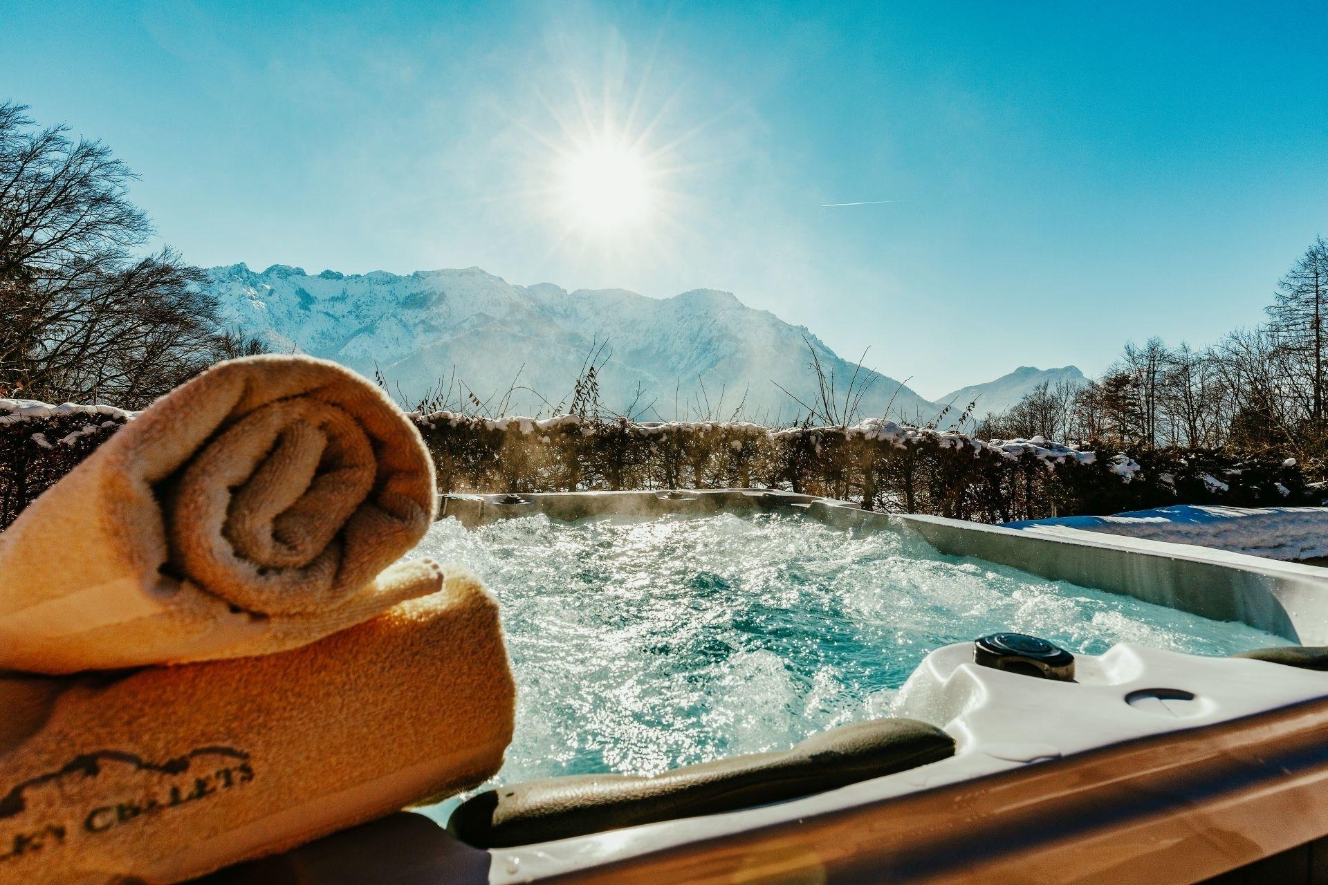 - Ganzjährig nutzbarer und beheizter Außenwhirlpool mit Blick auf die Berge