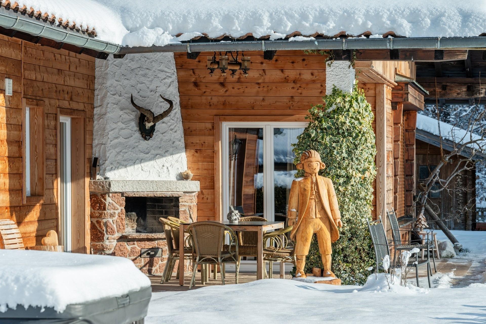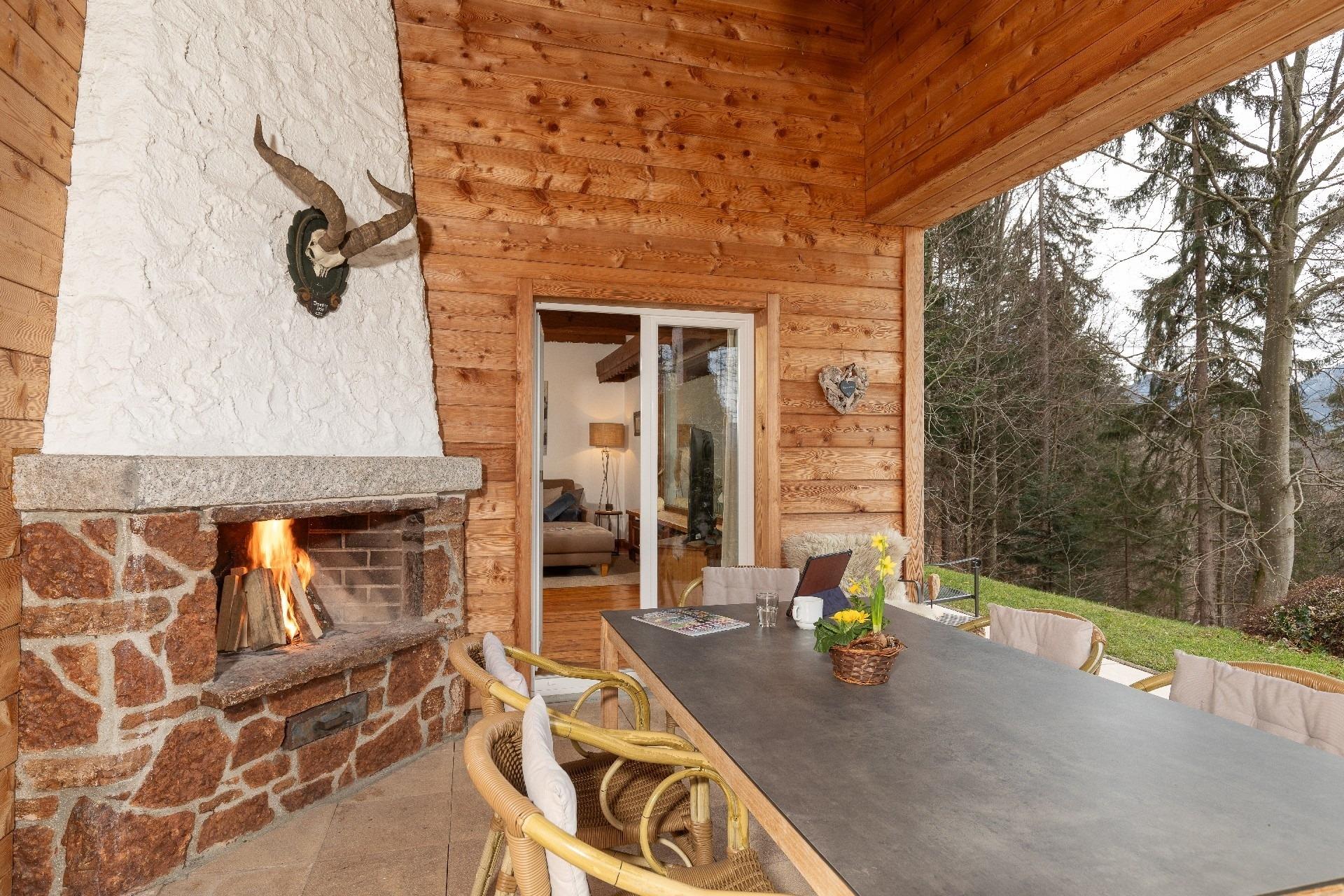 - Überdachte und geschützte Terrasse mit herrlichem Bergblick, Esstisch und offenem Kamin mit Kaminholz