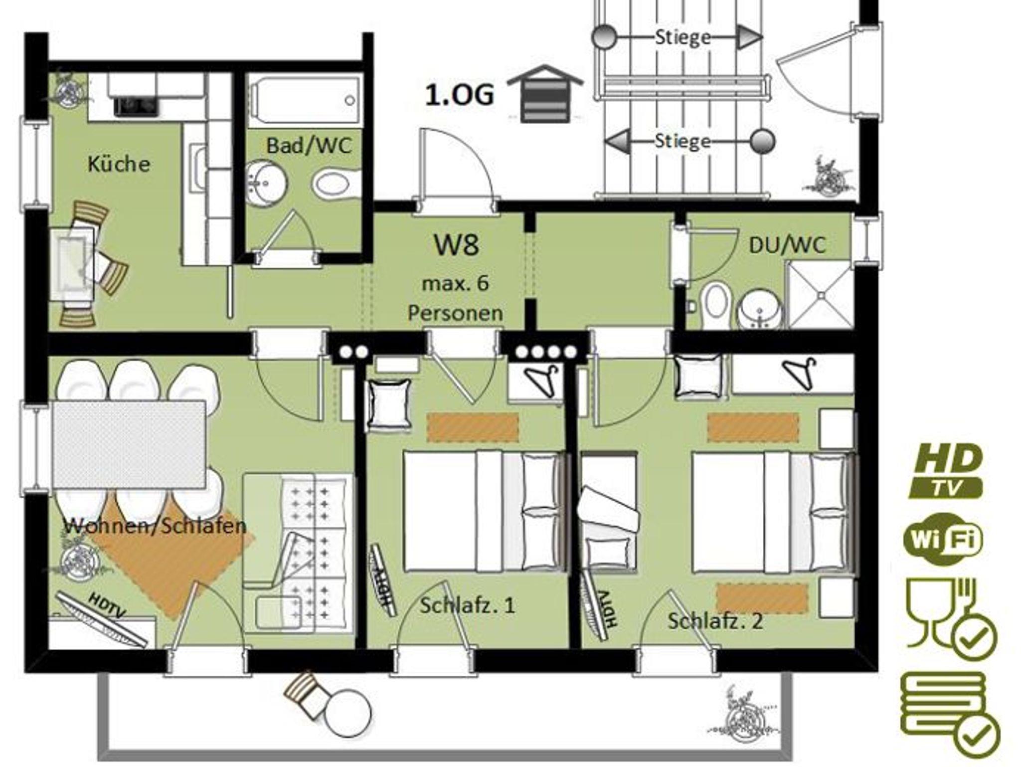 Die Wohnung W8 ist im 1. Obergeschoß und besteht aus Küche, Wohnzimmer mit Ausziehcouch, 2 Doppelzimmer mit Zusatzbett, Dusche/WC, Bad/WC, großes Vorzimmer- max 4(+2 Kinder) Personen.