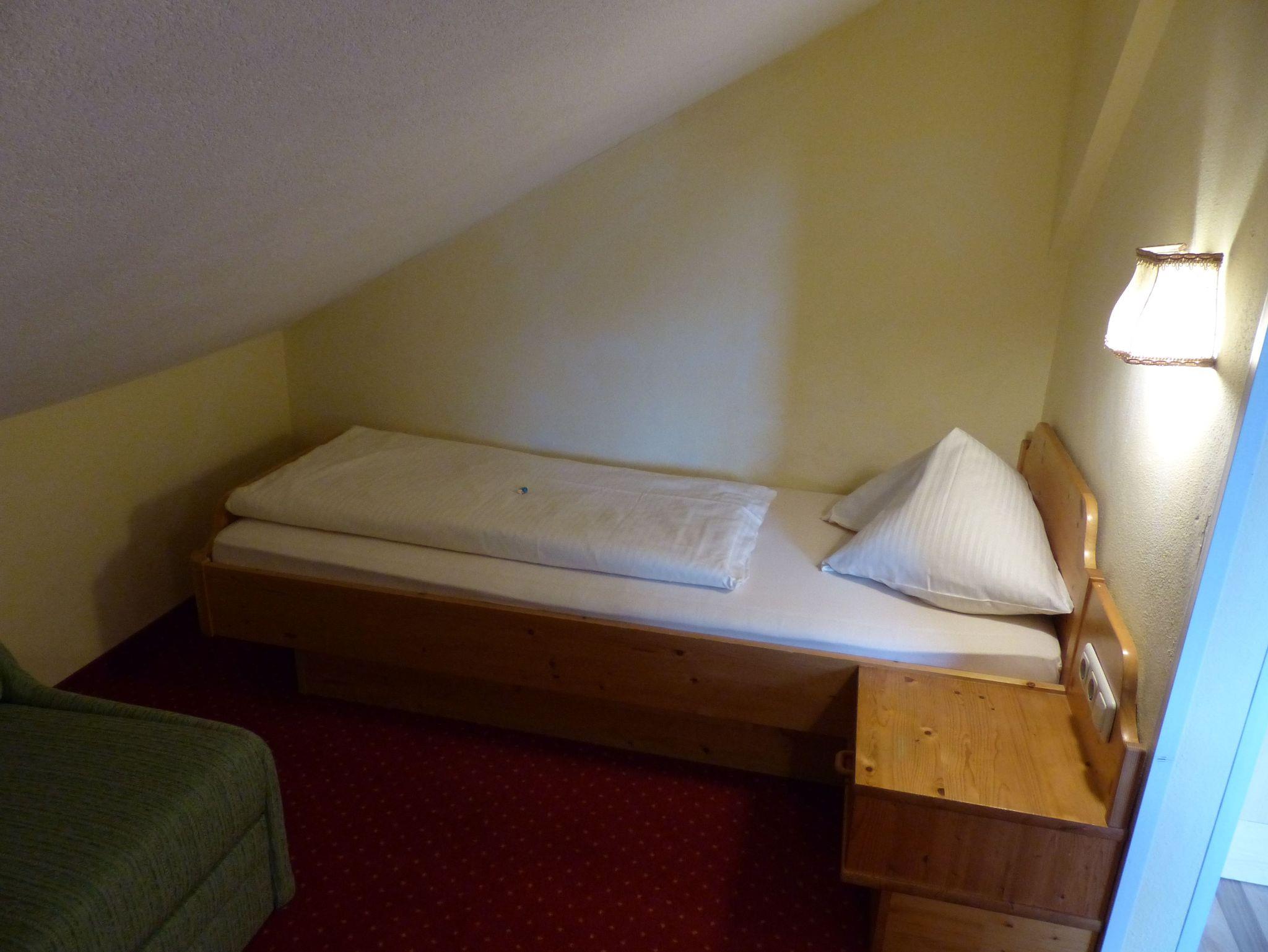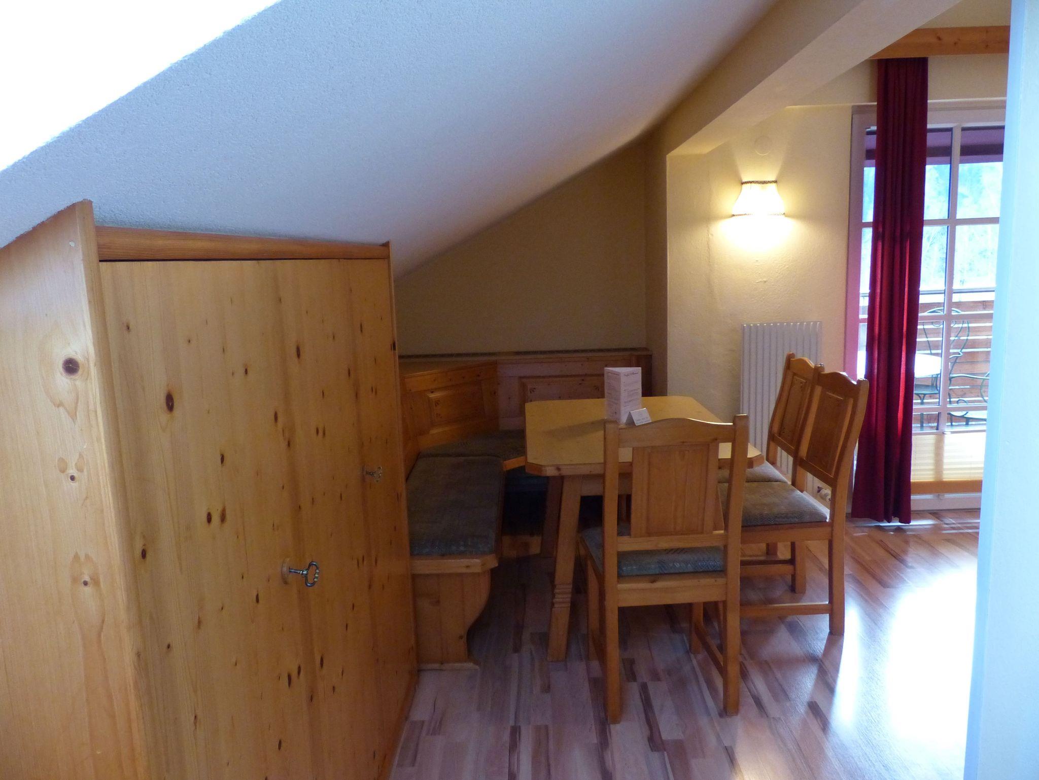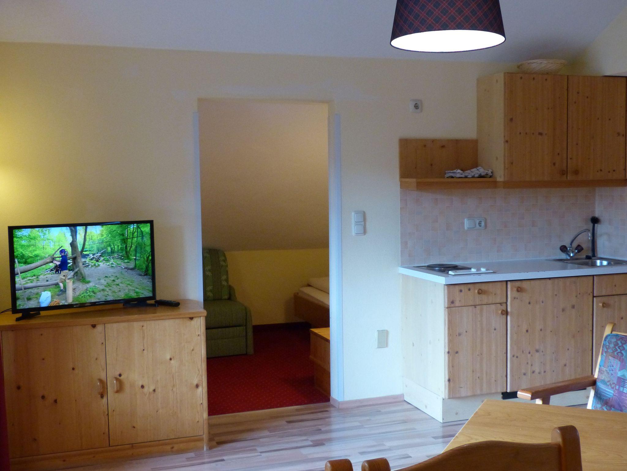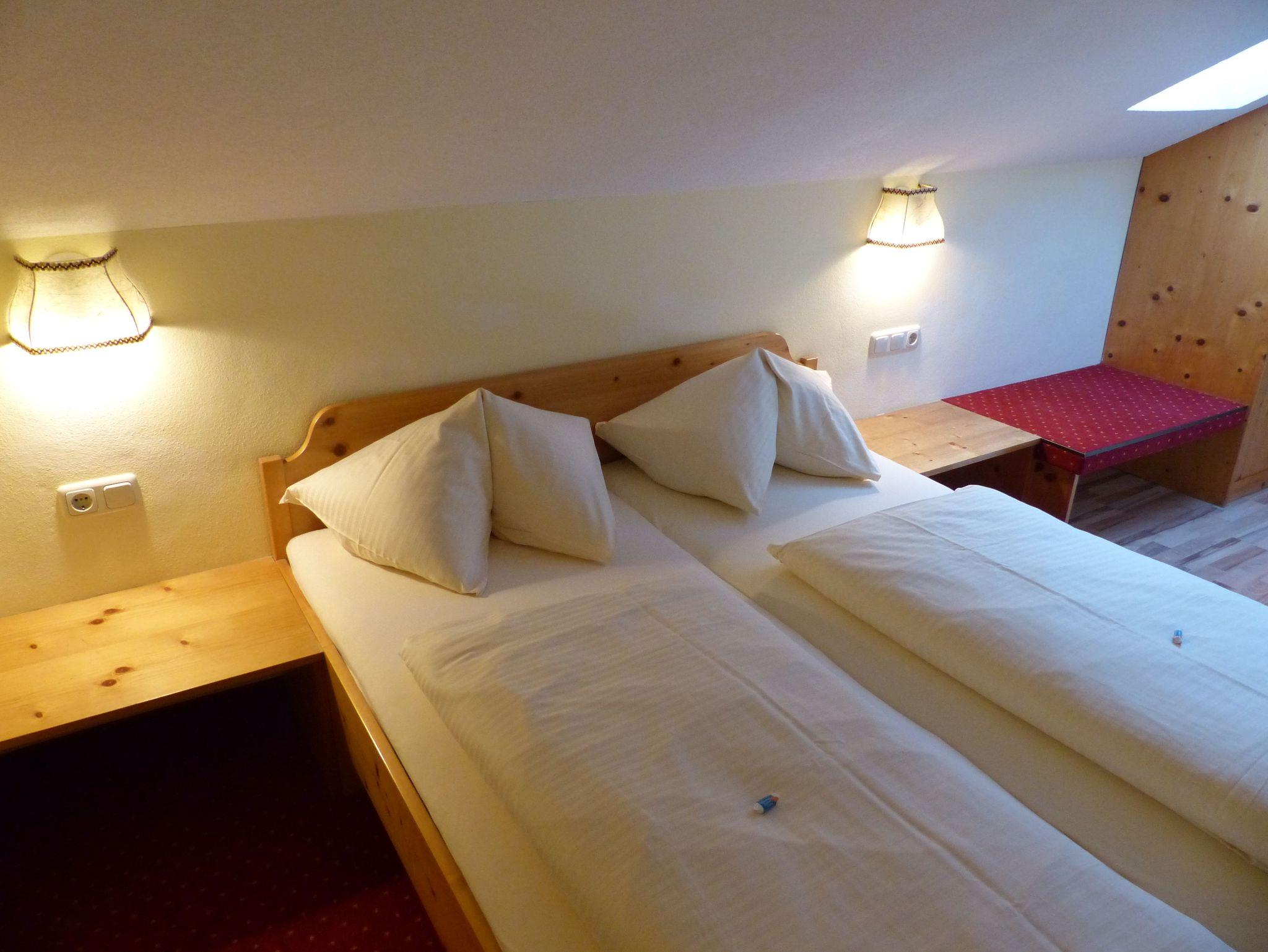 Das Appartement Thaneller ist ein gemütliches 1-Raum-Appartement mit ca. 45 m² im Dachgeschoss mit großem Panoramafenster. Die offen gestaltete Wohn-, Schlaf- und Esszimmer-Kombination ist ausgestattet mit einem Doppelbett unter der einen Dachschräge und 2 Einzelbetten + Couchstuhl unter der gegenüberliegenden Dachschräge, 1 Kleiderschrank, 1 Eckbank mit 3 Stühlen, 2er-Couch mit Couchtisch, Flat-Kabel-TV, Kochnische sowie Dusche/WC, Balkon und kostenlosem W-Lan.