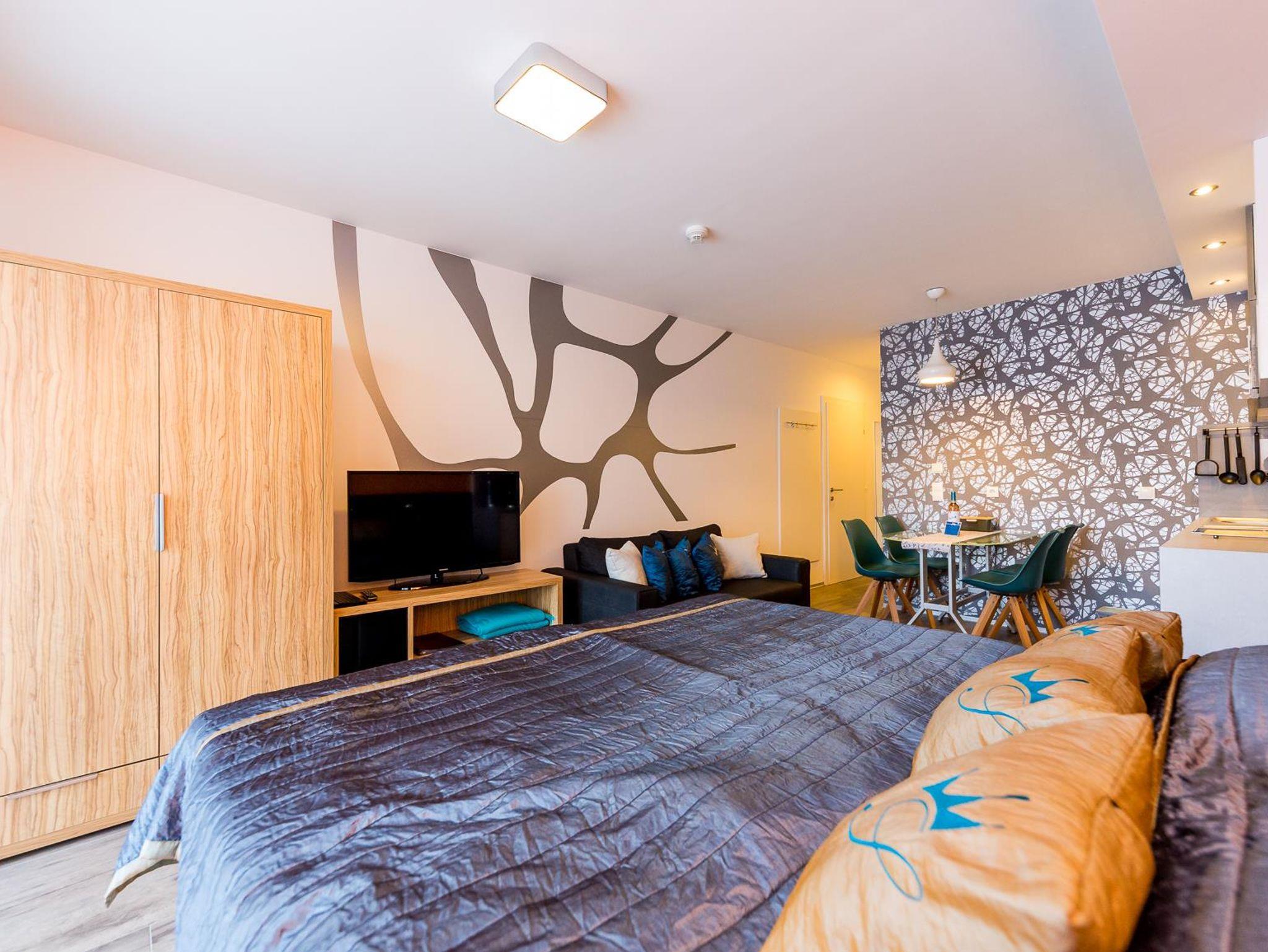 Einzimmerappartement. Wohnzimmer/Schlafzimmer ist mit einem Doppelbett und mit einem ausziehbaren Sofa eingerichtet. Zu dem Studio gehört eine Essdiele, eine komplett ausgestattete Kochecke, Badezimmer mit Dusche und eine Terrasse (7m2).
