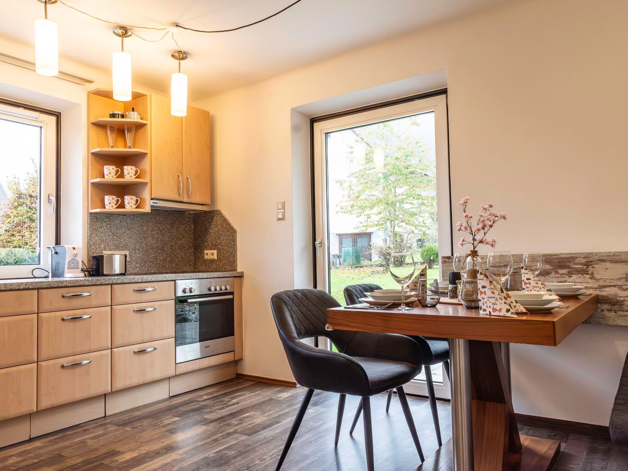 Der kleine Balkon mit Sitzgelegenheit, erreichbar über die Küche, bietet einen Blick in unseren schönen Garten, der jederzeit zum grillen, relaxen, genießen... genutzt werden kann.