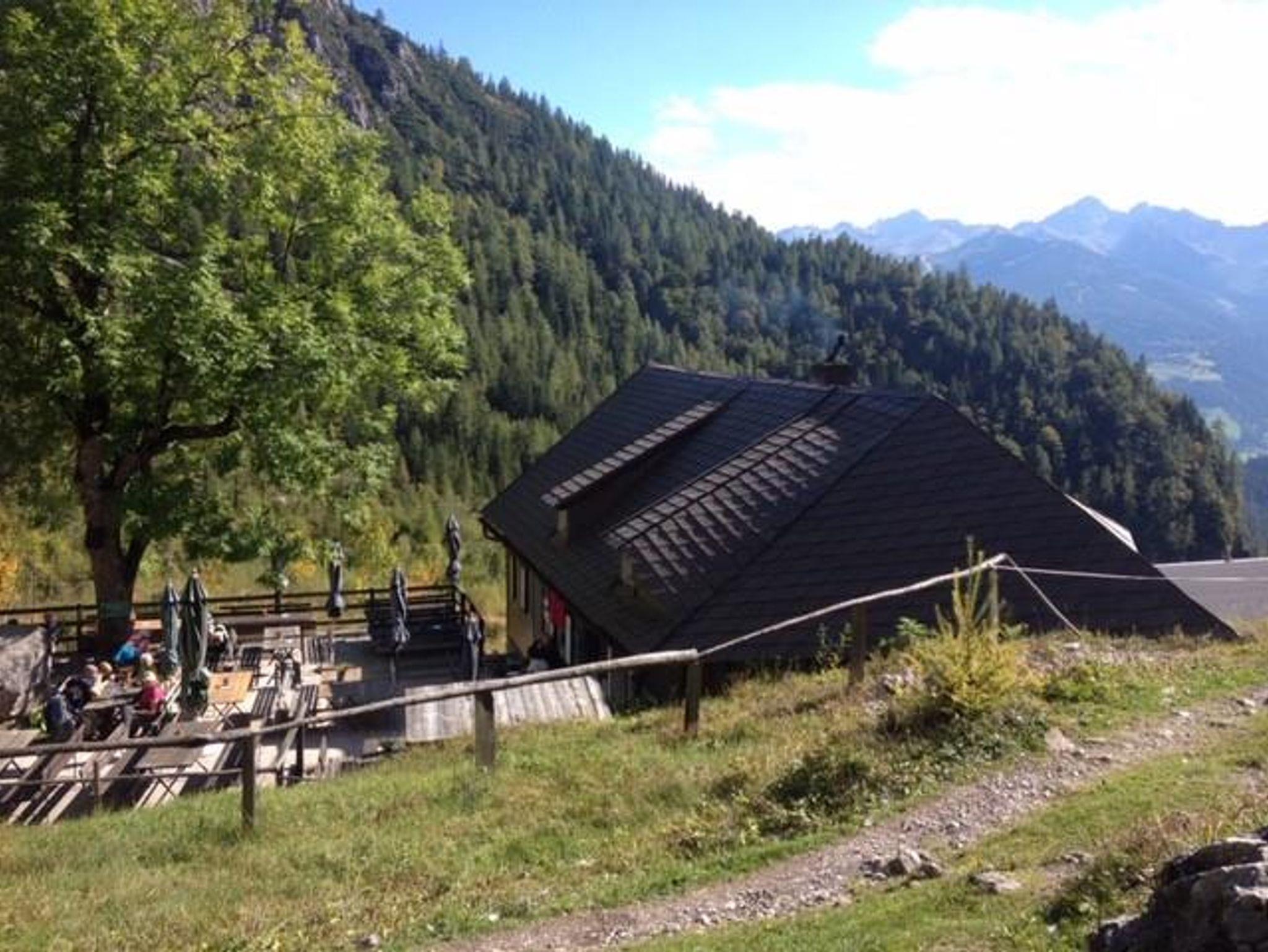 - Terrasse mit Gartenmobiliar und Blick auf das Dachstein Massiv