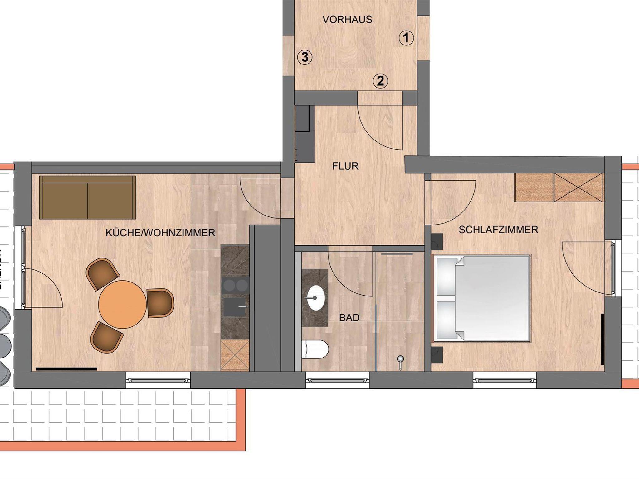Wir kombinieren hochwertige moderne Ausstattung mit ländlichem Charme. Unsere Appartements von 29m² bis 51m² verfügen jeweils über einen Schlafraum, einen separaten Wohnraum mit vollausgestatteter Küche, ein geräumiges Bad und einen großzügigen Balkon mit Sitzmöglichkeit.