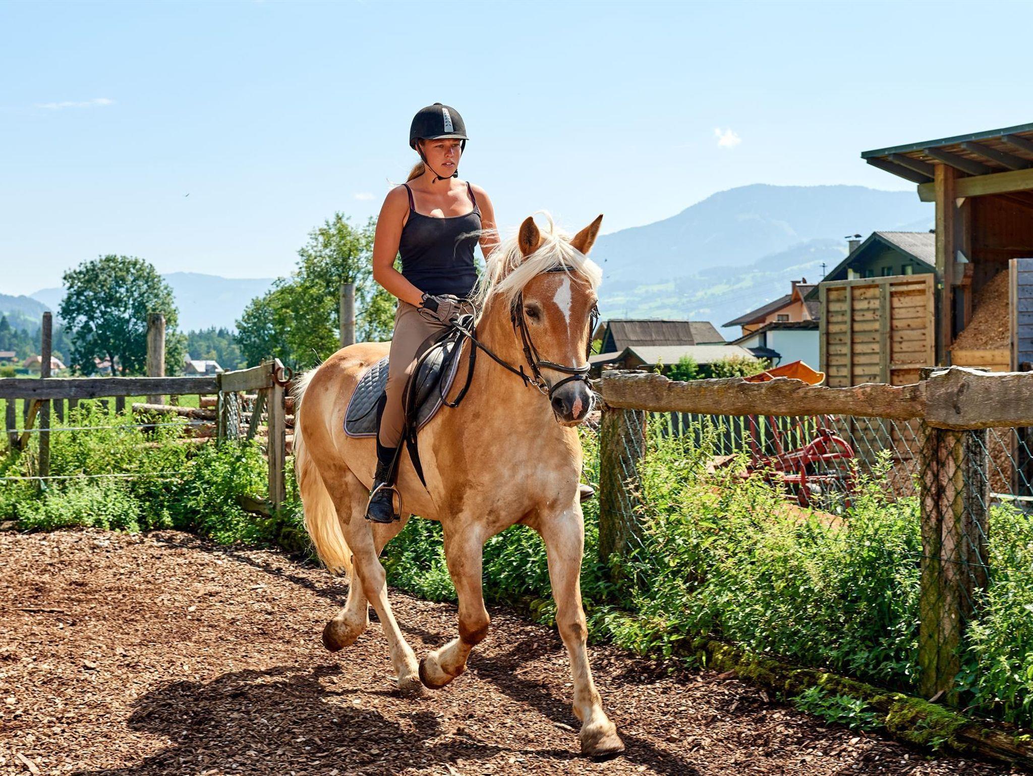 Sommer: Reiten, Fischen, Bogenschießen. Abwechslung und Gemütlichkeit, Ponywanderung, Traktorfahrt, Kletterwand. Am Dorfrand - freie Aussicht auf die umliegende Bergwelt, von 40.000 qm Wiese umgeben - viel Platz zum Herumtollen.