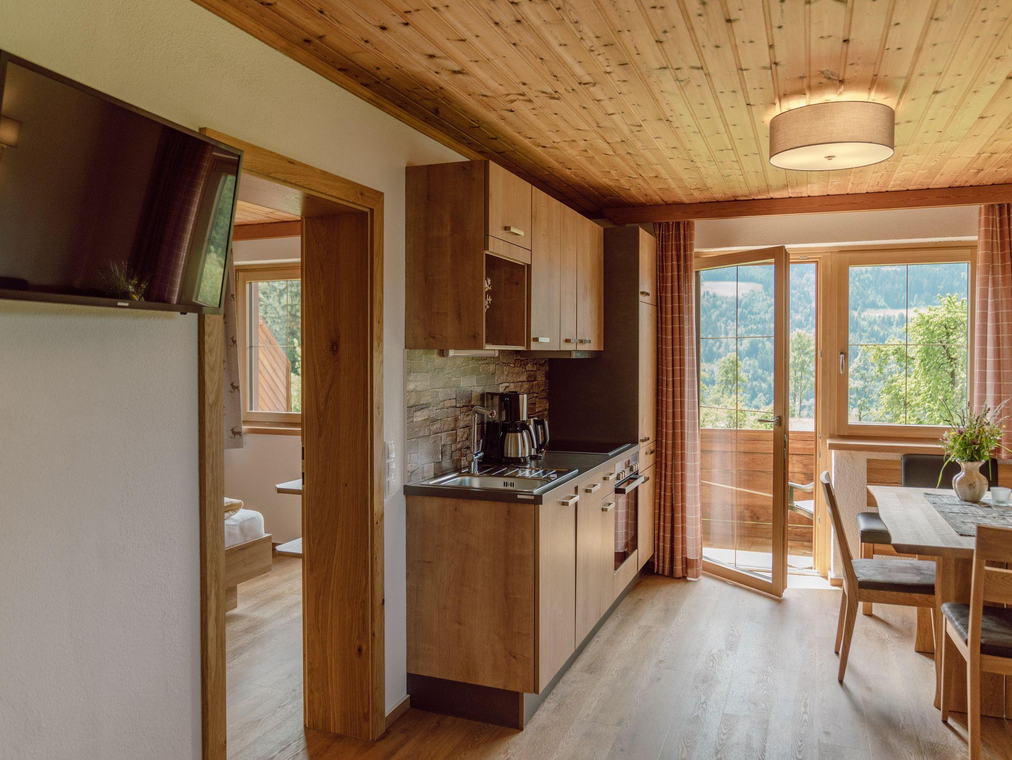 Appartement C - Balkon mit toller Aussicht, ein Schlafzimmer (optional weiteres Schlafzimmer mit eigenem Bad zubuchbar), Schlafcouch für 2 Personen, Fernseher in Schlafzimmer und Küche, Dusche, WC und W-LAN. Diese Wohnung bietet bis zu 4 Personen ein angenehmes Daheim in den Bergen. Ideal z.B. für eine Jungfamilie.