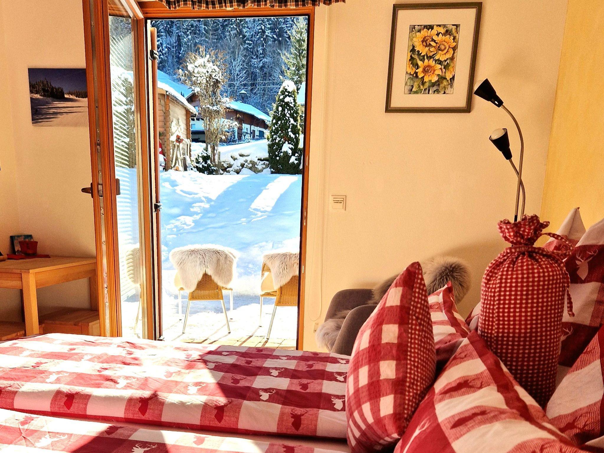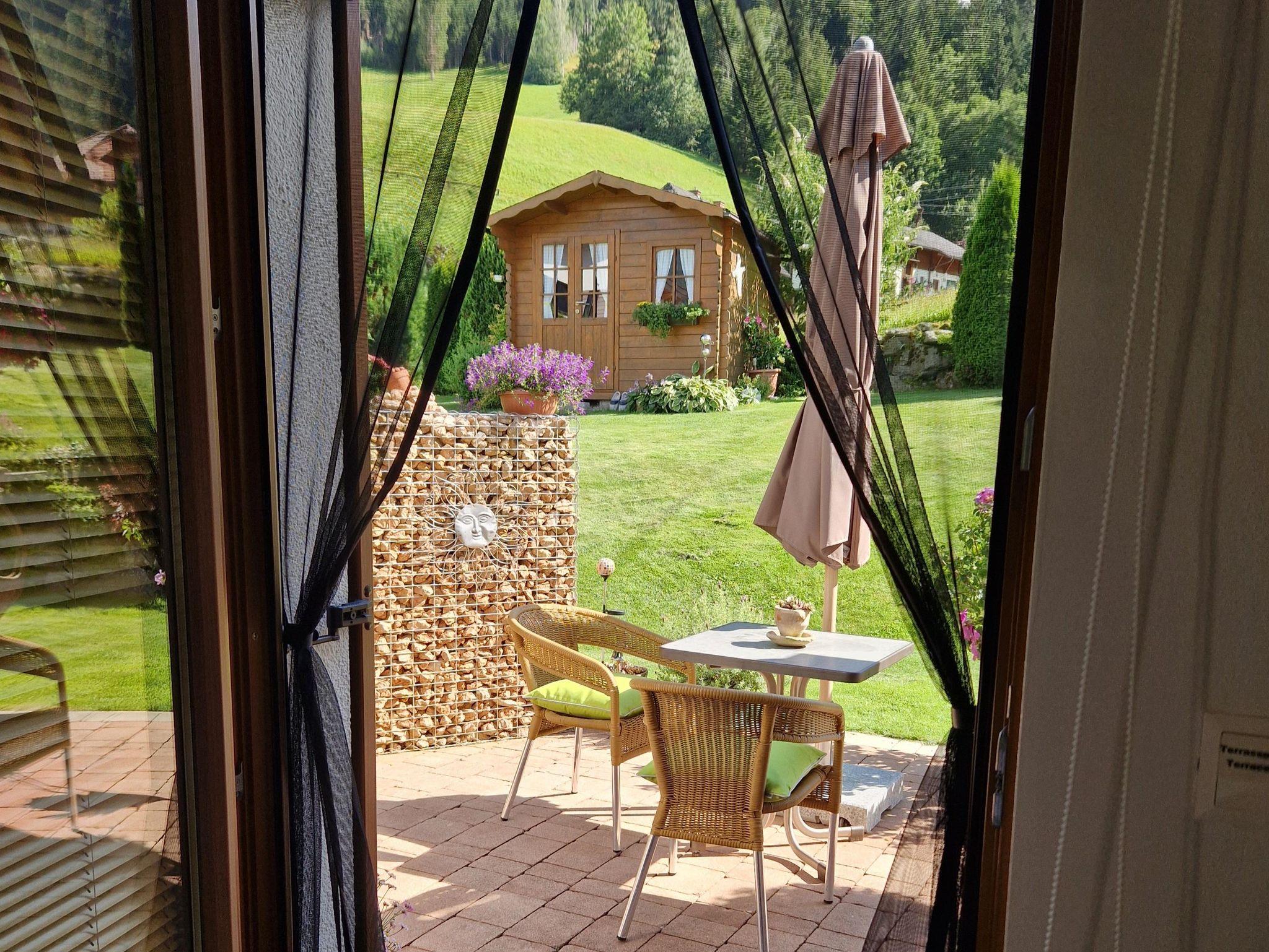 Das Schlafzimmer hat ein großes Fenster und eine Türe auf die Terrasse mit Tisch und Stühle, wo Sie vor allem in den Sommermonaten gemütlich verweilen und die Natur genießen können.