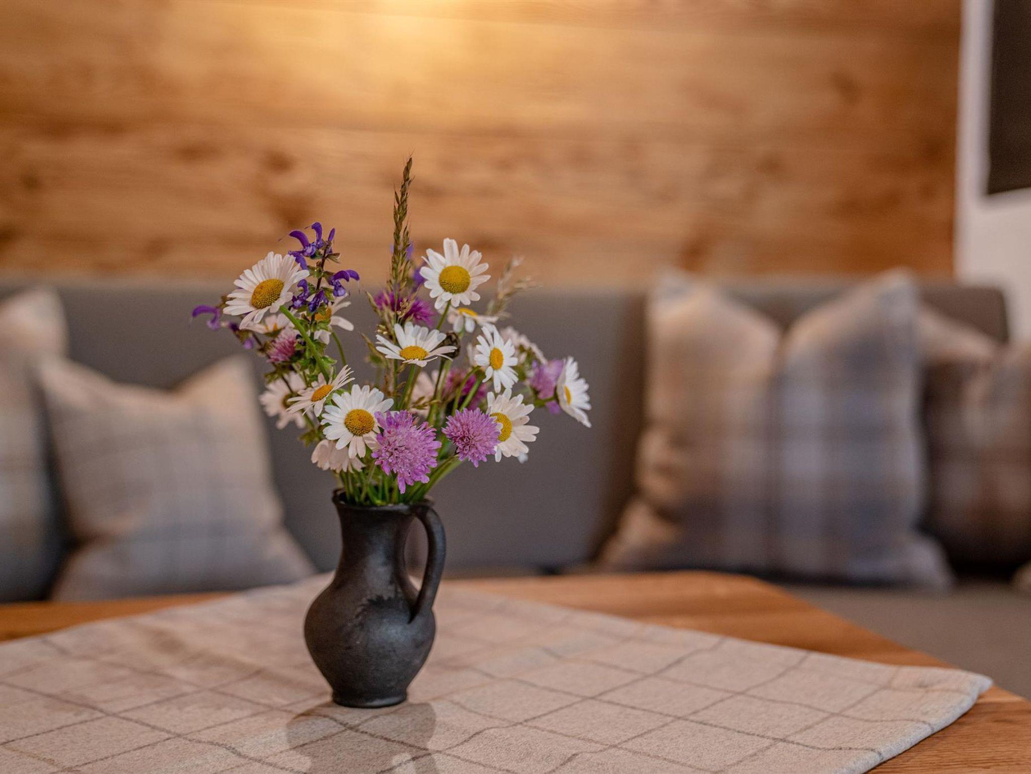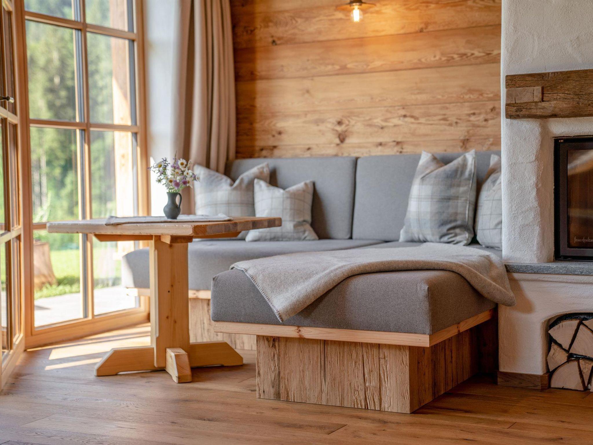 Warme Farben, weich kuschelige Stoffe, das Knistern des Kachelofens sowie natürliche Materialien wie Altholz, Naturstein und Loden aus unserer Heimat machen aus den Räumen Rückzugsorte mit Charme und bereiten unvergessliche Glücksmomente in den Bergen.