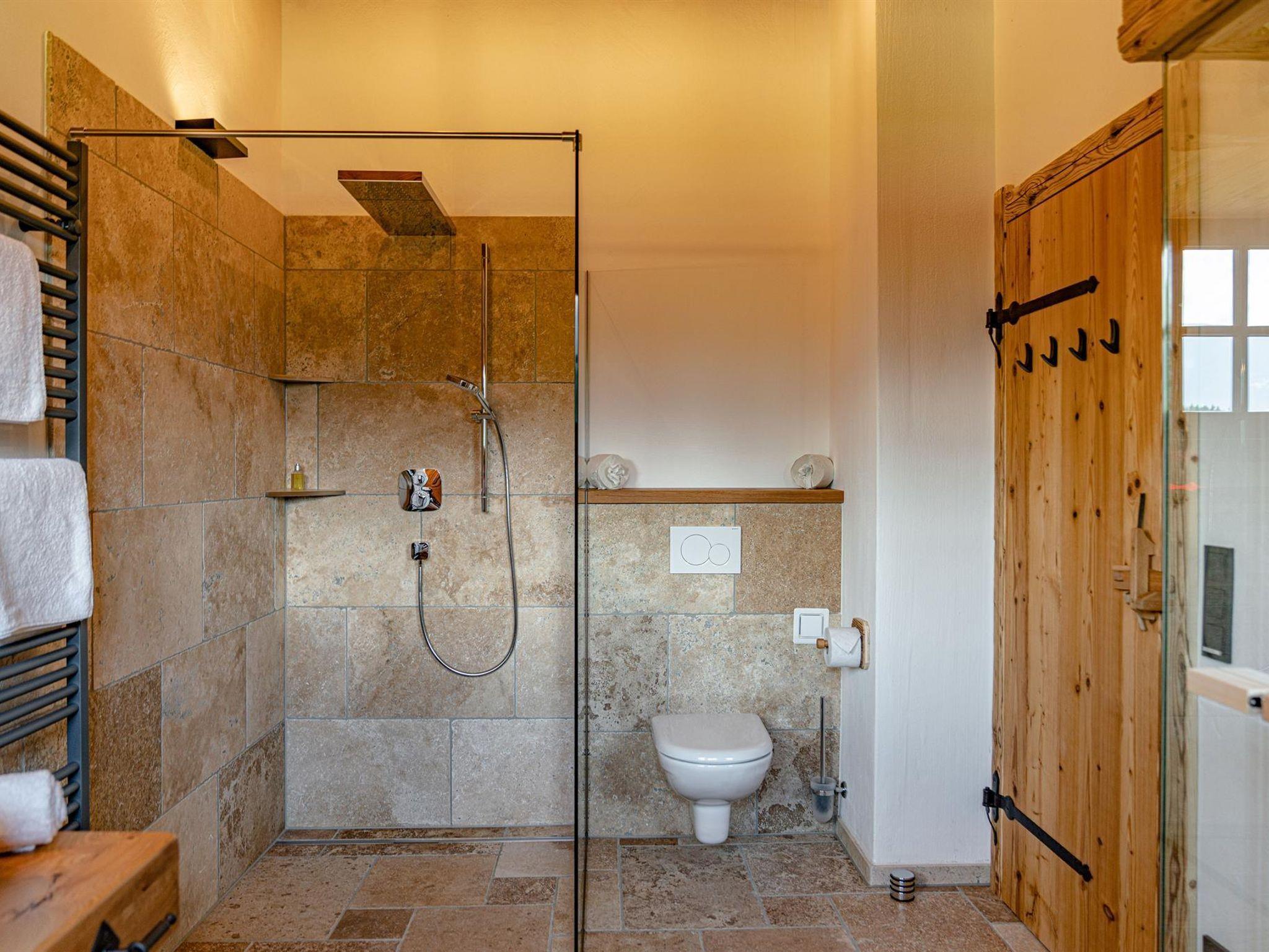 - 1 großzügiges Badezimmer mit Sauna, Doppelwaschbecken, WC und Regendusche sorgen für Wohlbefinden und Entspannung pur