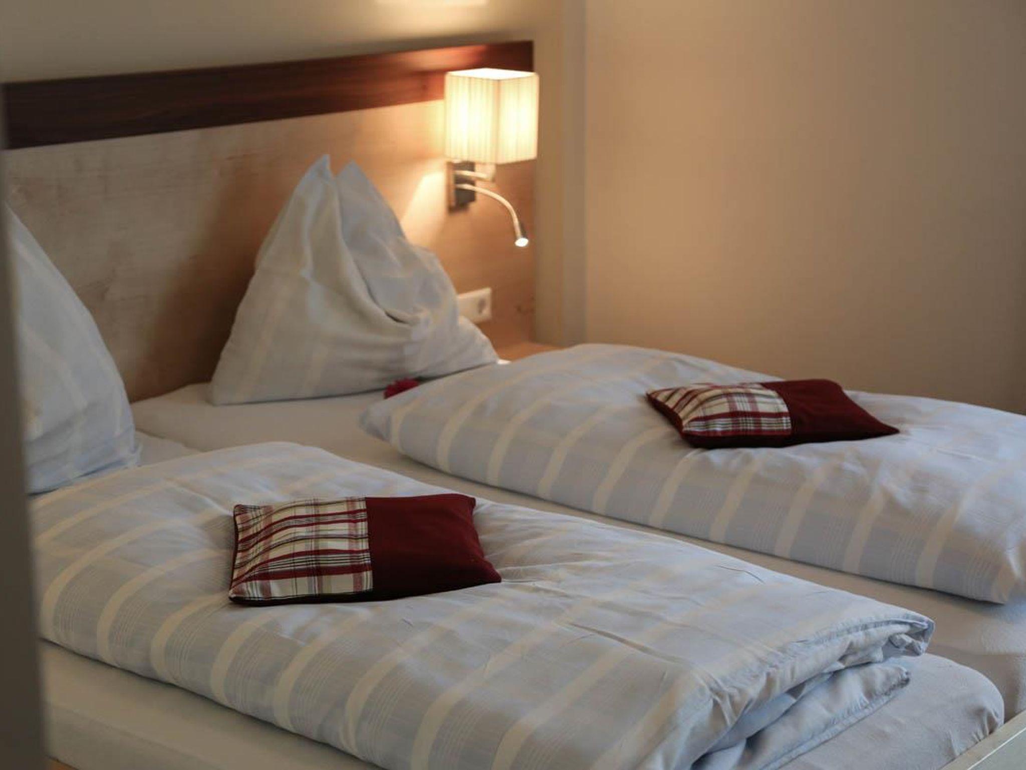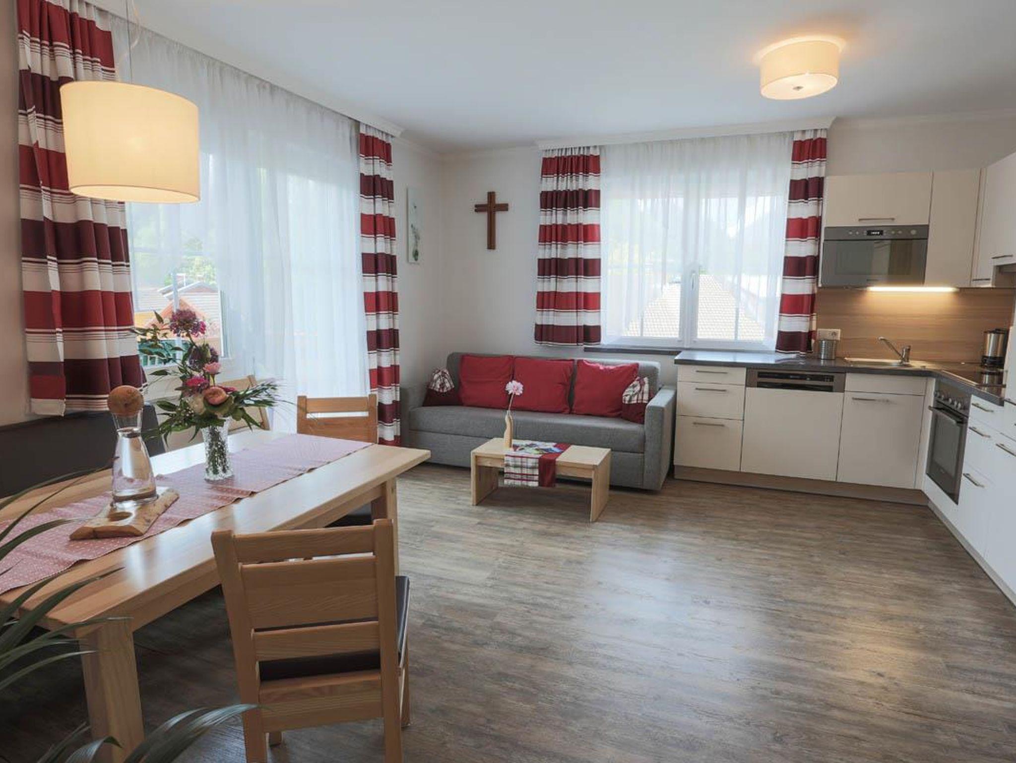Vorraum mit Garderobe, Badezimmer mit Dusche und WC, 1 seperates WC, 1 Schlafzimmer mit Doppelbett - Sat-TV - Balkon nordseitig, 1 Schlafzimmer mit Doppelbett - Sat-TV - Balkon südseitig, funktionell und modern eingerichtete Wohnküche (Mikrowelle, Backrohr, Kaffeemaschine, E-Herd, Kühlschrank mit Gefrierfach, Geschirrspüler) mit Doppelcouch – Sat-TV mit DVD Player - Balkon südseitig. W-Lan. Größe 60 m²