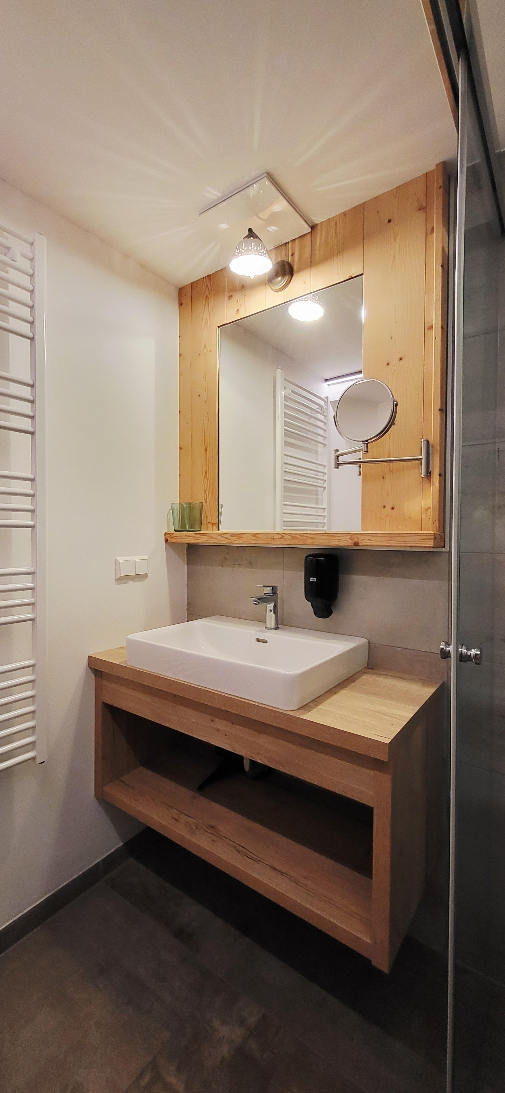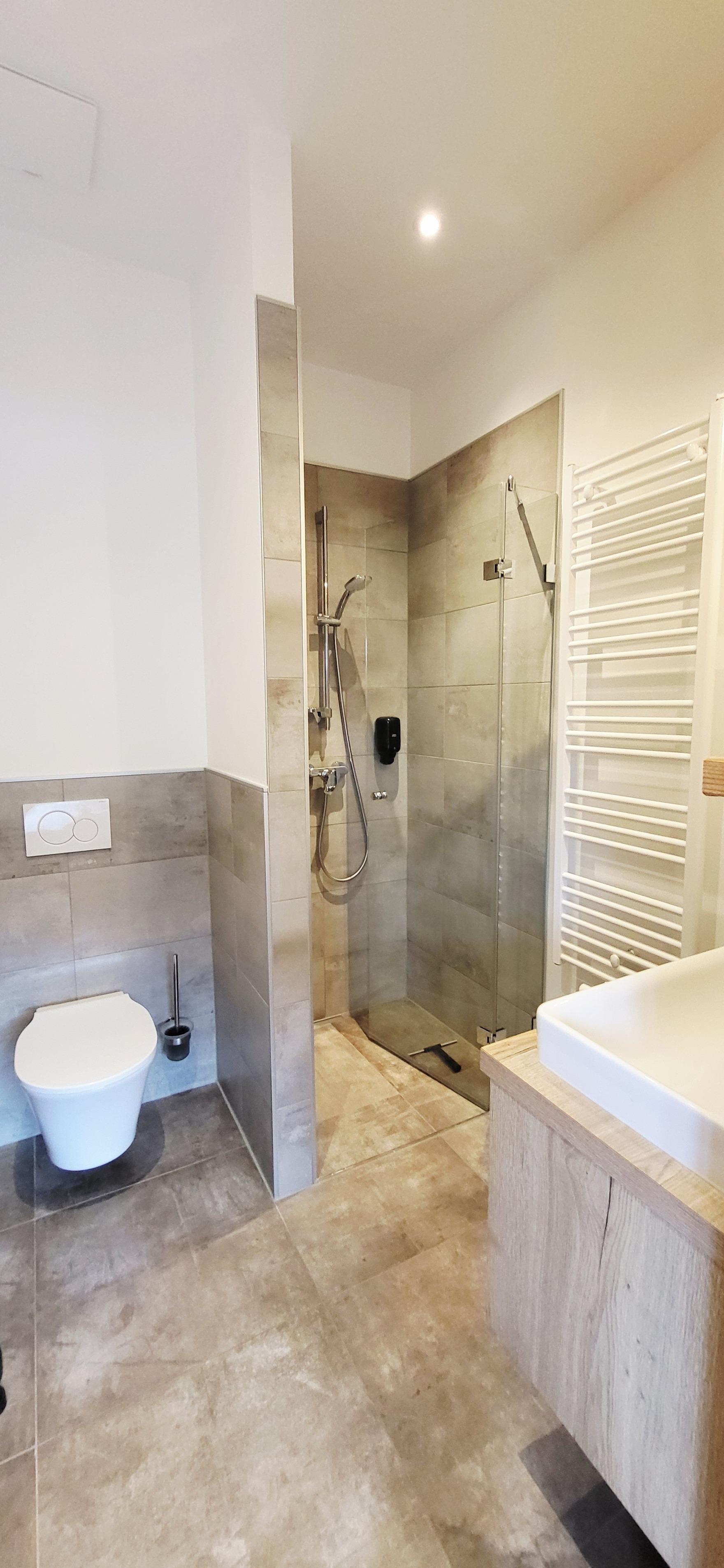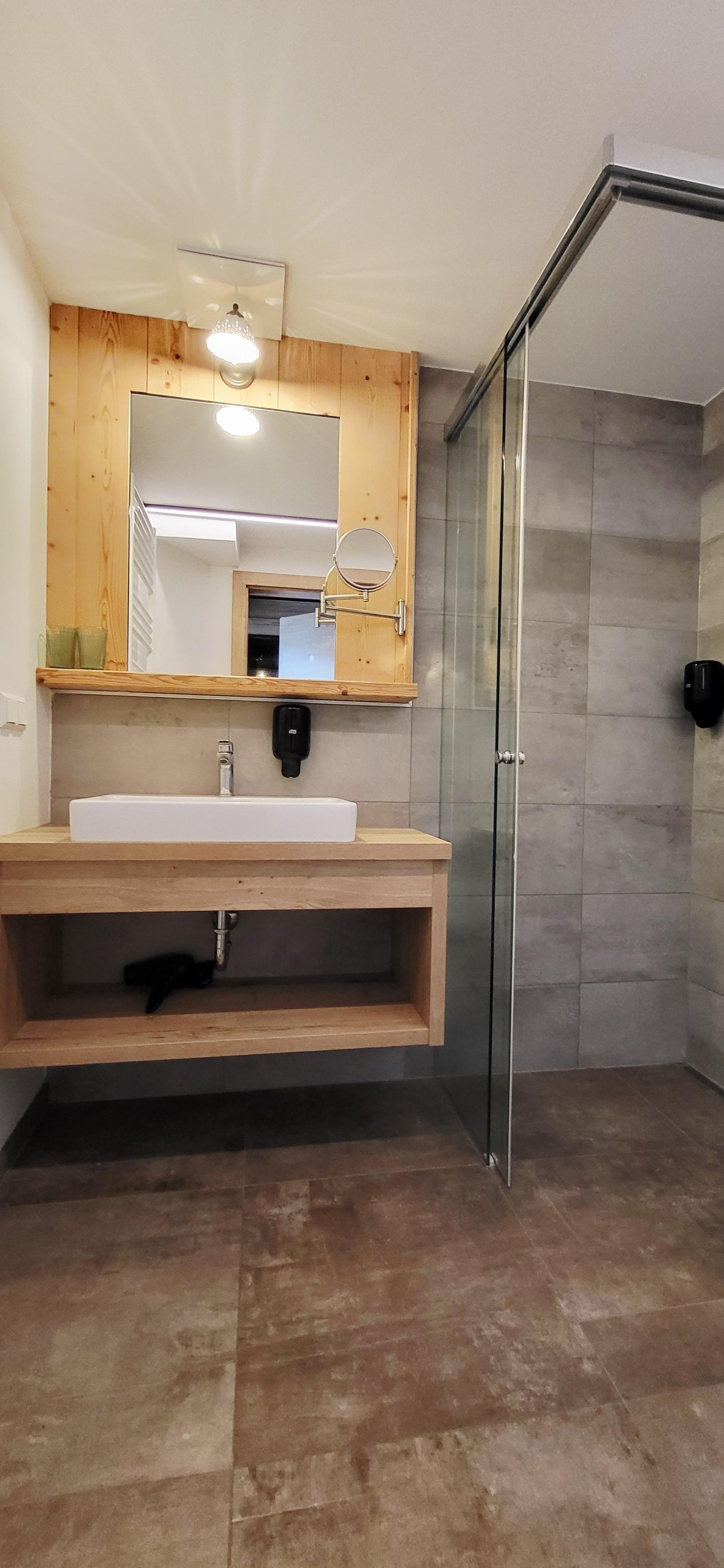 Zwei moderne Bäder mit Dusche und WC sowie eine private Sauna sorgen für besonderen Komfort und pure Erholung – perfekt, um nach einem erlebnisreichen Tag in den Bergen zu relaxen und neue Energie zu tanken.