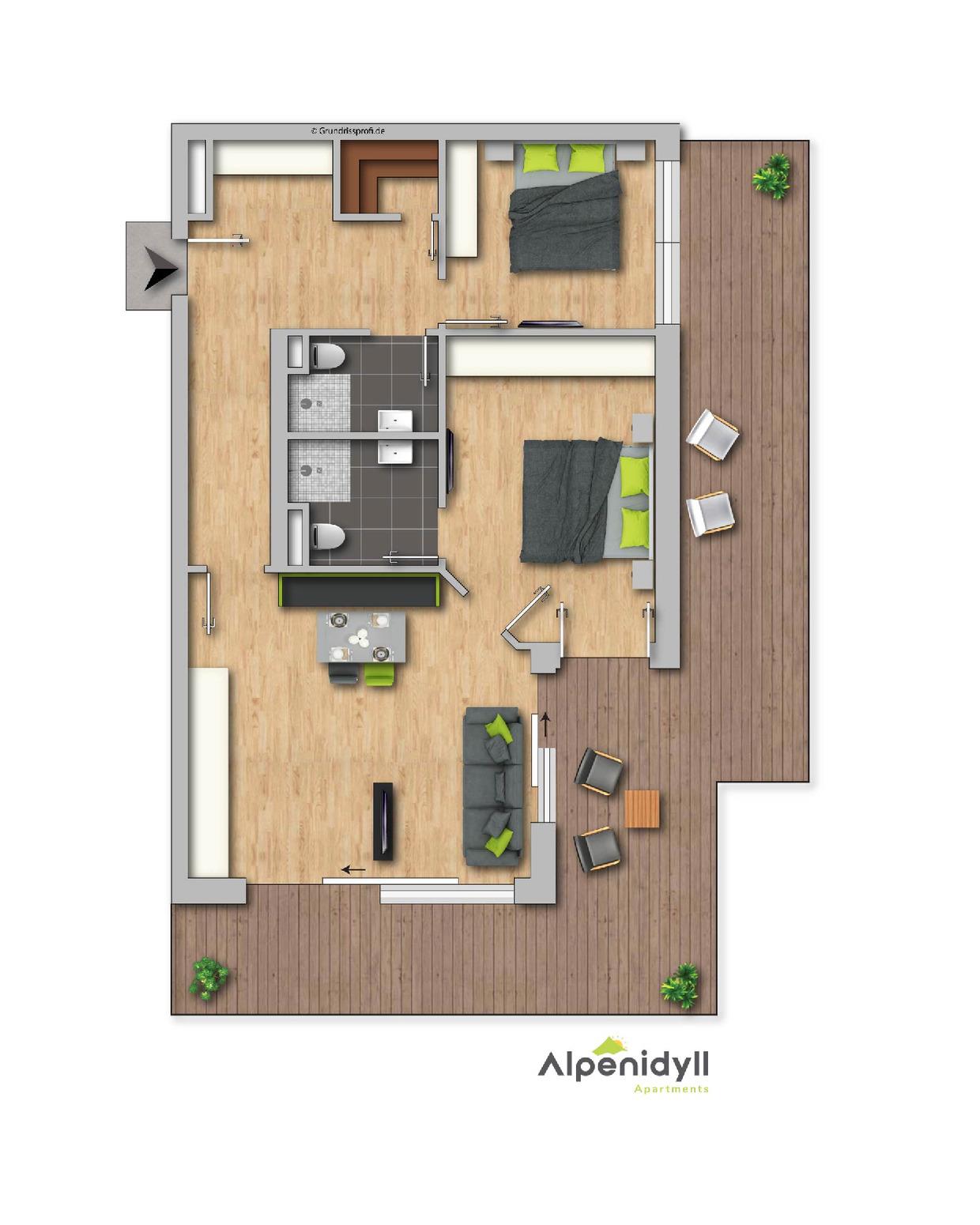 Das stilvolle Apartment begeistert mit einem großzügigen Wohnraum, einer voll ausgestatteten Küche und einem gemütlichen Esstisch – ideal zum gemeinsamen Genießen und Entspannen. Zwei komfortable Schlafzimmer, jeweils mit direktem Zugang zur großen Panoramaterrasse, bieten traumhafte Ausblicke auf die umliegende Bergwelt.