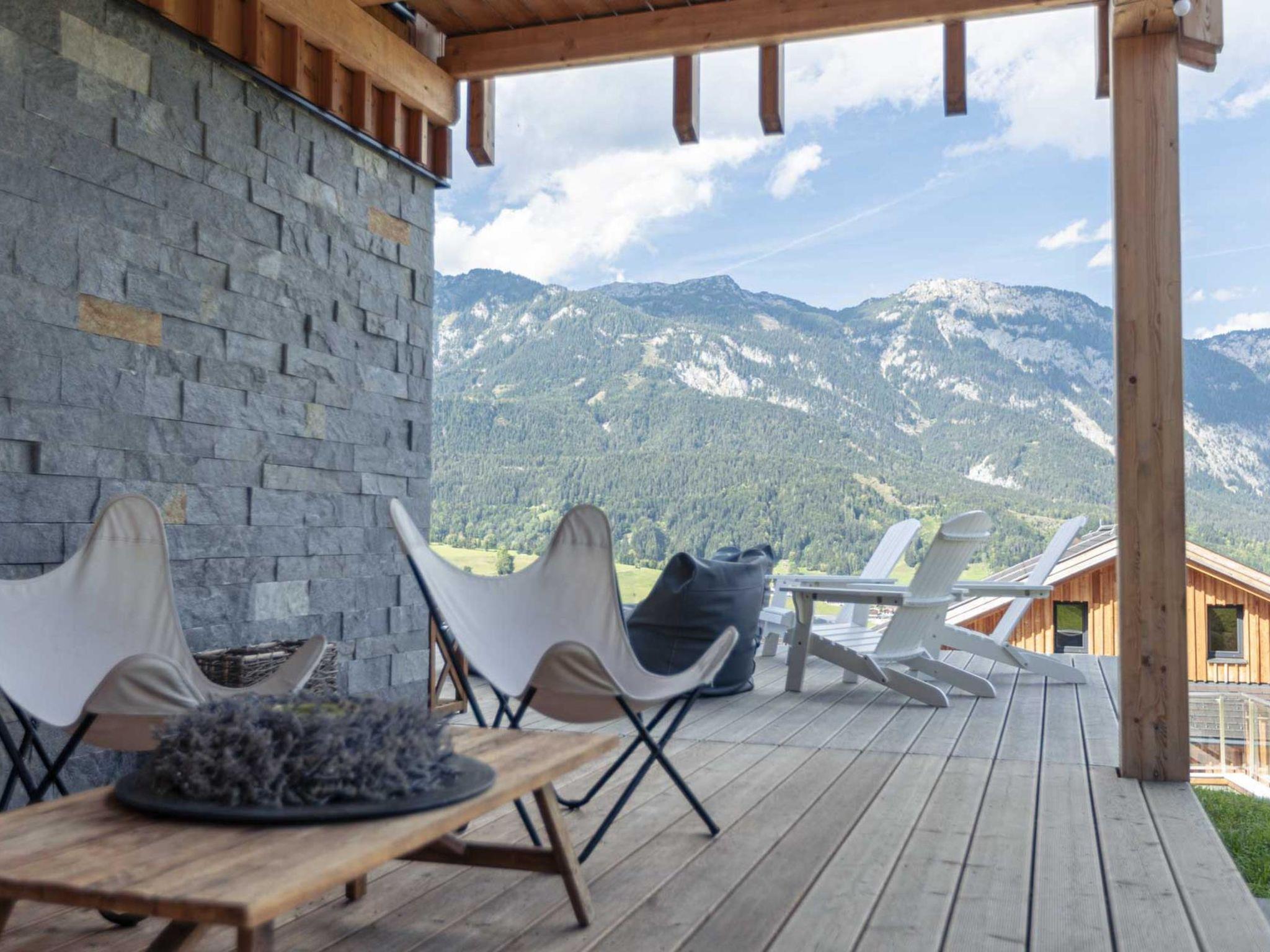 "Premium mit 5 Schlafzimmern, Sauna &Pool", 6-room chalet 150 m2. Bright, comfortable and luxurious furnishings: living/dining room with Scandinavian wood stove, dining table, satellite TV, flat screen and gas heater. 4 double bedrooms, each room with shower/WC. 1 double bedroom. Open kitchen (oven, dishwasher, 4 ceramic glass hob hotplates, toaster, kettle, microwave, electric coffee machine). Bath/WC, sep. WC, hydro massage shower, Sauna. Balcony. Balcony furniture. Very beautiful panoramic view of the mountains. Facilities: Internet (WiFi, free). E-charging station. Please note: non-smokers only. The property is one of a type of property or apartment. The Chalet Dachstein has its own heated outdoor pool.