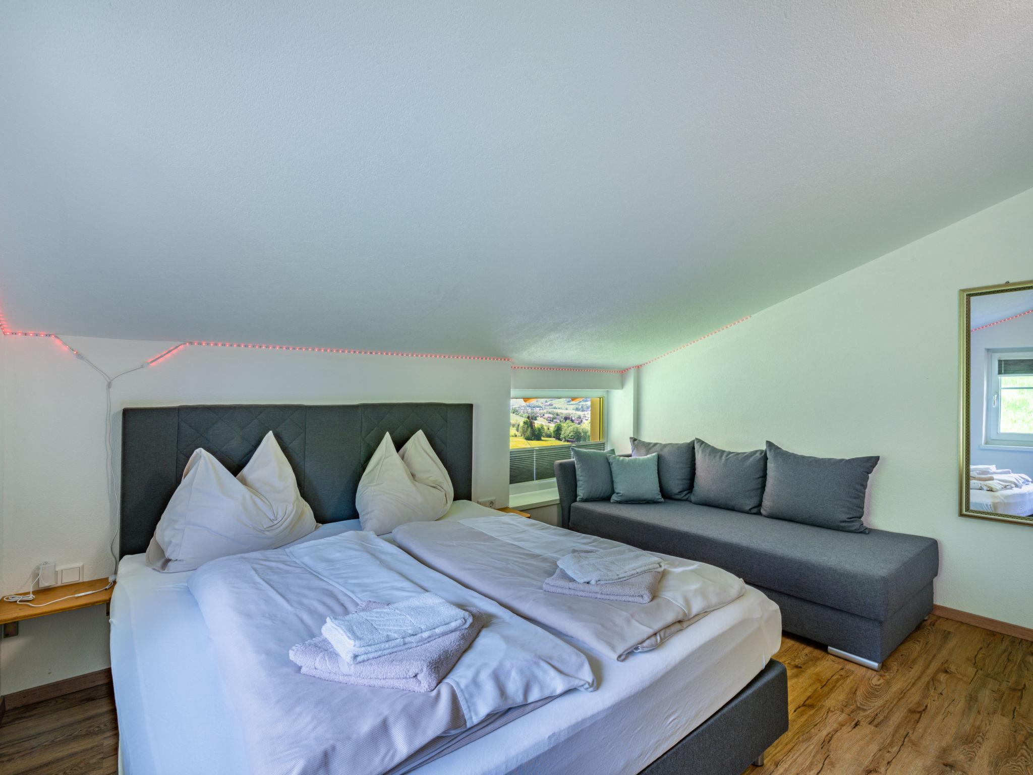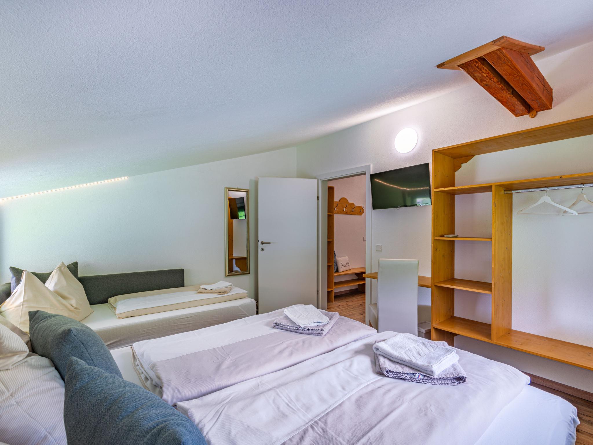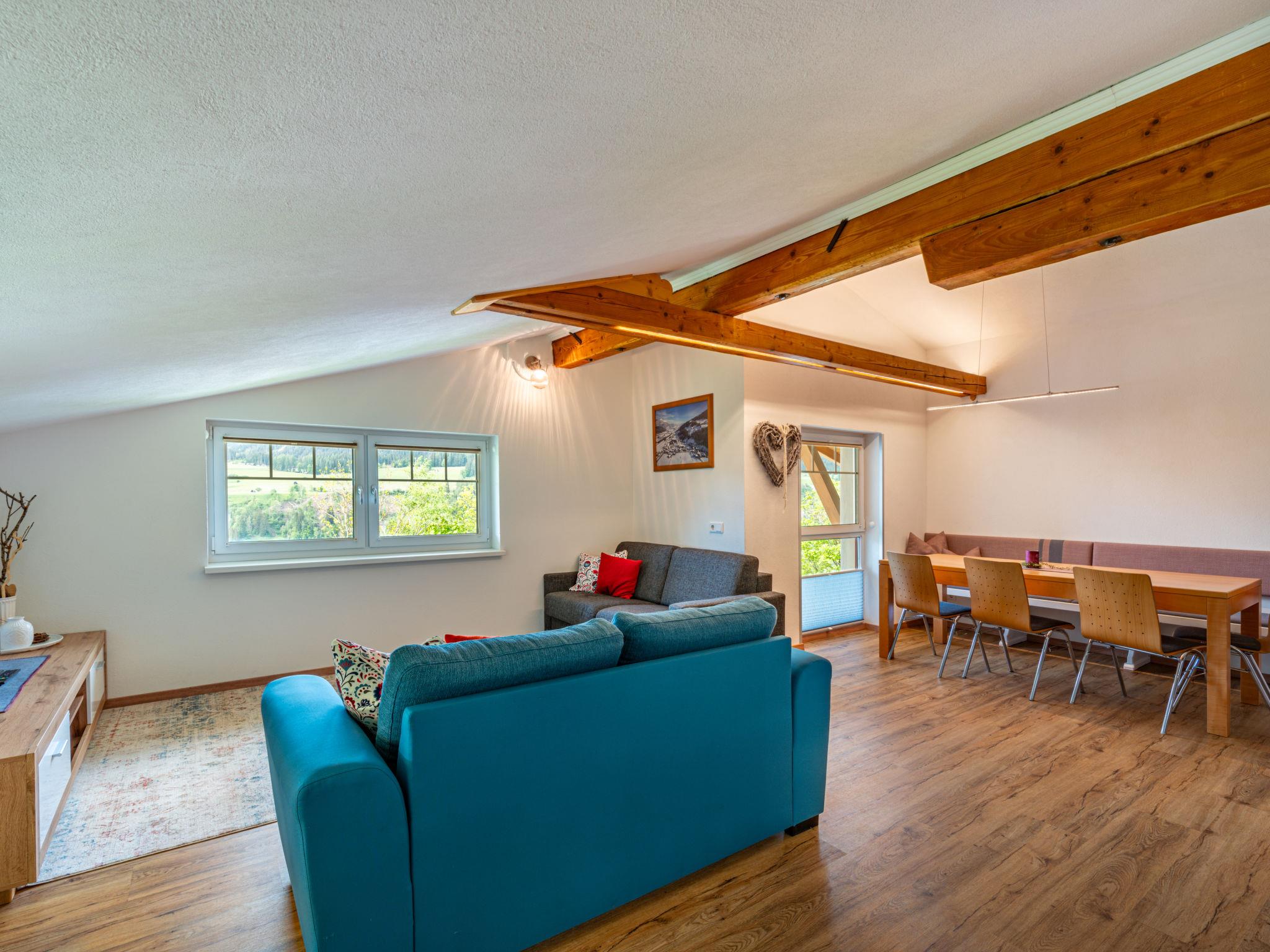 "Mawa", 3-room apartment 106 m2, on the top floor. Object suitable for 6 adults + 2 children. Partly with sloping ceilings, cosy furnishings: living/sleeping room with 1 double sofabed, dining table, satellite TV and international TV channels (flat screen). 2 rooms, each room with 1 sofabed, 1 double bed, satellite TV and international TV channels (flat screen). Open kitchen (oven, dishwasher, 4 ceramic glass hob hotplates, toaster, kettle, electric coffee machine). Shower, sep. WC, double hand-basin. Heating. Parquet floors. Beautiful panoramic view of the mountains and the valley. Facilities: Internet (WiFi, free). Please note: non-smokers only. Note: Access via external spiral staircase or internally.