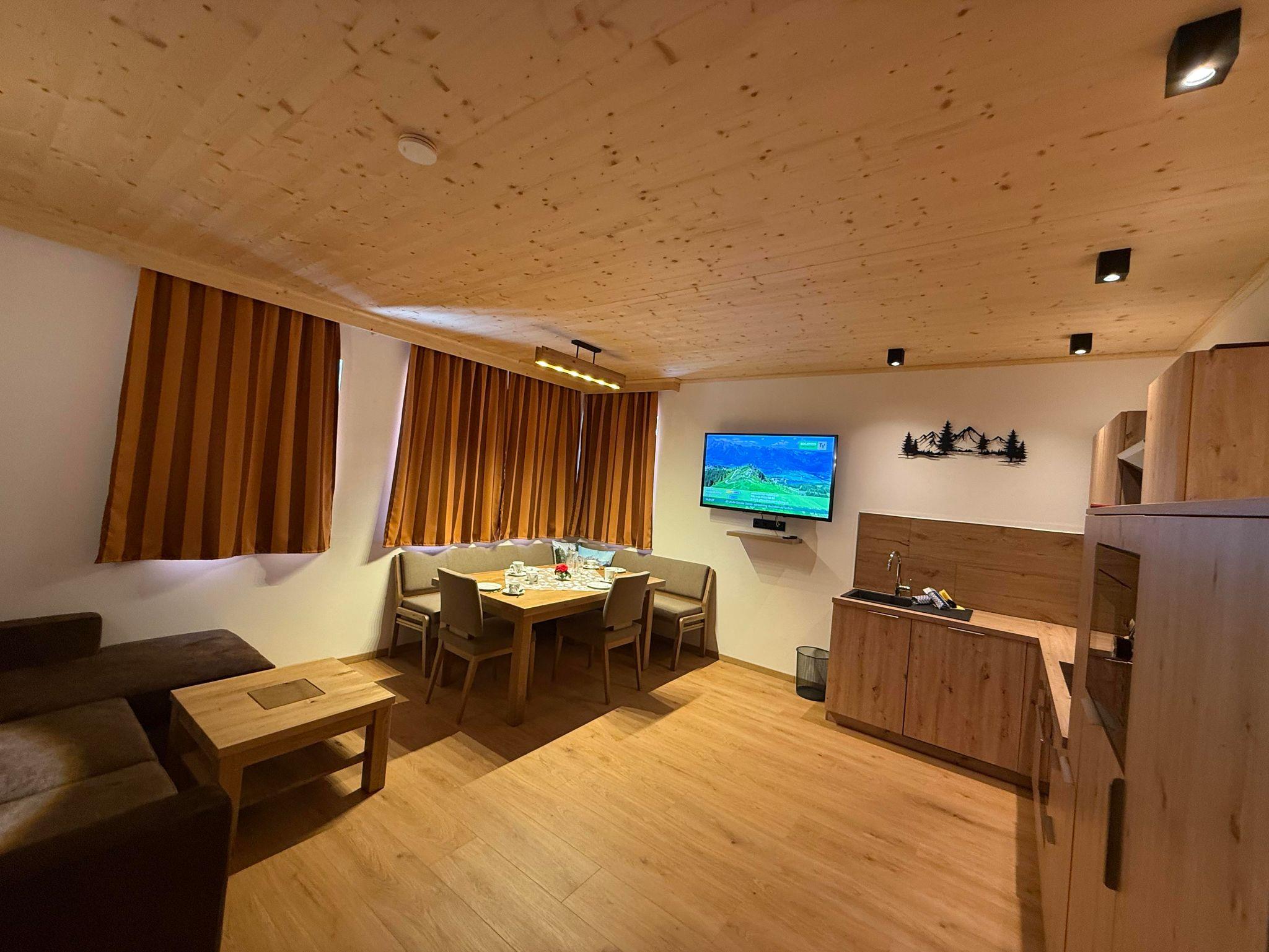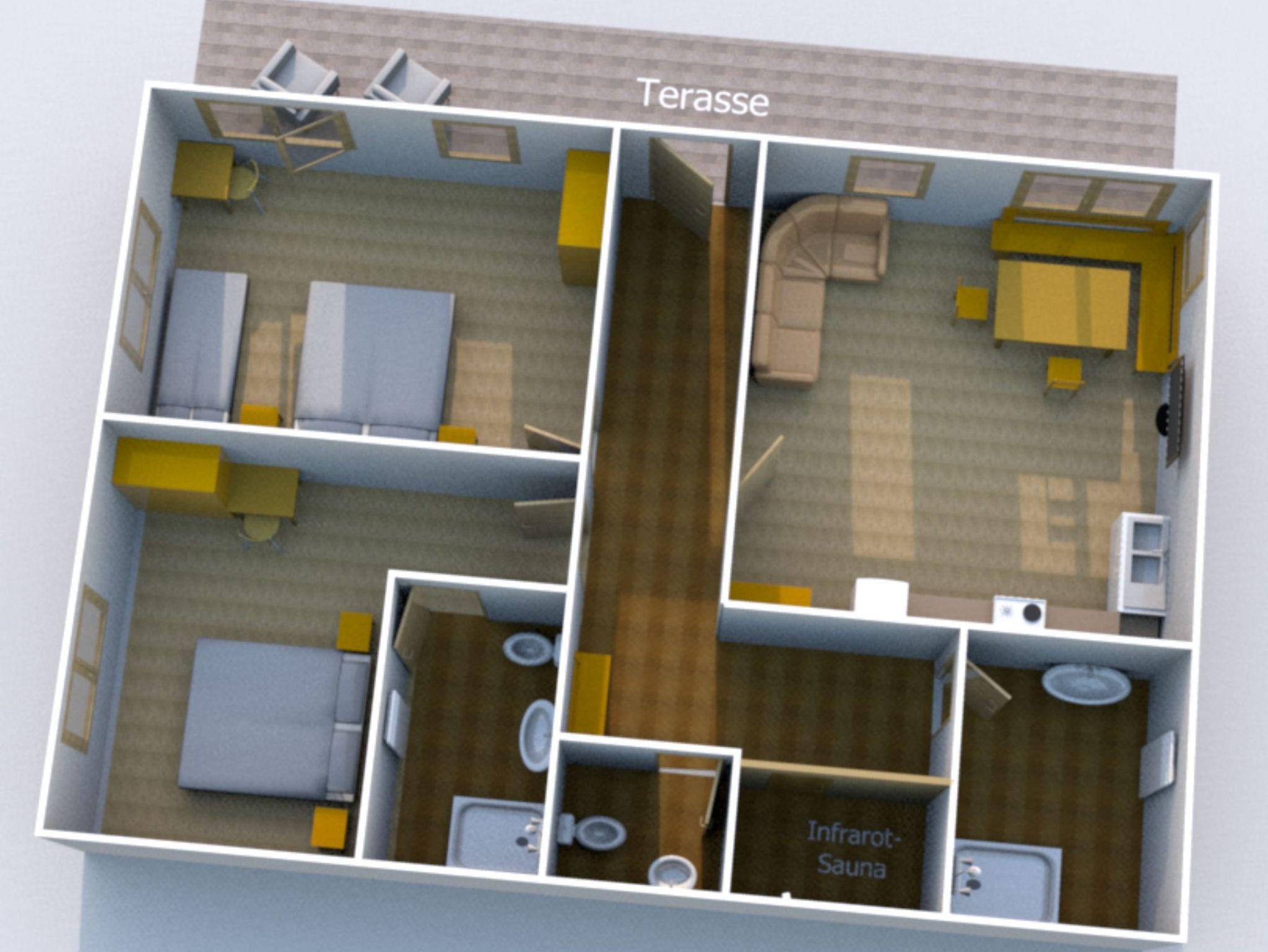 Wohnung Eiche: Eingerichtet mit edlem Eichenholz, bietet diese Wohnung ebenfalls eine vollausgestattete Küche mit Sitzecke, zwei getrennte Schlafzimmer und zwei Bäder für zusätzlichen Komfort. Eine gemütliche Terrasse lädt zum Verweilen im Freien ein. Für ein Wellness-Erlebnis sorgt die Infrarot-Sauna.