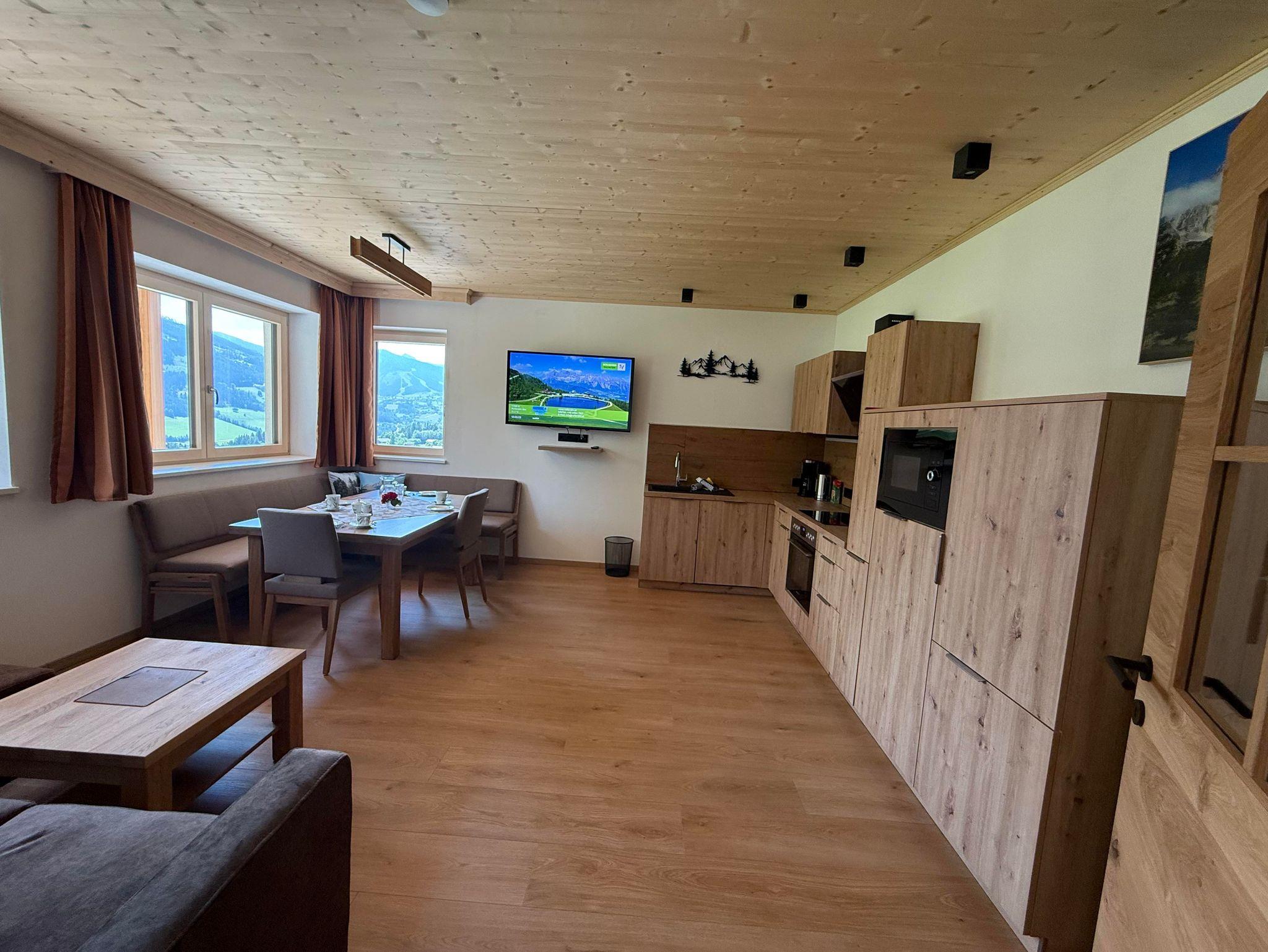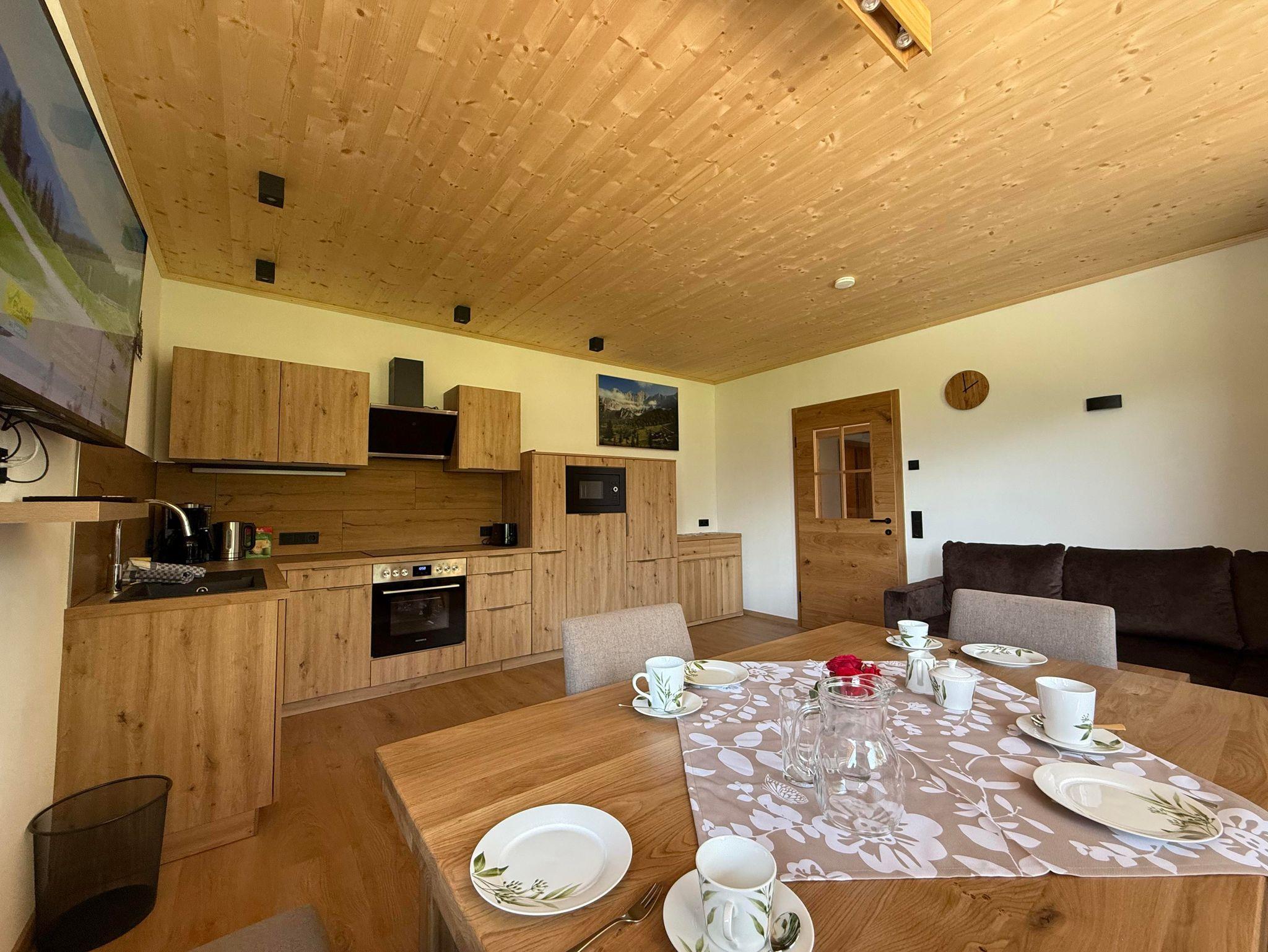 Wohnung Fichte: Diese Wohnung ist liebevoll mit Fichtenholz eingerichtet und verfügt über eine vollausgestattete Küche mit einer gemütlichen Sitzecke; zwei separate Schlafzimmer, jedes mit eigenem Bad; ein zusätzliches separates WC; einen barrierefreier Zugang, einen Balkon mit atemberaubendem Fernblick und eine eigene Infrarot-Sauna.