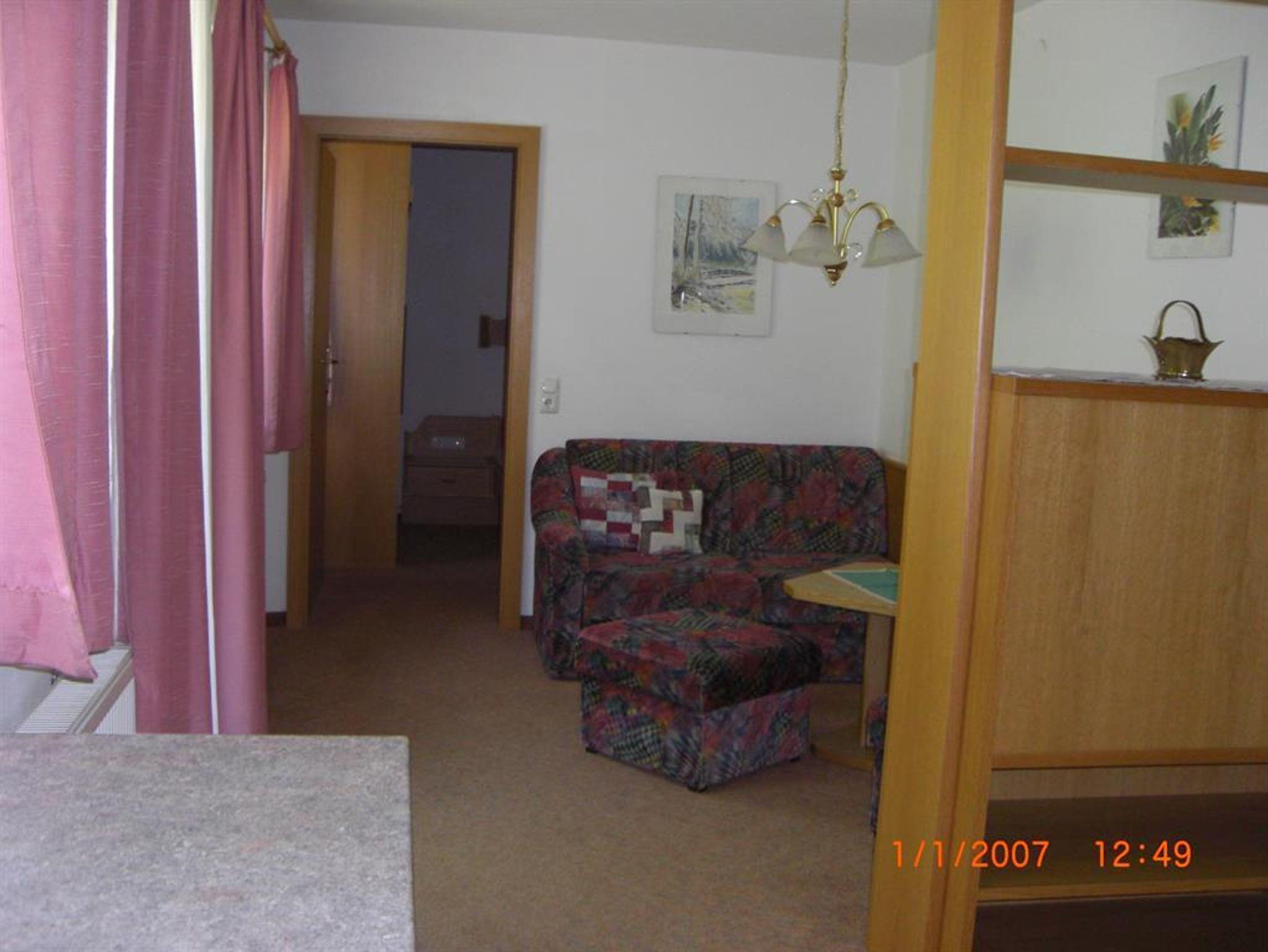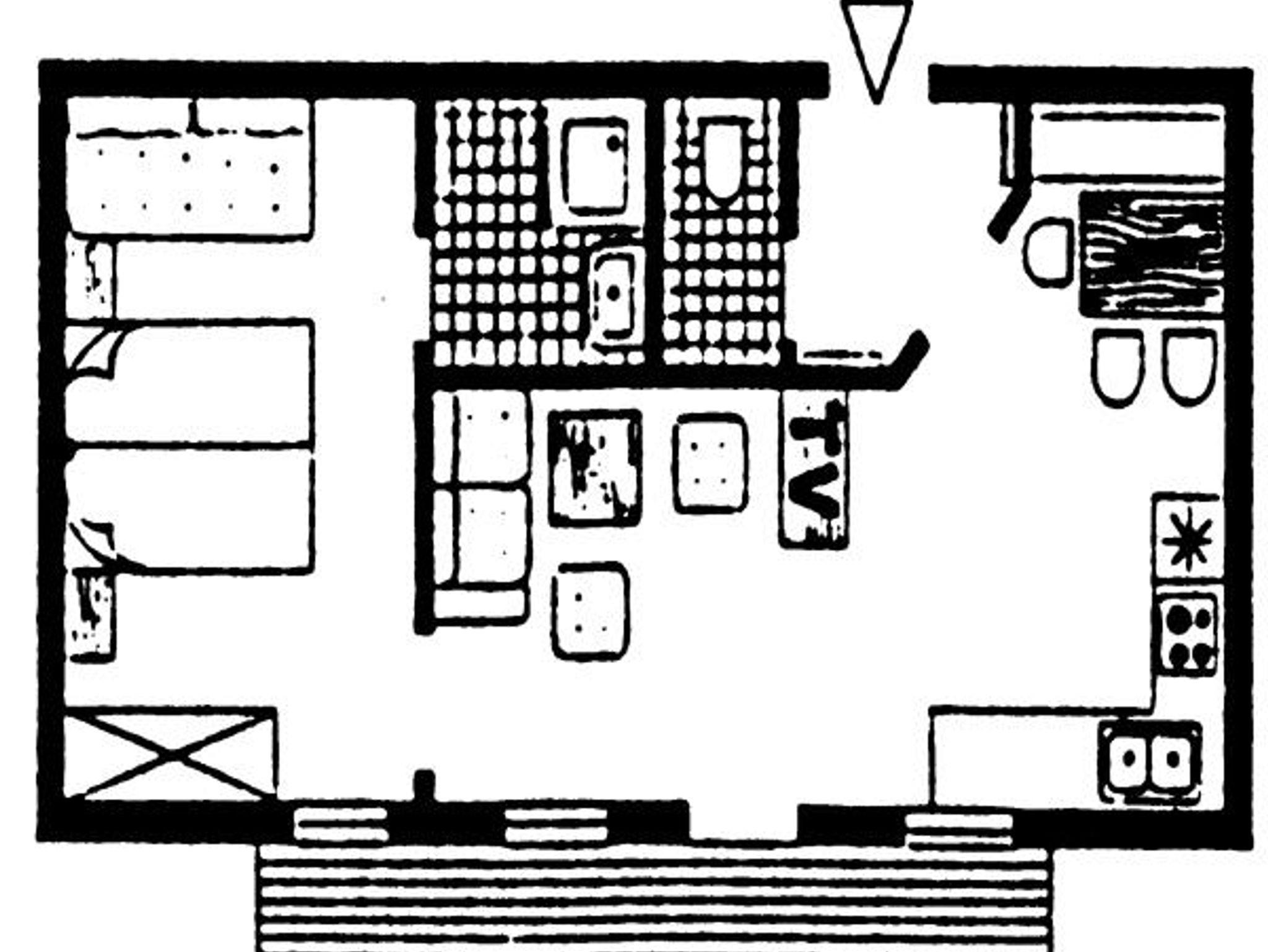 Küche mit gemütlicher Essecke, Raumteiler zur Wohnecke mit ausziehbarer Couch, Schlafzimmer mit Liegesofa, Dusche, Wc extra, großer Südbalkon