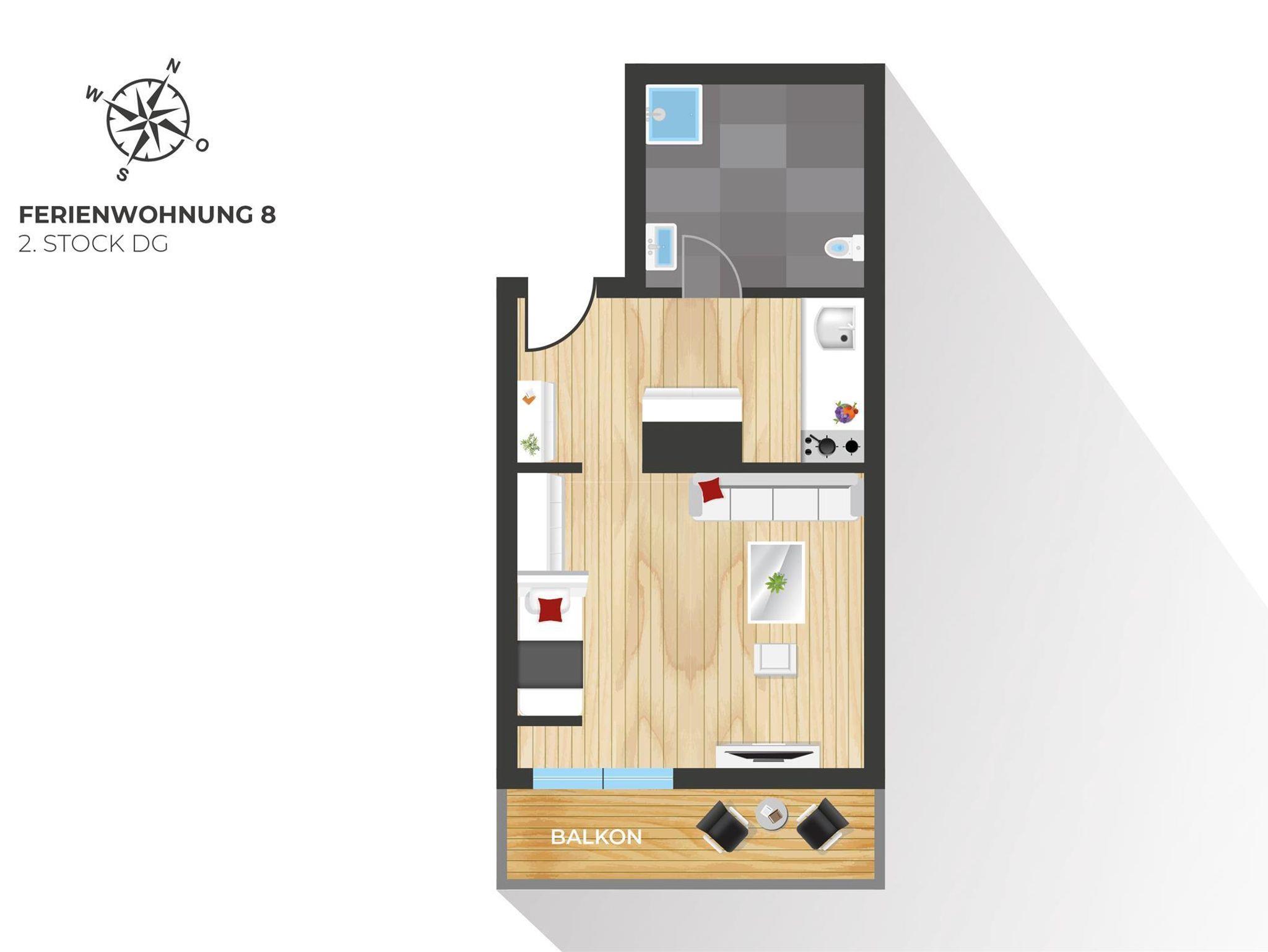 Ferienwohnung TYP 8, 30qm für 1 Person, Wohn/Schlafraum mit einem Einzelbett (90X190) und Sofa, Kochnische, Dusche/WC, SAT-TV, Safe, W-LAN, Radio und Balkon.