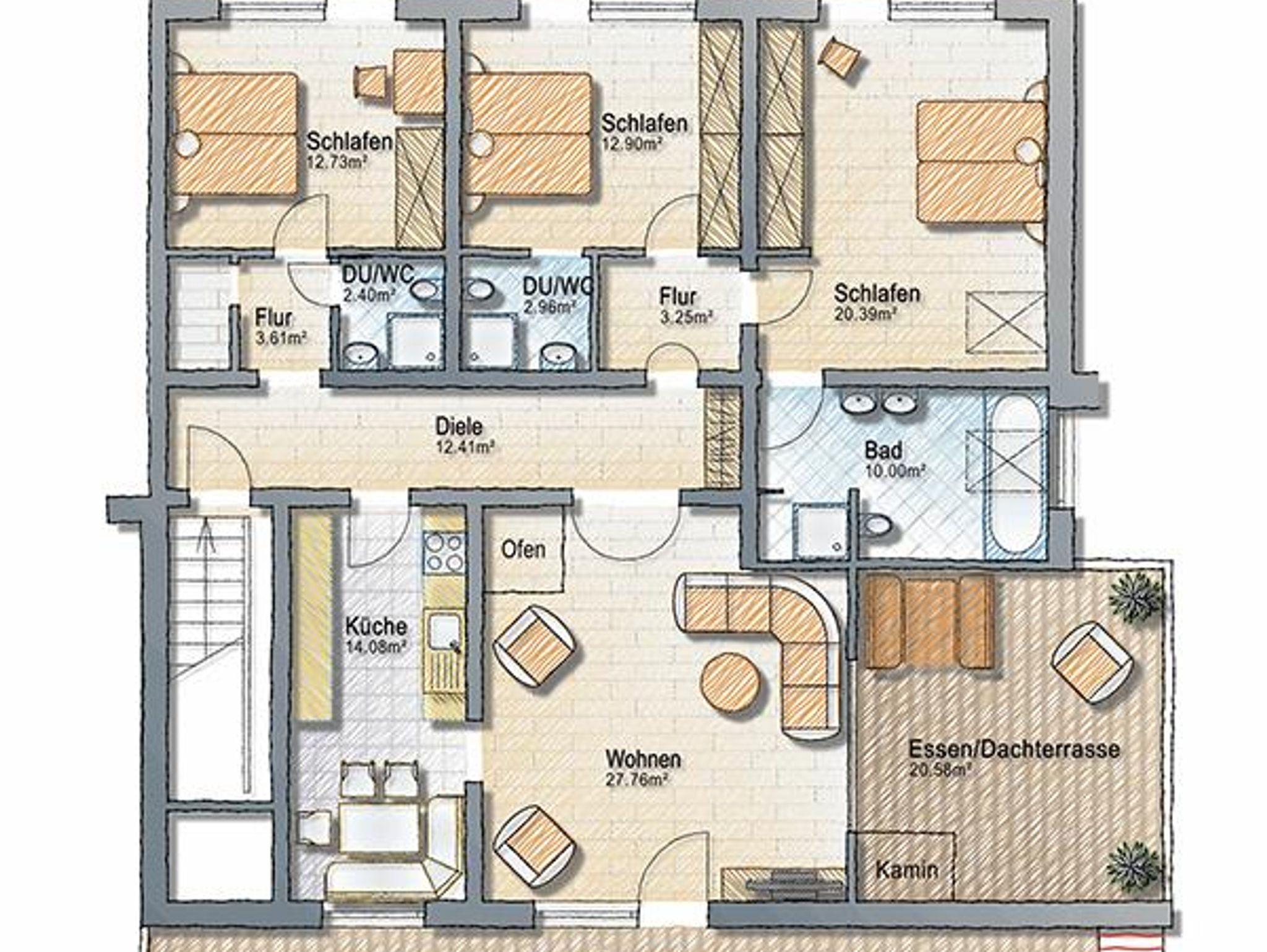 • 2 Duschbäder mit Fön, Kosmetikspiegel + WC, 1 gr. Bad mit Dusche, Badewanne, Doppelwaschbecken, Fön, Kosmetikspiegel + WC