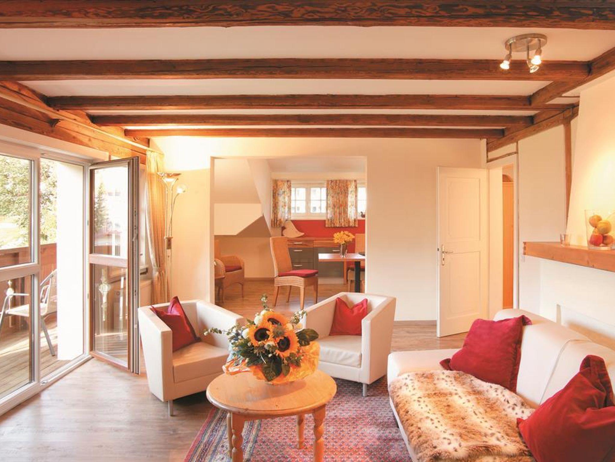 3-Raum-Ferienwohnungen im Landhausstil eingerichtet mit zwei Schlafzimmer, einem Wohnzimmer mit Küchenzeile, Bad, WC, Balkon, TV, Safe, Parkplatz. Auf Wunsch im Haupthaus Verwöhnhotel Walserhof Frühstück oder Halbpension buchbar. Einmalige Endreinigungsgebühr.