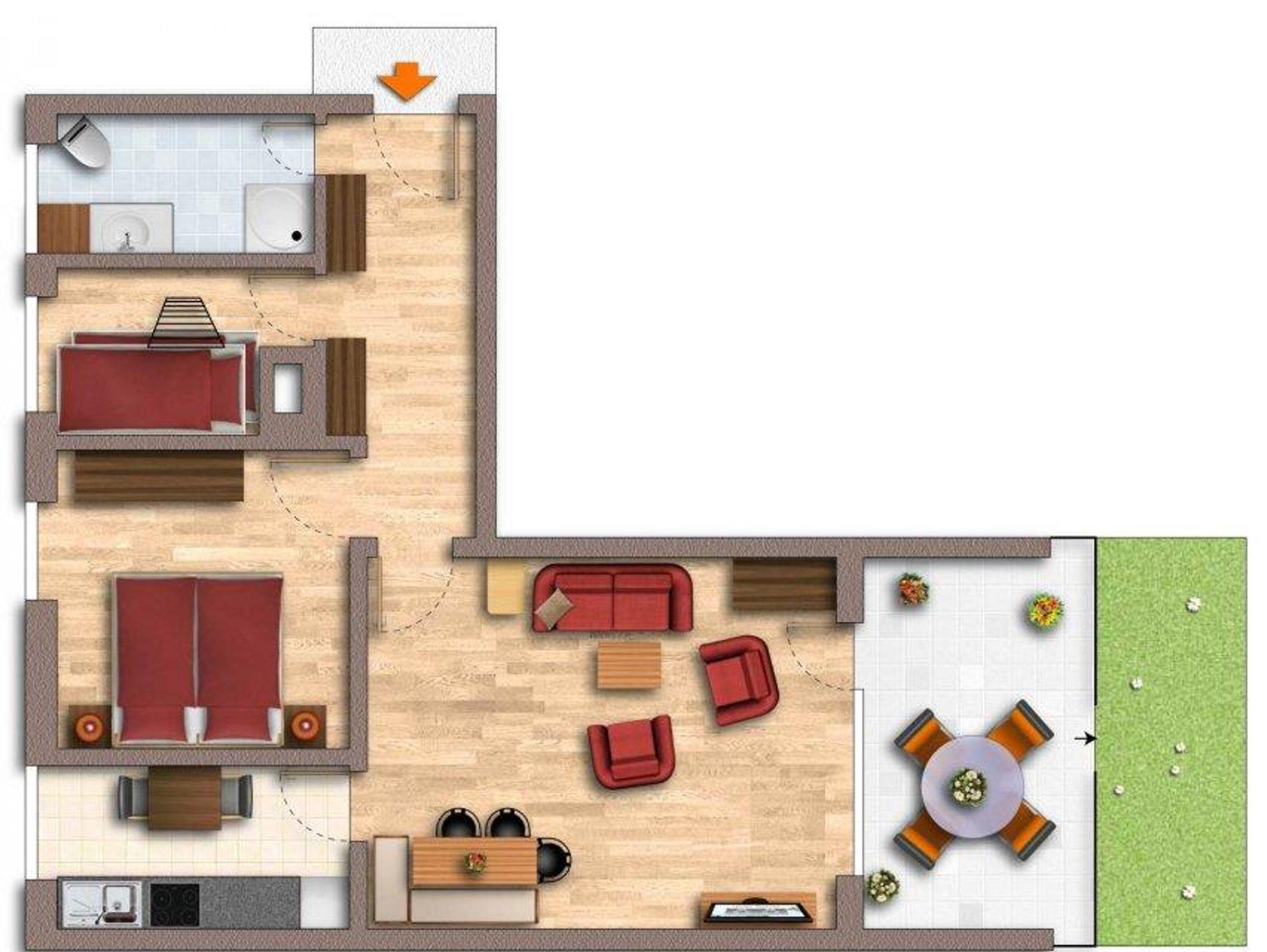 Die Erdgeschosswohnung verfügt über 2 Schlafzimmer - 1 mal Doppelbett und 1 mal Stockbett, Wohn / Esszimmer, Dusche / WC, Südbalkon mit Gartenmöbel sowie eine große Liegewiese. Die separate Küche ist mit einem Kühl/Gefrierschrank, Induktionskochfeld, Backofen, Spühlmaschine, Filterkaffeemaschine Filter 1x4, Nespressomaschine, Wasserkocher, Toaster, uvm. ausgestattet. Technische Einrichtungen wie Flatscreen TV, Bluetooth Musikanlage sind vorhanden.