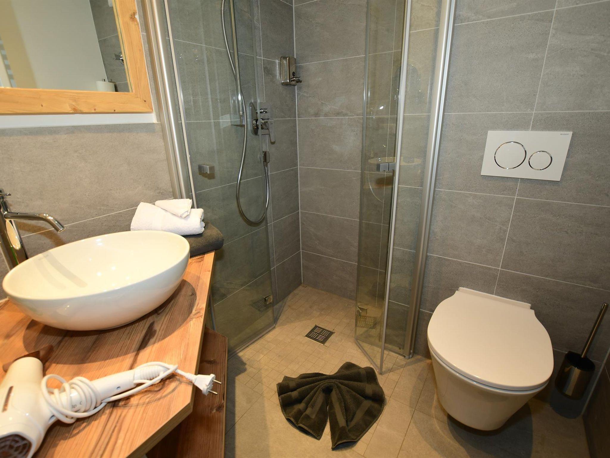 • Ebenerdiges Duschbad mit Fön und Kosmetikspiegel, Dusch- u. Toilettenartikel