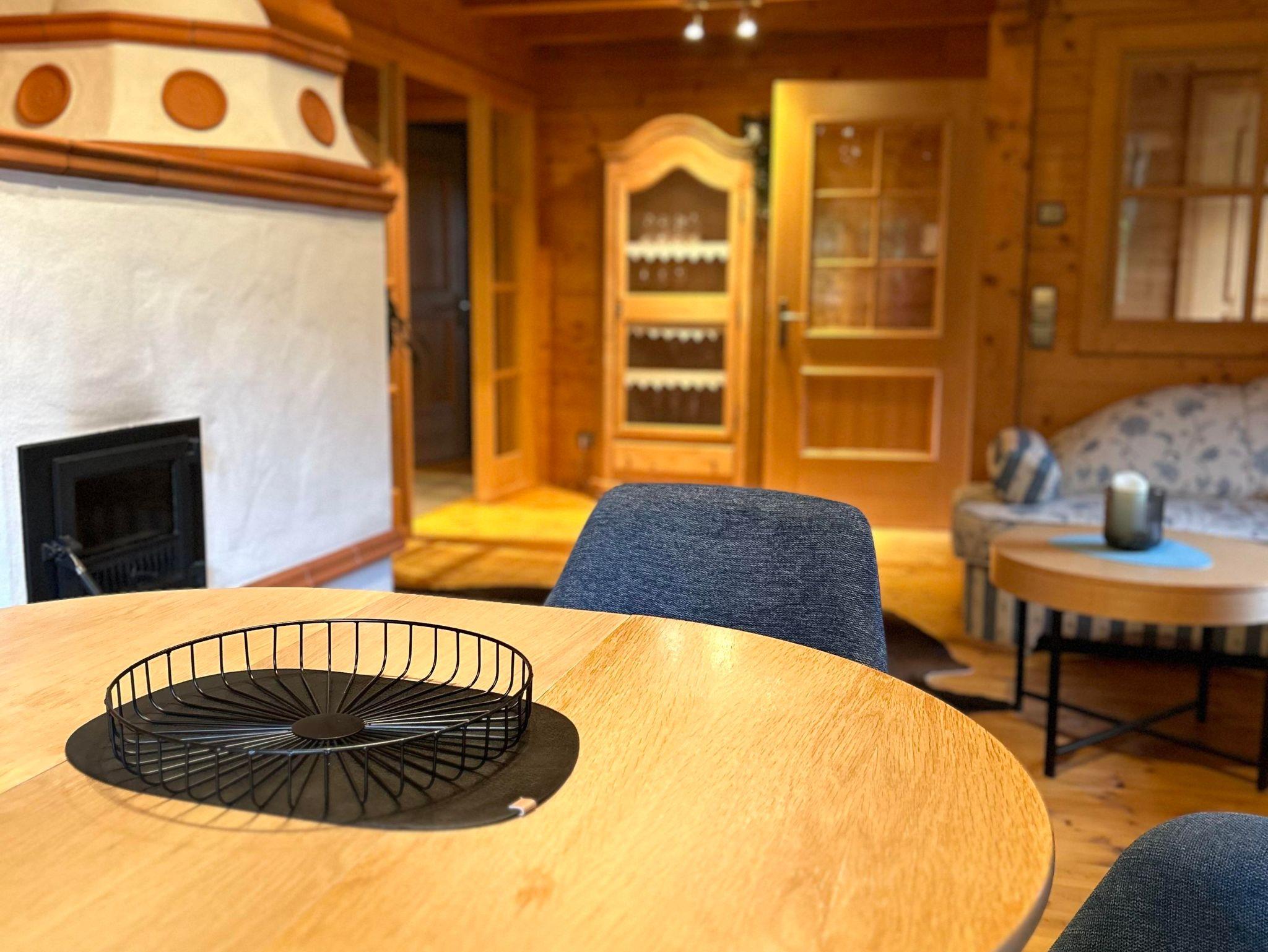 Großer Wohnbereich mit Couch, Sitzgelegenheit und als Highlight einen Kachelofen