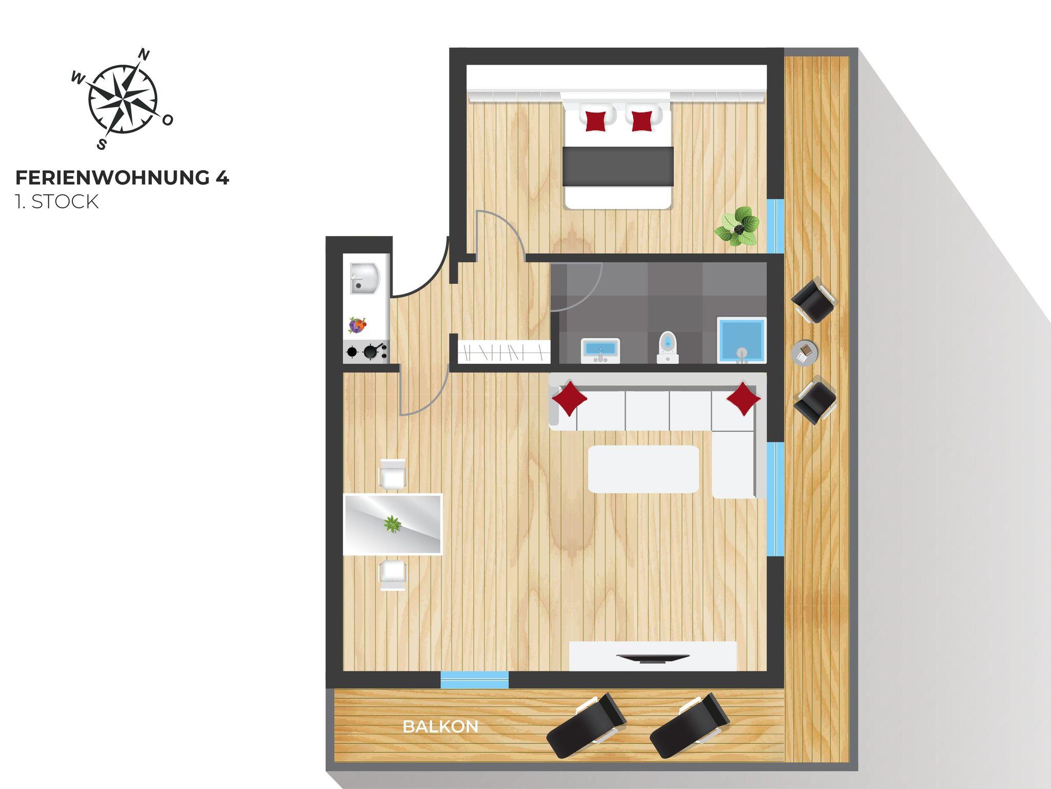 Ferienwohnung Typ 4, 40qm für 2 Personen, Wohnraum mit Sofa, separates Schlafzimmer (Doppelbett), Kochnische, Dusche/WC, Sat-TV, Safe, W-LAN, Radio und Balkon.